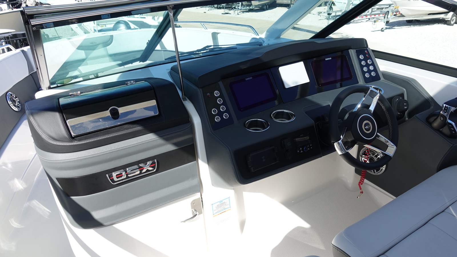 The Chaparral 280 OSX is loaded with premium features designed to enhance your boating experience. The standard fiberglass hardtop with a white frame not only adds to the boat’s striking appearance but also provides ample shade and protection from the elements. The hardtop’s underside is finished in Ice Blue, complementing the hull and adding a custom touch to the overall aesthetic. For those sunny days on the water, the Bow Canvas Sky Shade in white offers additional comfort, while the bow and cockpit covers help protect your investment when the boat is not in use.The cockpit interior, finished in Lunar, provides a plush and inviting space for relaxation and socializing. The canvas color is black (if equipped), adding a sleek contrast to the lighter tones throughout the boat. The Premium Package elevates the 280 OSX even further, featuring docking lights for improved visibility, a bow scuff plate for added protection, four fender holders for convenient storage, and an air pump for inflatables or water toys.