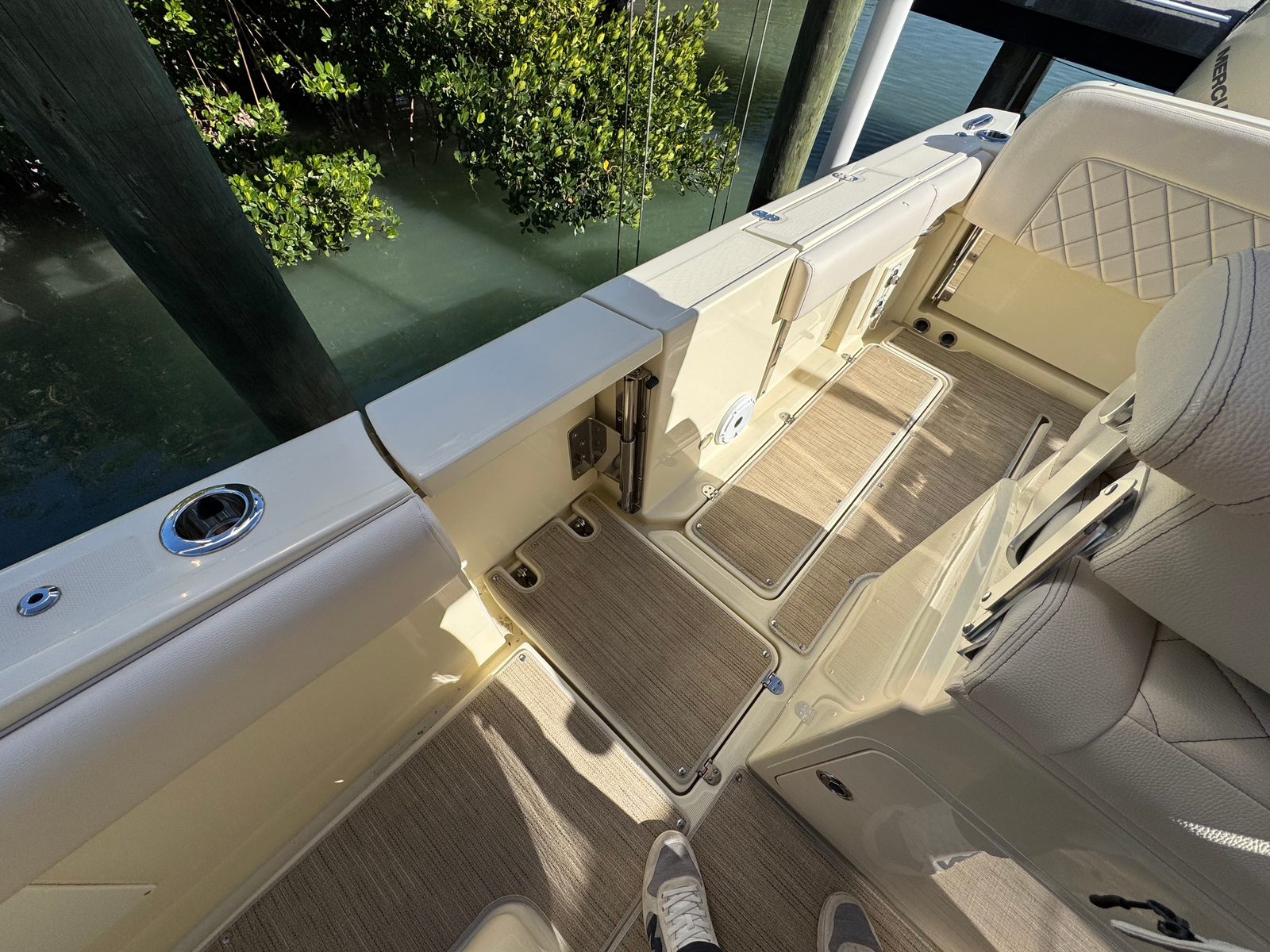 The expansive open bow offers dual forward-facing chaise loungers, as well as lavish wraparound bow seating. Convenience abounds with sealed, fully finished storage lockers in-floor and under the seats, plus well-placed cupholders for entertaining ease.