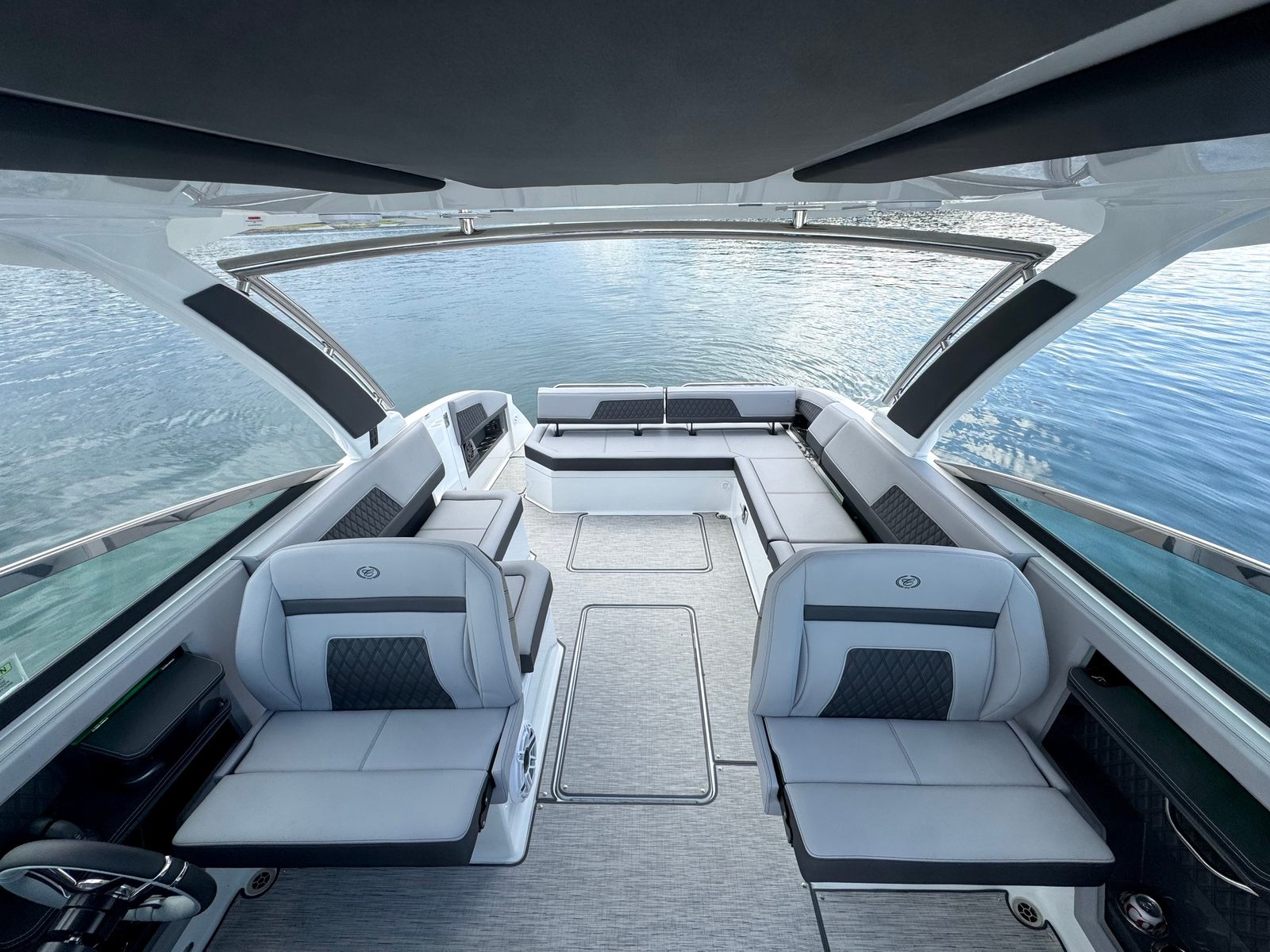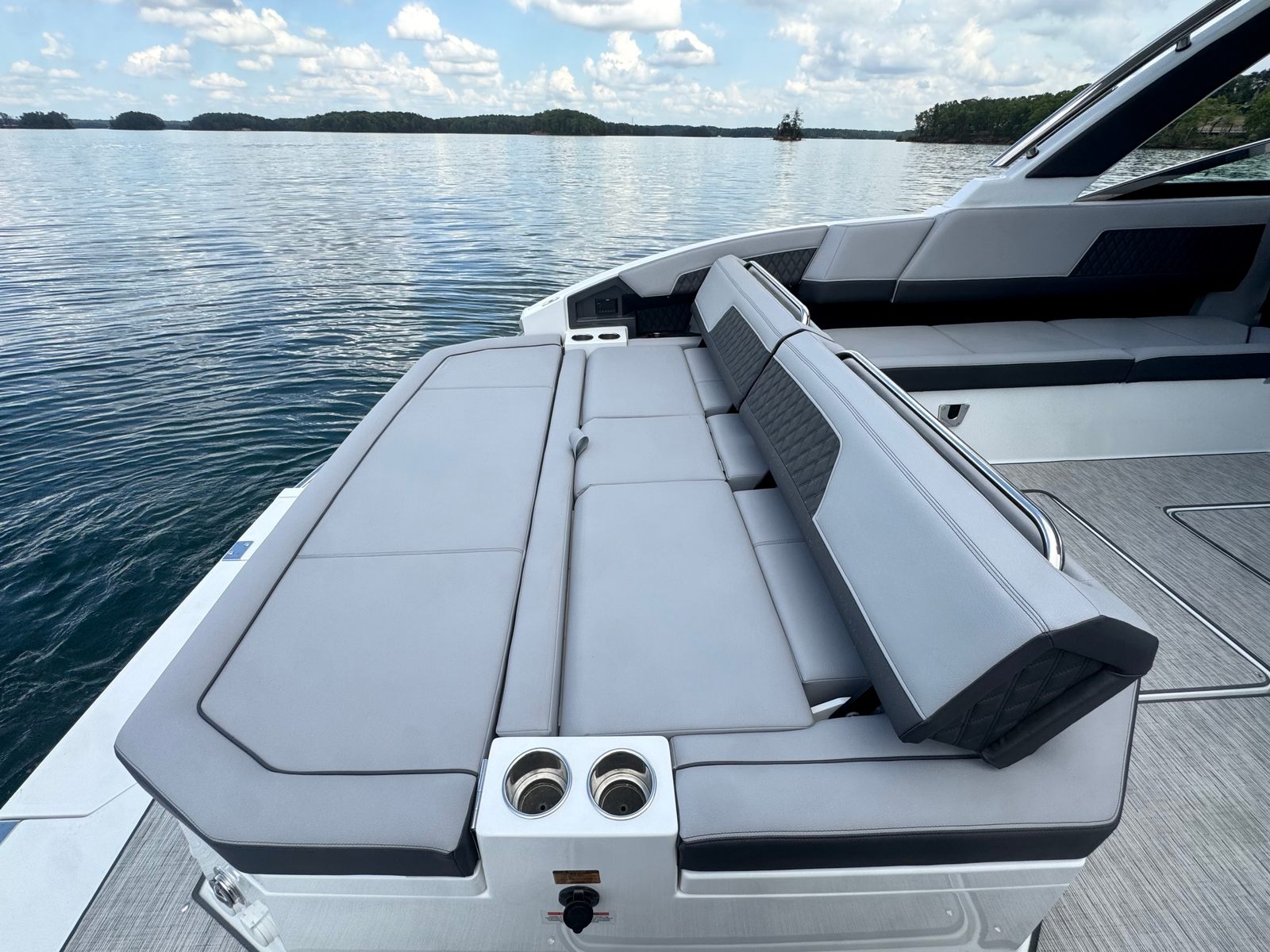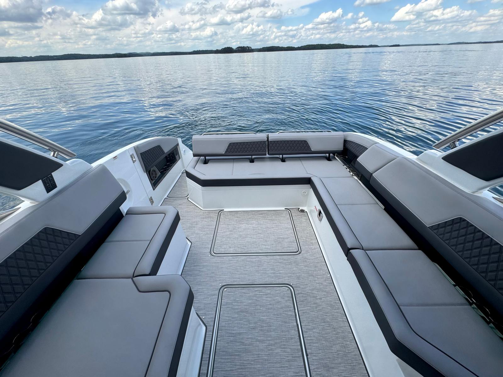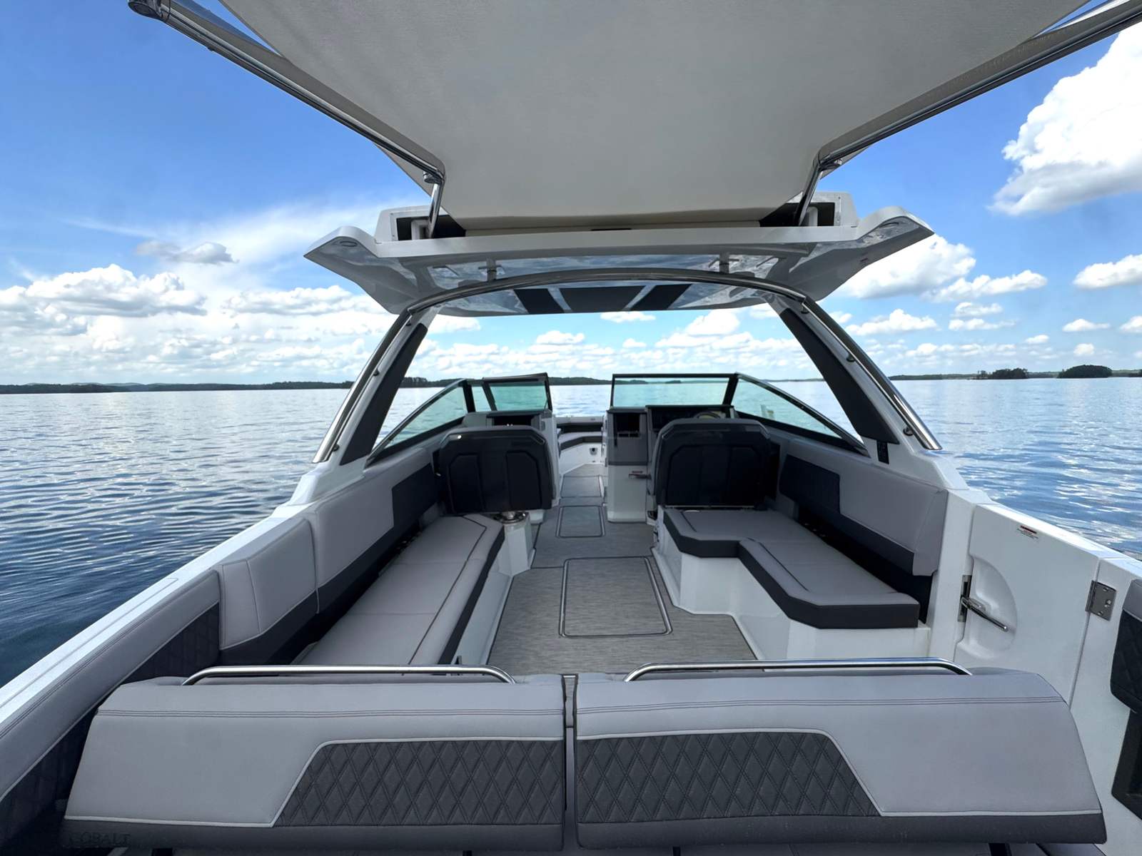 Powered by twin Volvo V8 350CE DP engines delivering 700 horsepower, the R33 offers smooth cruising, thrilling acceleration, and precise handling. Advanced joystick control and a hydraulic swim platform make docking, launching water toys, and maneuvering effortless.