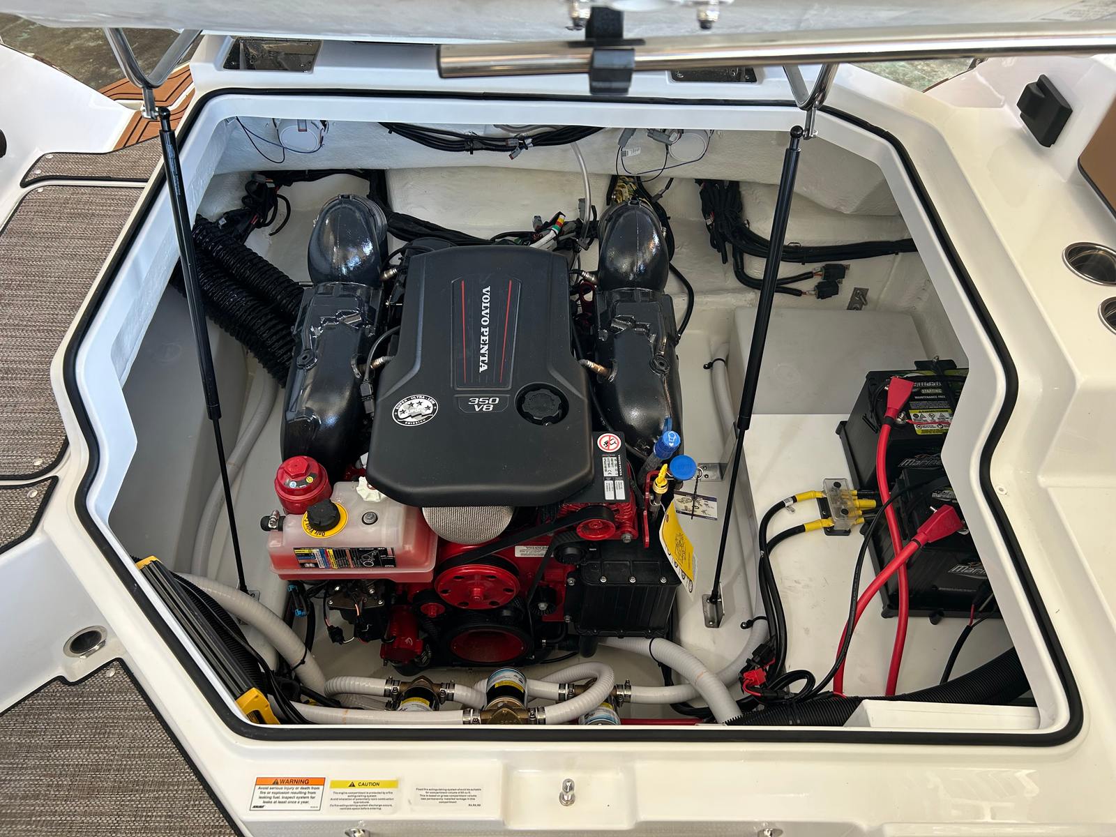 The Cobalt R4 Surf is as practical as it is luxurious. The battery maintainer/charger keeps your systems powered and ready, reducing maintenance hassles and maximizing your time on the water. Fender clips with line simplify the docking process, making it easy to secure your boat quickly and safely. The stainless steel docking lights improve visibility during low-light conditions, adding an extra layer of safety and convenience.The folding electric arch with bimini provides flexible shade options, allowing you to adapt to changing weather conditions with ease. The seagrass floor covering is not only stylish but also easy to clean and maintain, ensuring your boat stays looking its best season after season. The dual Volvo 8610 glass cockpit displays put all essential controls and navigation information at your fingertips, streamlining operation and enhancing your confidence as captain.