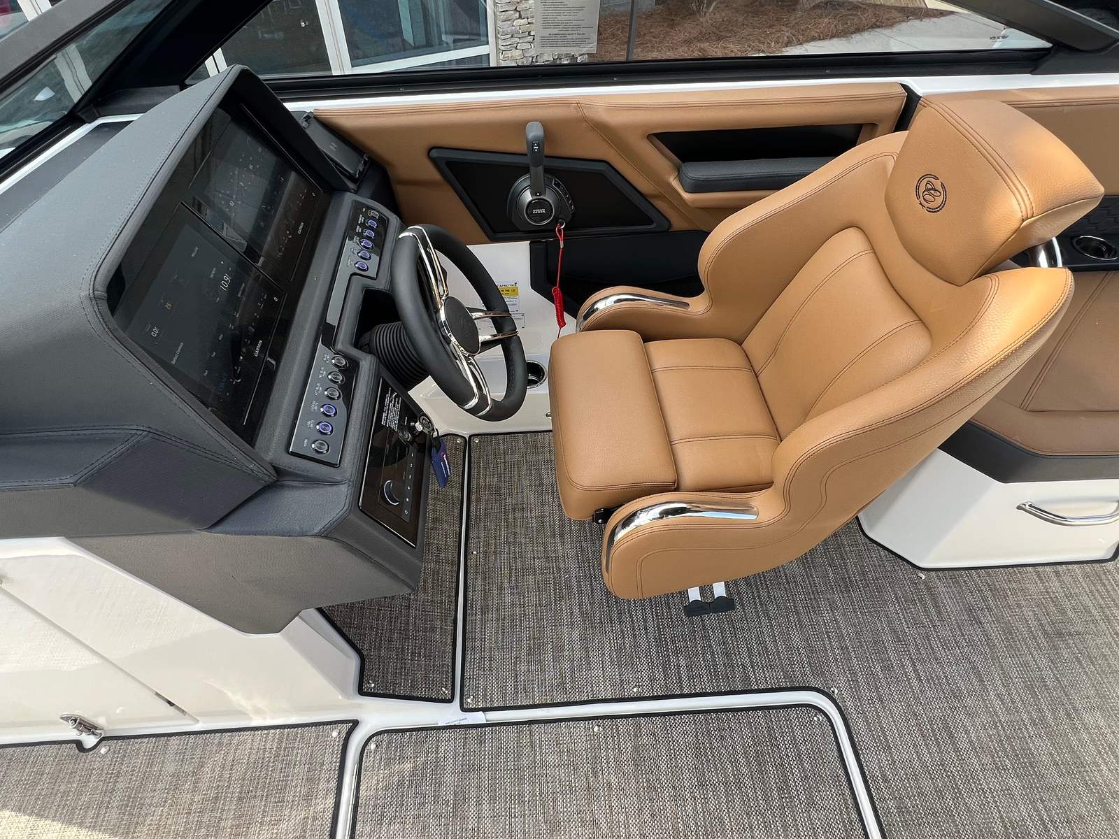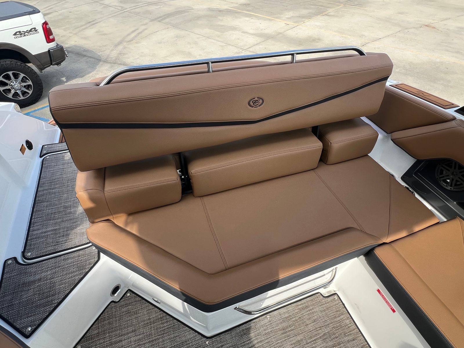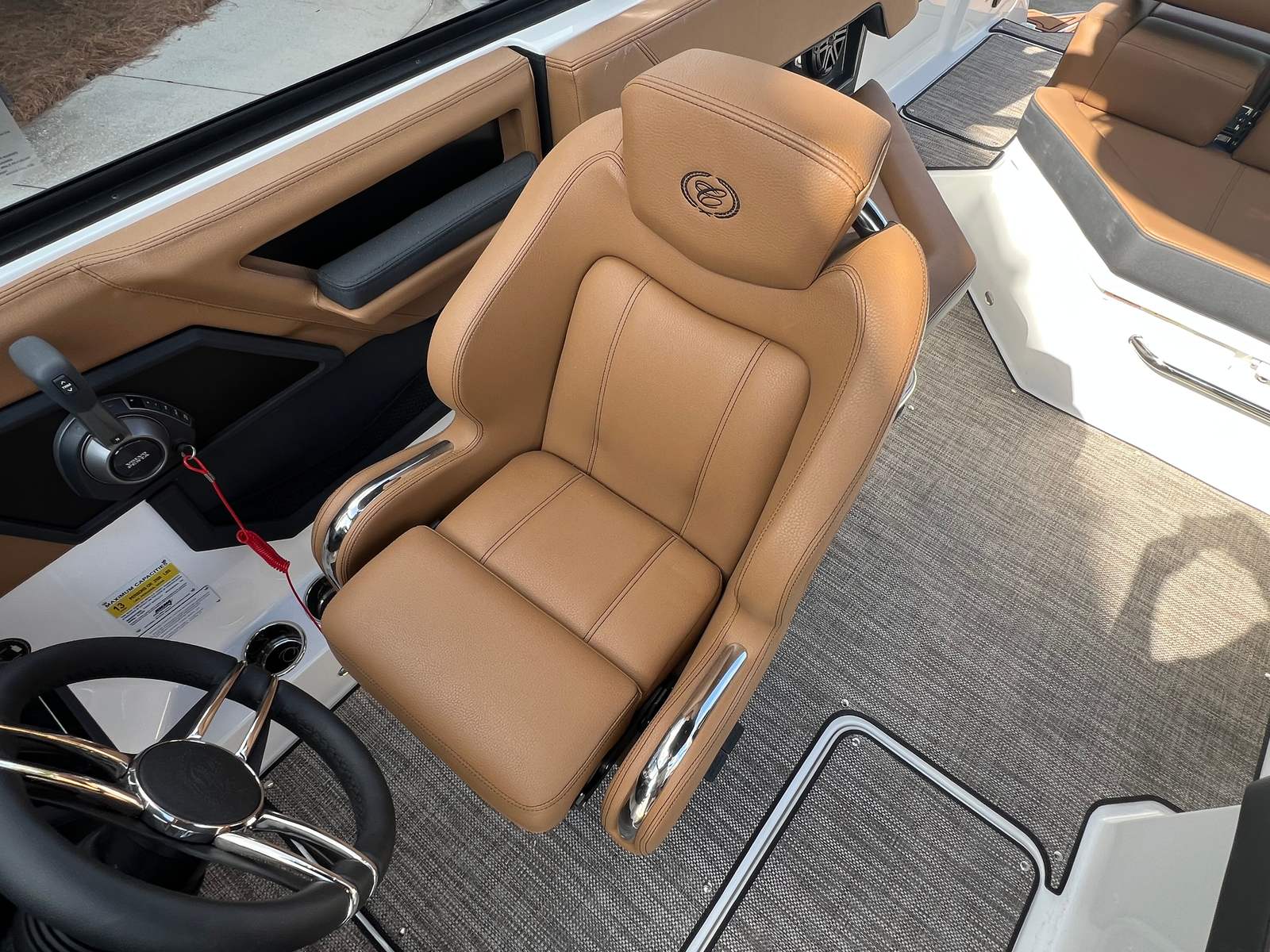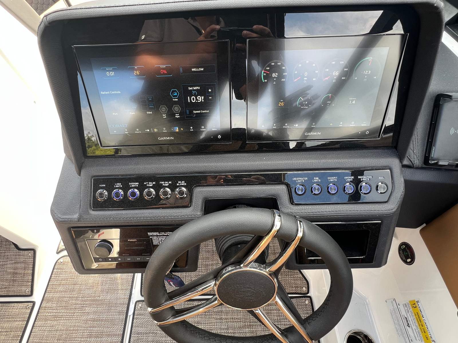 The 2026 Cobalt R4 Surf is packed with special features that enhance both its aesthetic appeal and functional capabilities. The Volvo V8 350CE DP engine is complemented by a sophisticated Glass Cockpit with dual Volvo 8610 displays, providing intuitive control and real-time information at your fingertips. The aft-facing rumble seat offers a unique vantage point for relaxing or socializing, while the caramel, carbon, and ebony interior creates a warm and inviting atmosphere.Practical touches like the battery maintainer/charger (110V) ensure your boat is always ready for action, and the stainless steel docking lights make nighttime arrivals and departures safe and stylish. Fender clips with line (four included) simplify the docking process, and the floor covering in seagrass raw umber adds both comfort and durability underfoot. The hull bottom in ebony and Cobalt letters in white satin complete the look, giving the R4 Surf a distinctive and elegant presence on the water.