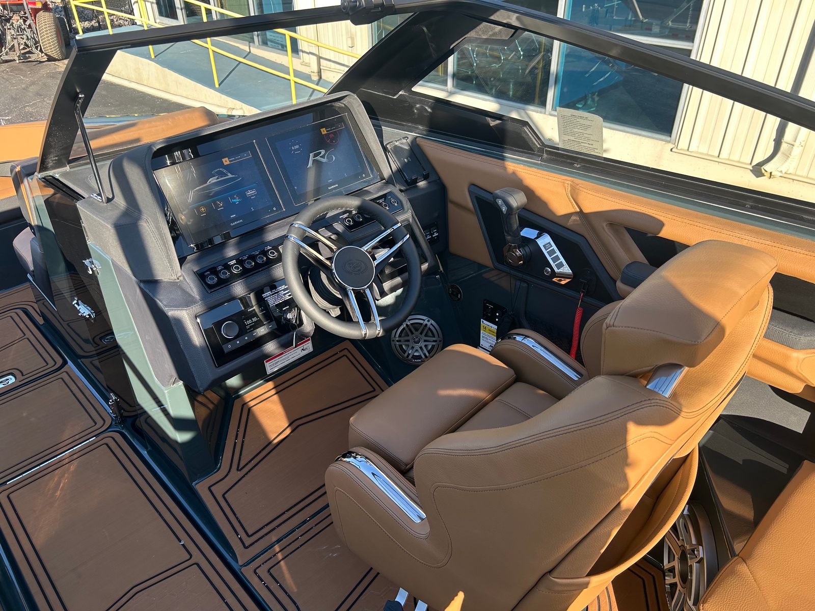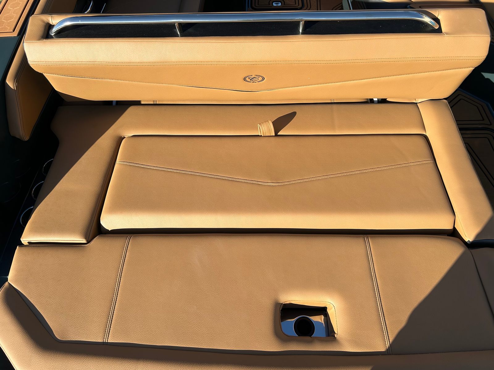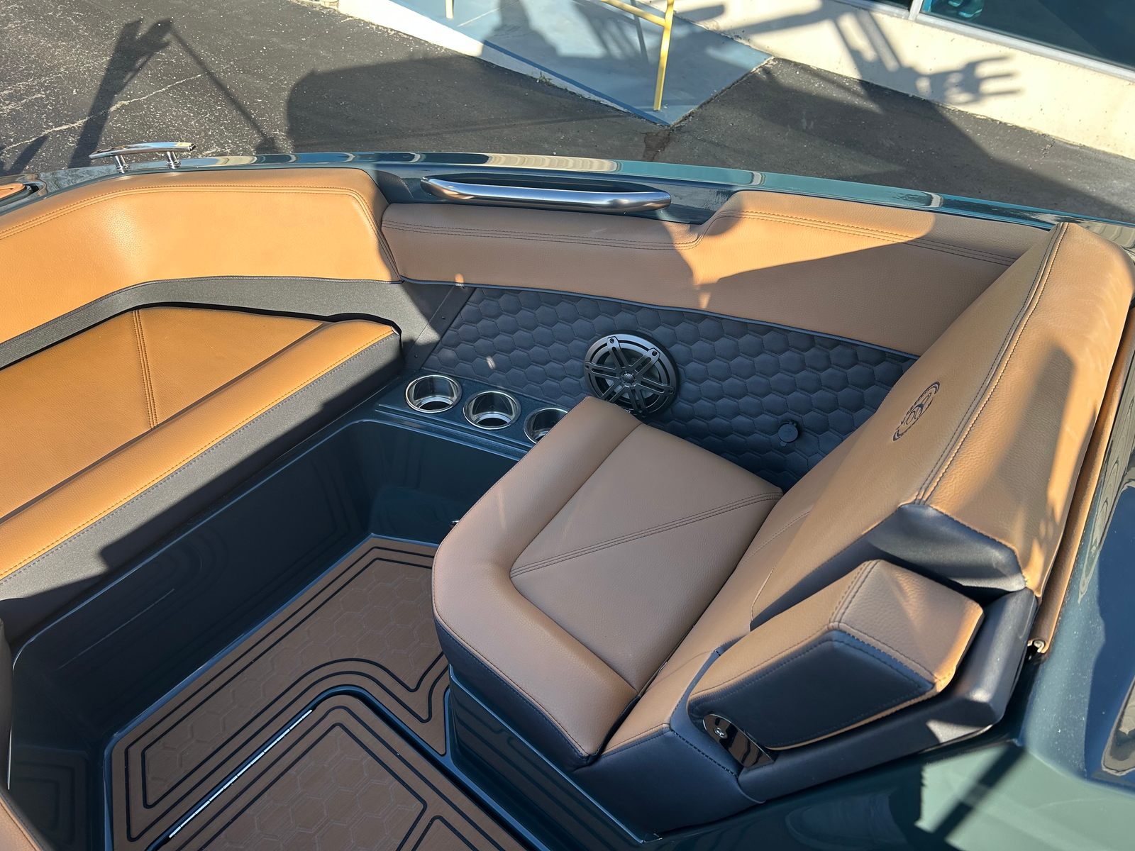 The Cobalt R6 Surf is packed with premium features designed to enhance your boating experience. The Upper Surf Accent and Surf Mid Hull Side in Deep Teal, paired with the Accent Stripe in Rich Ebony and Hull Bottom in Deep Teal, create a striking visual statement. The interior, finished in Caramel, Carbon, and Ebony, offers both comfort and style, making every journey a pleasure.Special features include a Battery Maintainer/Charger, ensuring your boat is always ready for adventure, and Cobalt Letters in Black Satin for a touch of elegance. Stainless Steel Docking Lights provide enhanced visibility during evening outings, while the Electric Arch Prisma Black with Bimini in Ebony offers shade and protection from the sun. These thoughtful additions set the R6 Surf apart from other bowrider boats for sale, making it a standout choice for discerning buyers.