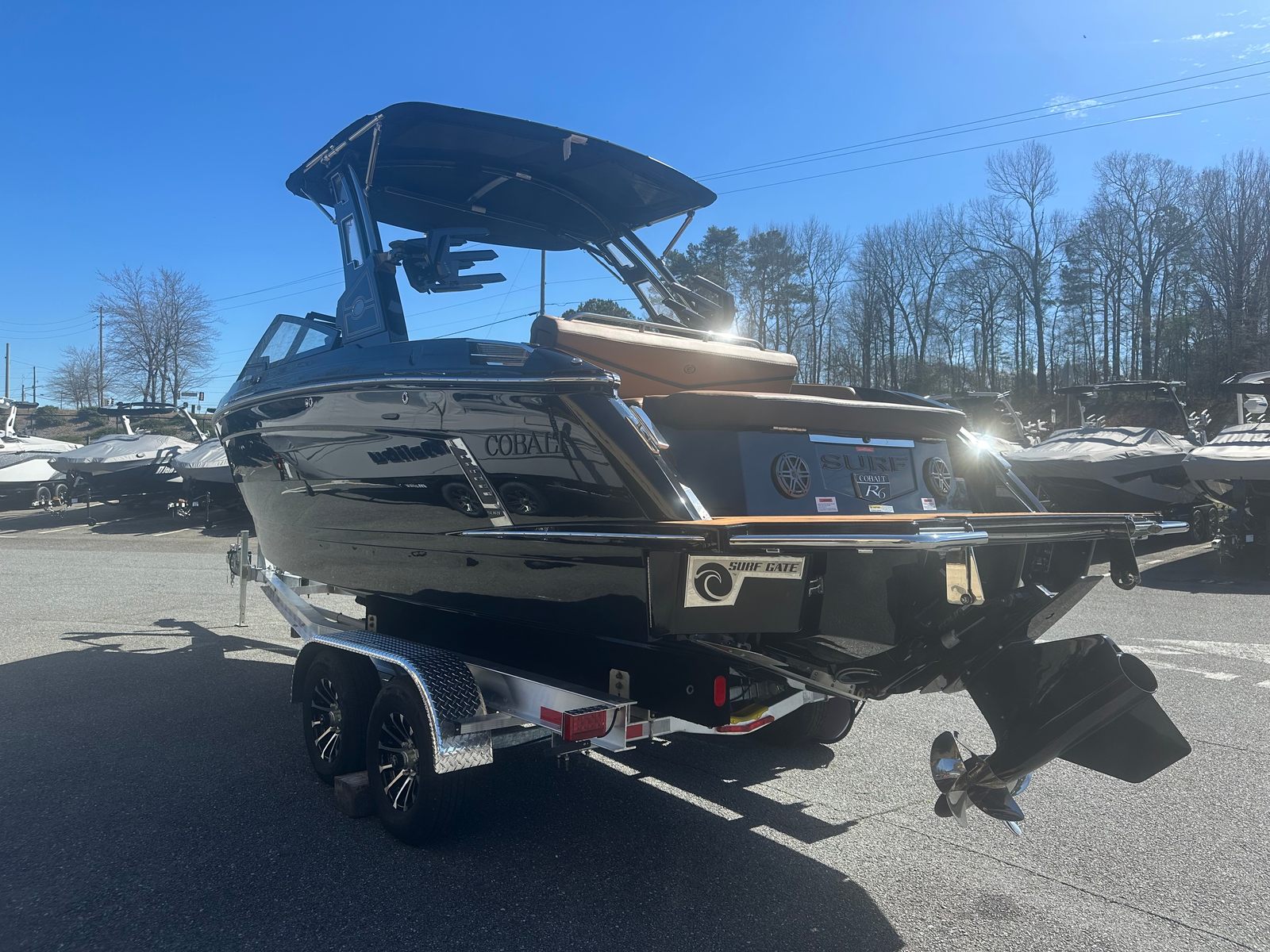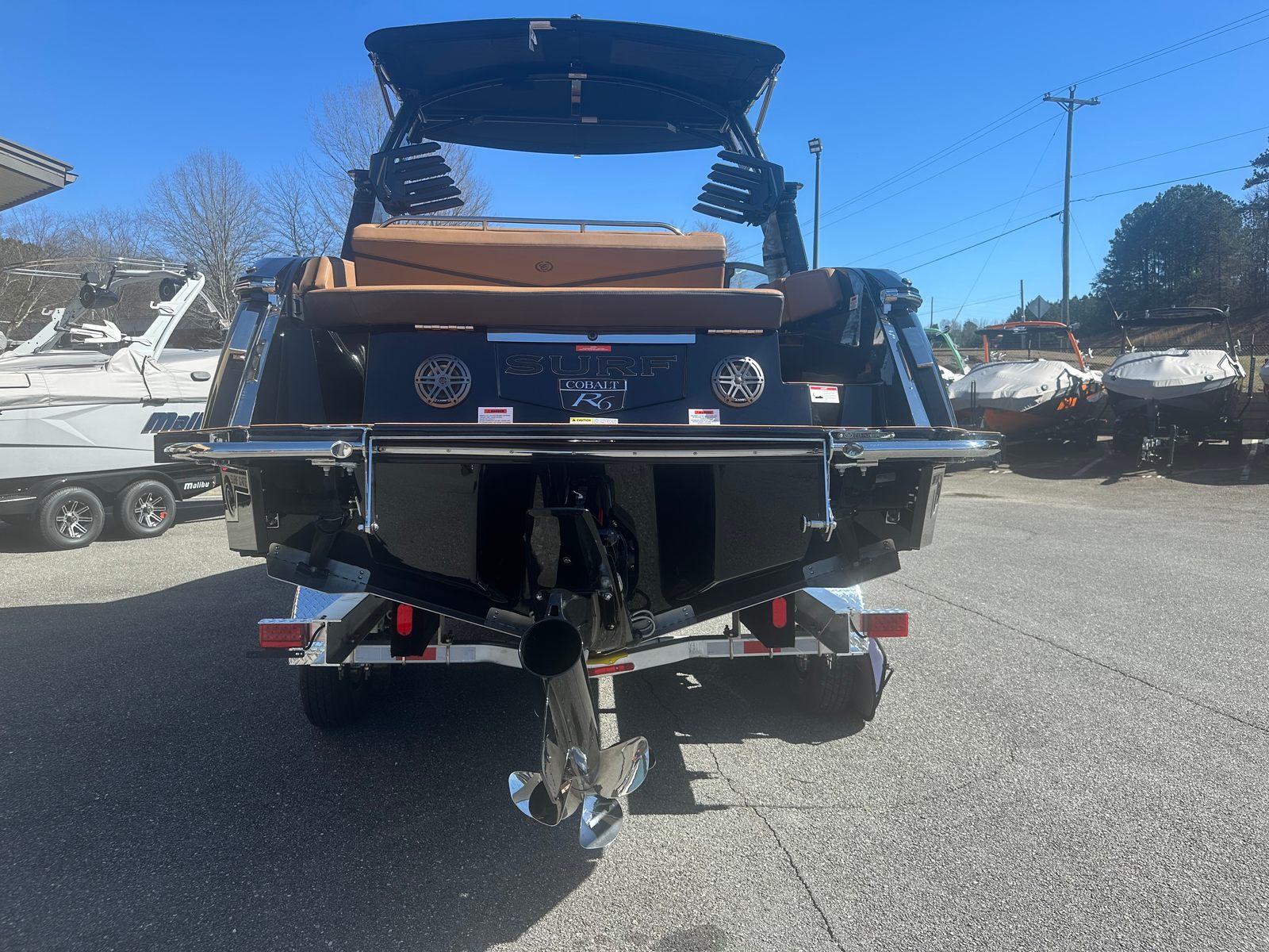 The 2026 Cobalt R6 Surf is packed with premium features that elevate your boating experience. The interior showcases a sophisticated blend of Caramel, Carbon, and Ebony, creating a warm and inviting atmosphere. The Cobalt Letters in Black Satin add a touch of elegance, while the full colored deck in Rich Ebony ensures a striking presence on the water.For added convenience and safety, the R6 Surf includes a rear facing camera, making docking and maneuvering easier than ever. The stainless steel docking lights provide enhanced visibility during evening outings, and the battery maintainer/charger (110V) keeps your boat ready for adventure at all times.The electric arch, Prisma - Black (folding) with Ebony Bimini, offers both style and functionality, allowing you to adjust your shade and enjoy the sun or shelter as you please. The flagpole with flag adds a classic touch, perfect for showcasing your pride on the water.Technology enthusiasts will appreciate the glass cockpit, featuring dual Garmin 8610 displays for seamless navigation and control. These advanced systems put all the information you need at your fingertips, ensuring a safe and enjoyable journey every time.