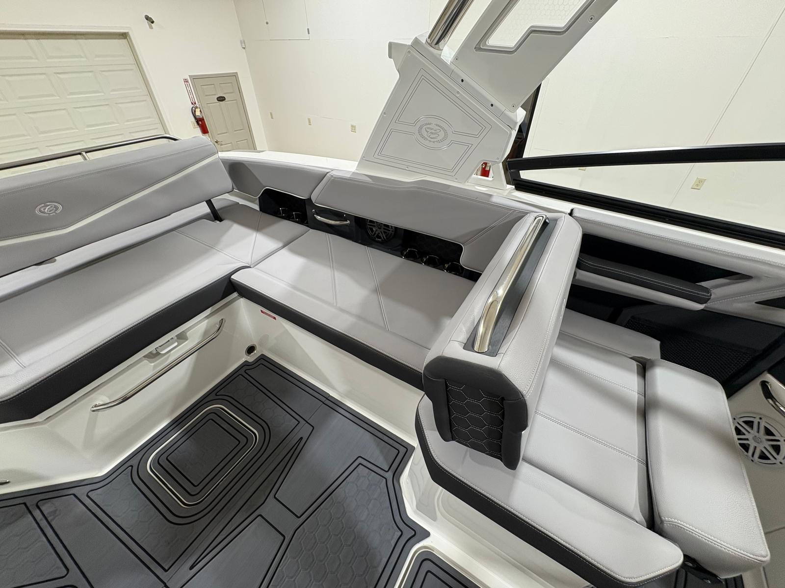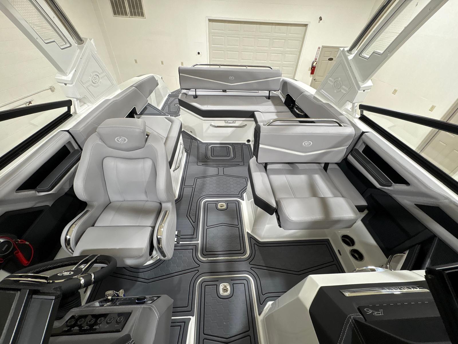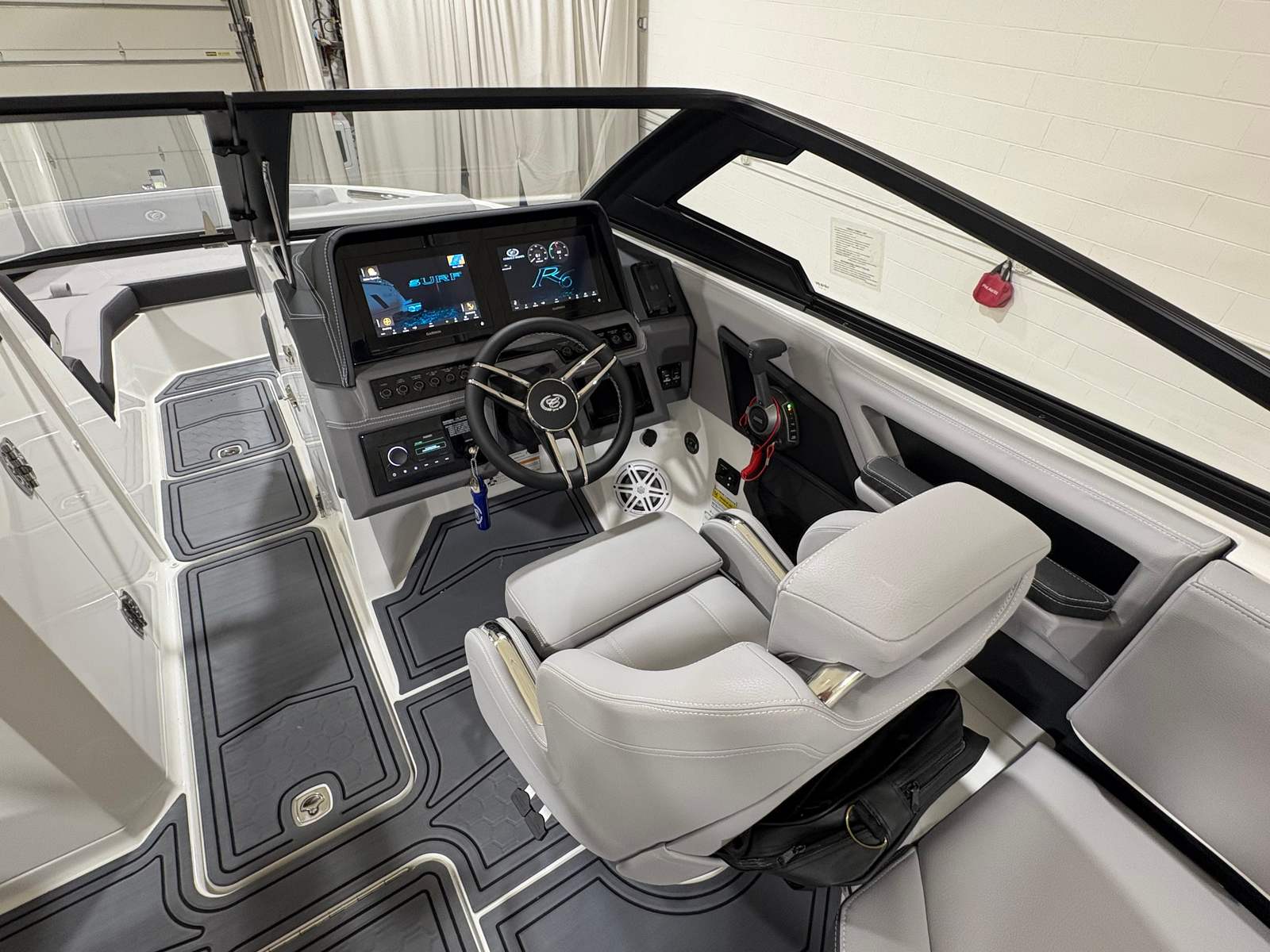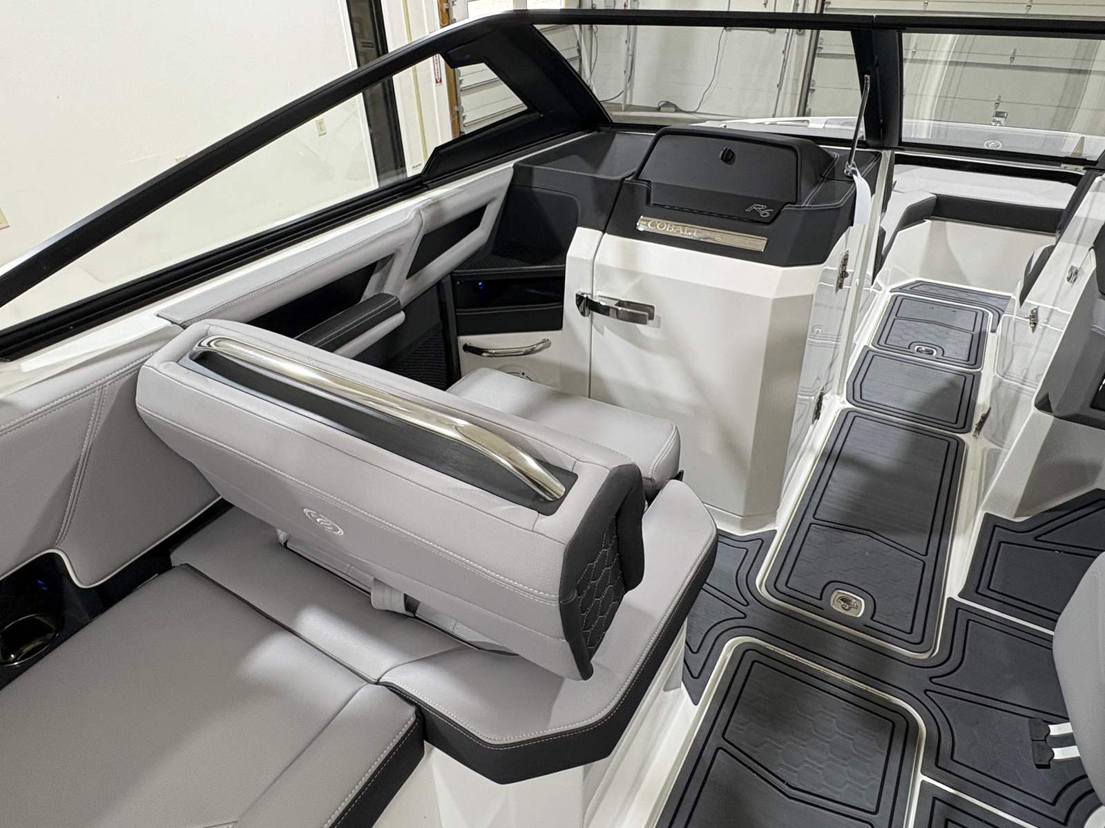 The 2026 Cobalt R6 Surf is a new bowrider that measures an impressive 25.75 feet in length, offering ample space for passengers and gear. Cobalt’s reputation for quality craftsmanship and attention to detail is evident in every inch of this model. The R6 Surf’s modern design combines elegance with practicality, making it a top choice for those looking for a premium bowrider boat for sale. Its Frost Gray hull bottom and sophisticated interior color palette of Frost, Slate, and White create a refined atmosphere that’s both inviting and stylish.