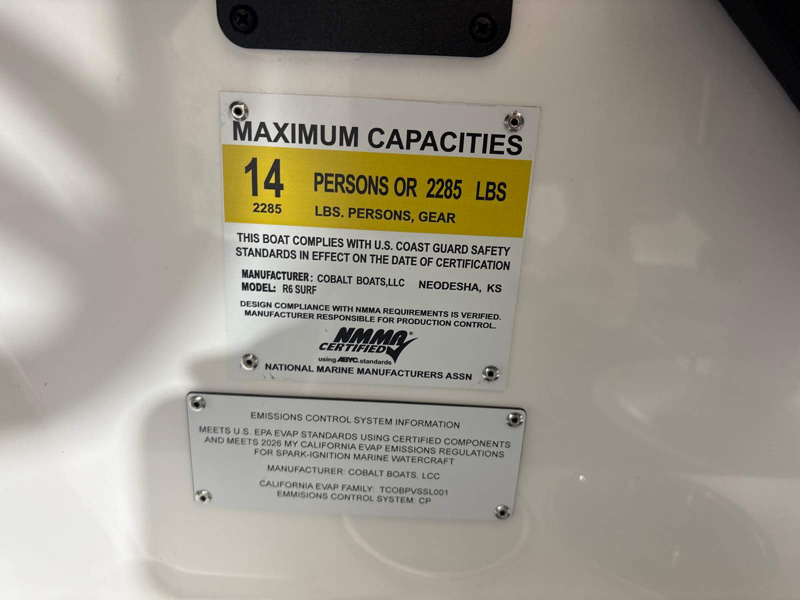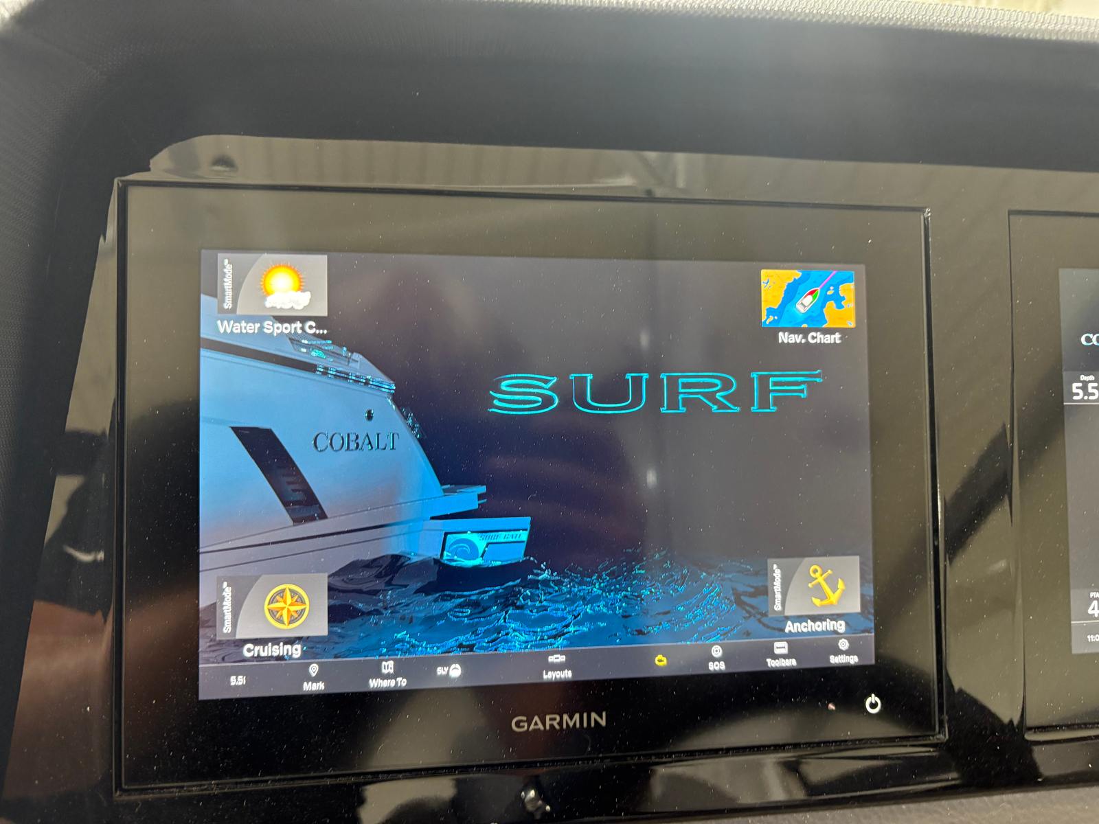 Practicality is at the core of the Cobalt R6 Surf’s design. The boat’s generous length offers ample storage for gear, water toys, and personal items, keeping the deck clutter-free and organized. Docking is made easier with stainless steel docking lights, enhancing safety during low-light conditions. The mooring cover ensures your boat stays protected from the elements, preserving its pristine condition.Fuel efficiency is enhanced by the advanced Volvo V8 engine, allowing you to spend more time on the water and less time refueling. The glass cockpit with dual Volvo 8610 displays simplifies navigation and system monitoring, making every journey stress-free. The Sof-Trac mat provides a comfortable and secure footing, reducing fatigue during long days on the water.