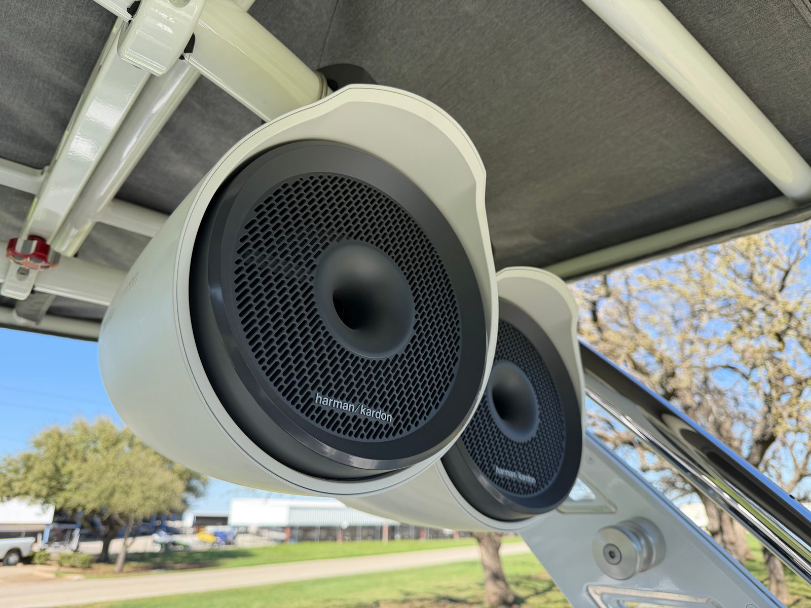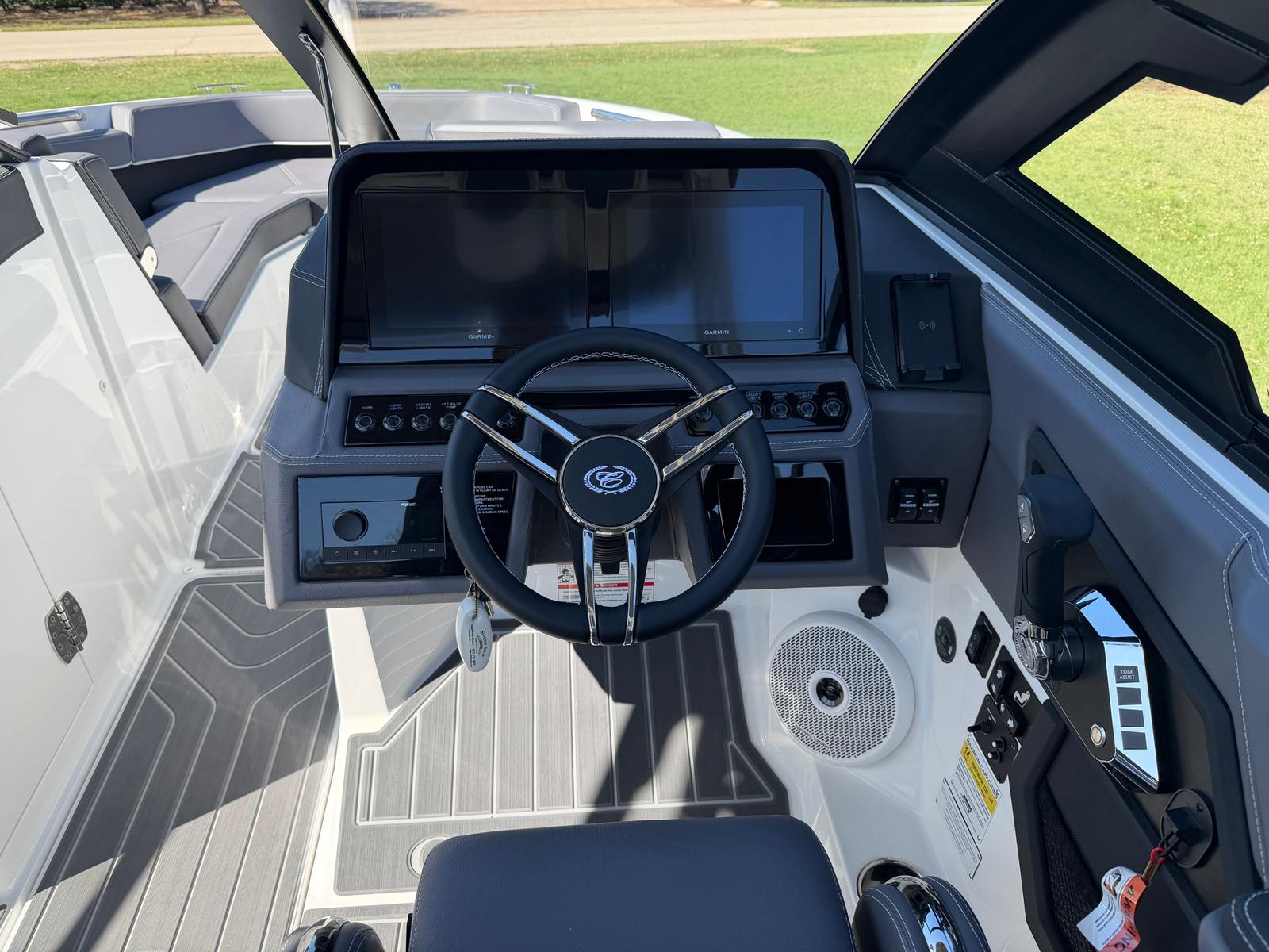 The 2026 Cobalt R6 Surf is loaded with premium features that elevate your time on the water. Enjoy the comfort and convenience of an electric adjustable seat, allowing you to find the perfect position for piloting or relaxing. The aft shade sail in crisp white provides essential sun protection, creating a cool retreat on warm days. Bow filler cushions enhance the bow seating area, transforming it into a plush lounge for sunbathing or socializing.For added functionality, the air compressor with holder is a practical addition for inflating water toys or adjusting tire pressure on the go. The battery maintainer/charger (110V) ensures your boat’s electrical systems remain powered and ready for every adventure. Stainless steel docking lights offer enhanced visibility and safety during evening arrivals or departures, while the rear-facing camera provides an extra layer of awareness when maneuvering in tight spaces.The R6 Surf’s aesthetic appeal is further highlighted by the black satin Cobalt letters and the elegant El Arch, Prisma, in white with a foldable, rotatable gray shade. The solid teak dinette table with cockpit receptacle adds a touch of luxury, perfect for onboard dining or entertaining guests.