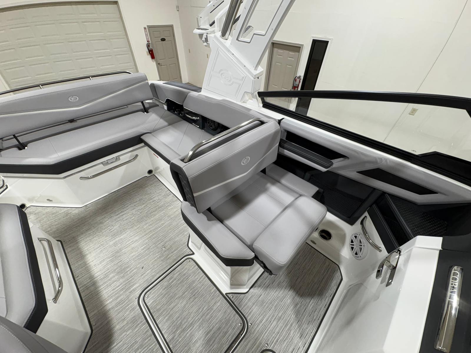 Practicality meets luxury in the Cobalt R6 Surf. The folding electric arch and mooring cover make storage and docking straightforward, protecting your boat and simplifying maintenance. The stainless steel docking lights enhance visibility during low-light conditions, making it easier to navigate marinas and docks safely. The Seagrass floor covering is not only stylish but also durable and easy to clean, ensuring your boat stays looking its best season after season.The dual Volvo 8610 displays in the glass cockpit provide comprehensive information at a glance, streamlining navigation and engine monitoring. The premium sound system, with transom speakers and remote, allows you to control your music from anywhere on the boat, adding convenience and enjoyment to every outing. These practical features make the R6 Surf a pleasure to own and operate, whether you are a seasoned captain or new to boating.