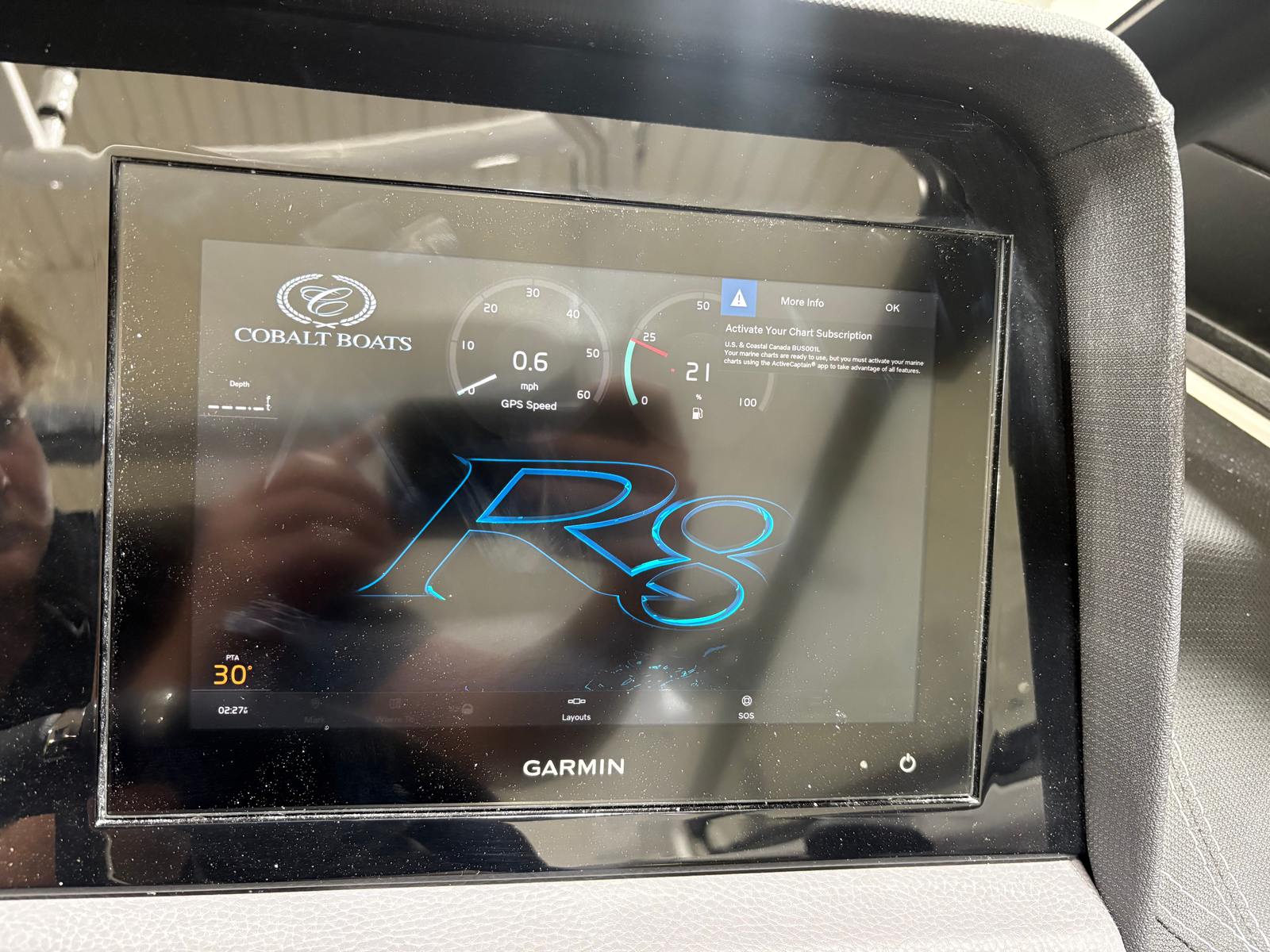 The 2026 Cobalt R8 Surf is loaded with premium features that set it apart from other bowriders on the market. The stainless steel docking lights not only add a touch of elegance but also enhance visibility and safety during low-light conditions. The White EL Arch, Prisma (Folding) with Gray Bimini, offers both style and functionality, providing shade and flexibility for different weather conditions. The floor covering in Seagrass, Silver Ash, adds a luxurious feel underfoot while being durable and easy to maintain.Step inside, and you will be greeted by a sophisticated interior finished in Frost, Slate, and White, creating a modern and inviting atmosphere. The glass cockpit, featuring dual Volvo 8610 displays, puts advanced navigation and control at your fingertips, ensuring a seamless and intuitive boating experience. The hull bottom in Bayside Blue not only enhances the boat’s visual appeal but also reflects Cobalt’s commitment to quality and craftsmanship.For those who love music on the water, the premium sound system with transom speakers and remote ensures that your favorite tunes are always within reach, whether you are lounging in the cockpit or enjoying the swim platform. The Surf Gate Accent in Pacific Blue adds a custom touch, highlighting the boat’s surf-ready capabilities. A mooring cover with Prisma folding arch protects your investment and keeps your boat looking pristine.
