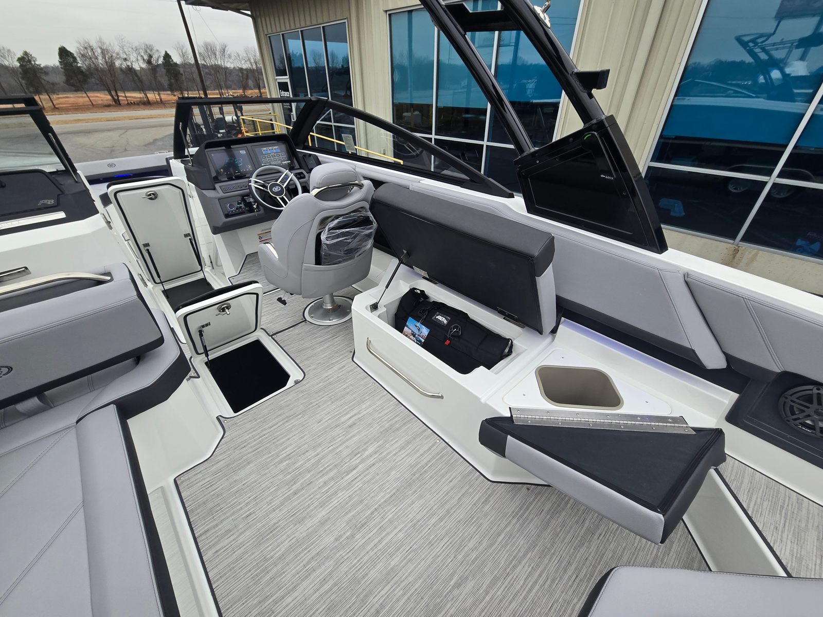 The Cobalt R8 Bowrider is designed with practicality in mind, making ownership both enjoyable and hassle-free. The folding arch and bimini system provide flexible shade options, allowing you to adapt to changing weather conditions with ease. The stainless steel docking lights make nighttime arrivals and departures safer, while the battery maintainer/charger ensures your boat is always ready for action. The spacious layout offers plenty of storage for gear, snacks, and personal items, keeping the deck clutter-free and organized. The pump-out Porta Potti adds convenience for longer trips, eliminating the need for frequent stops. With its efficient engine and advanced navigation systems, the R8 is easy to dock, maneuver, and maintain, giving you more time to focus on fun and relaxation.