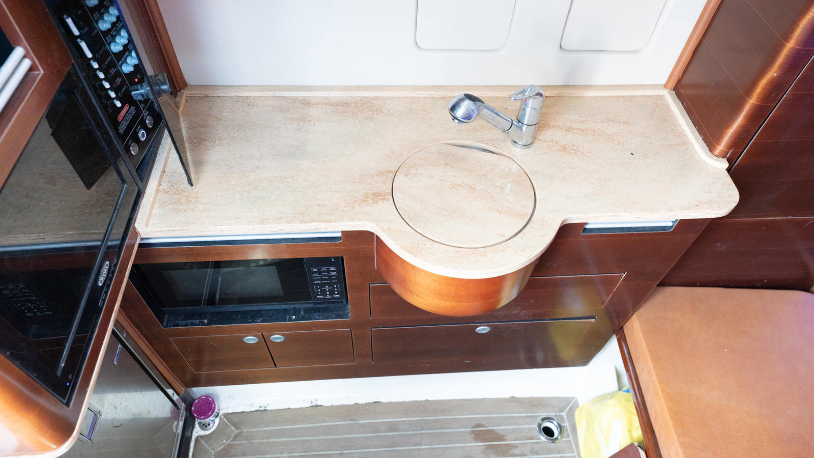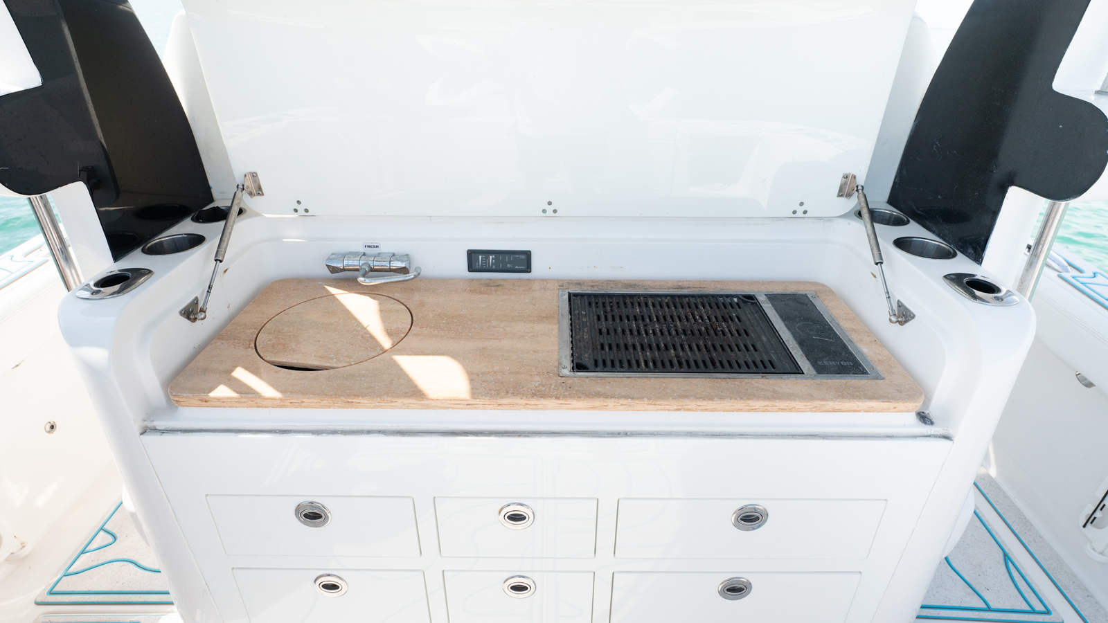 Large console cabin includes berth with A/C, marine head, and fresh water sink