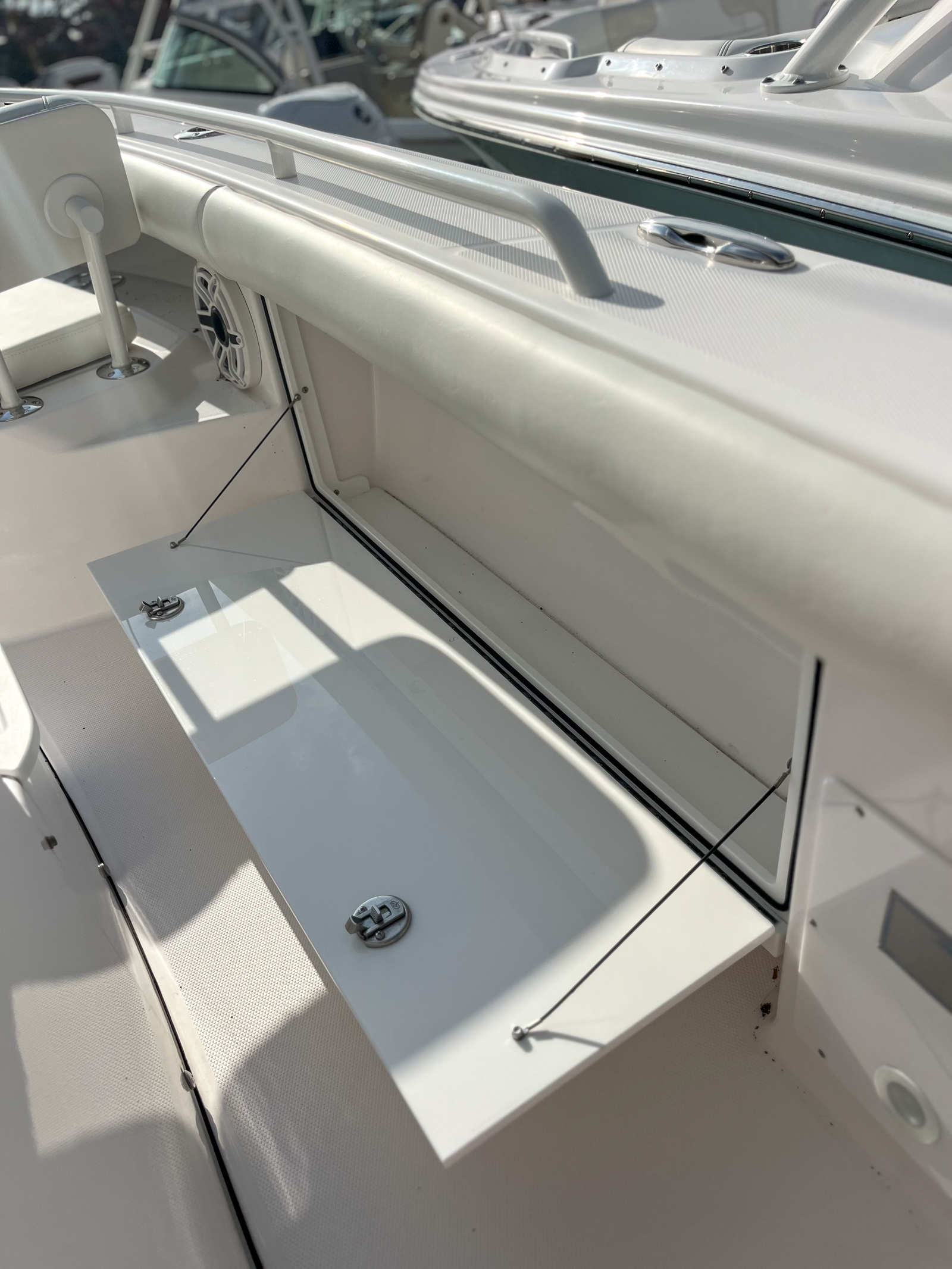 The Everglades 273 CC is designed with practicality in mind, offering features that make ownership easy and enjoyable. The efficient twin Yamaha engines not only provide impressive performance but also contribute to fuel efficiency, helping you make the most of every trip. The low-profile windlass simplifies the anchoring process, saving you time and effort when stopping to swim, fish, or relax. The intuitive layout and advanced electronics make navigation and docking straightforward, even for less experienced boaters. With plenty of storage for gear and supplies, this boat is ready for extended outings, ensuring you have everything you need for a successful day on the water.