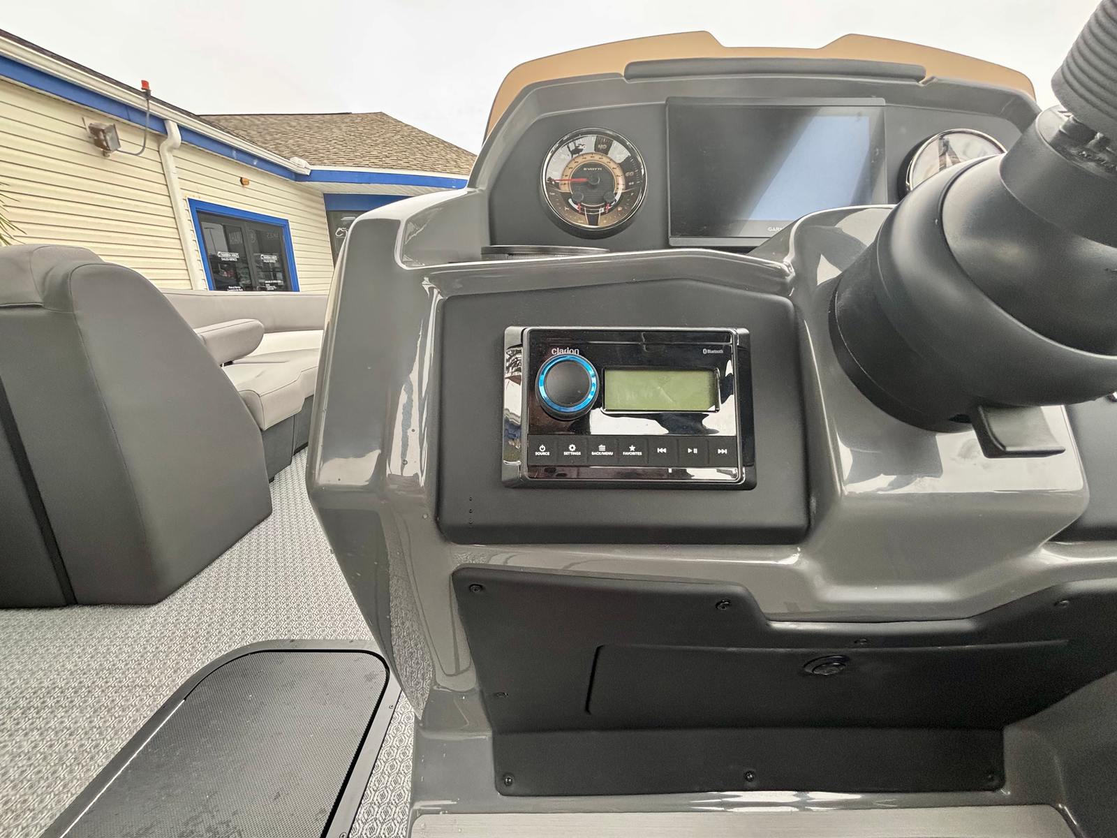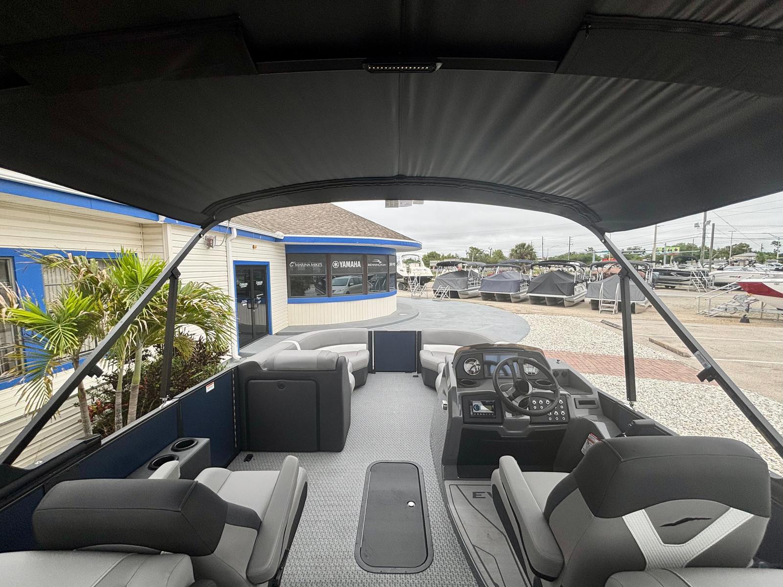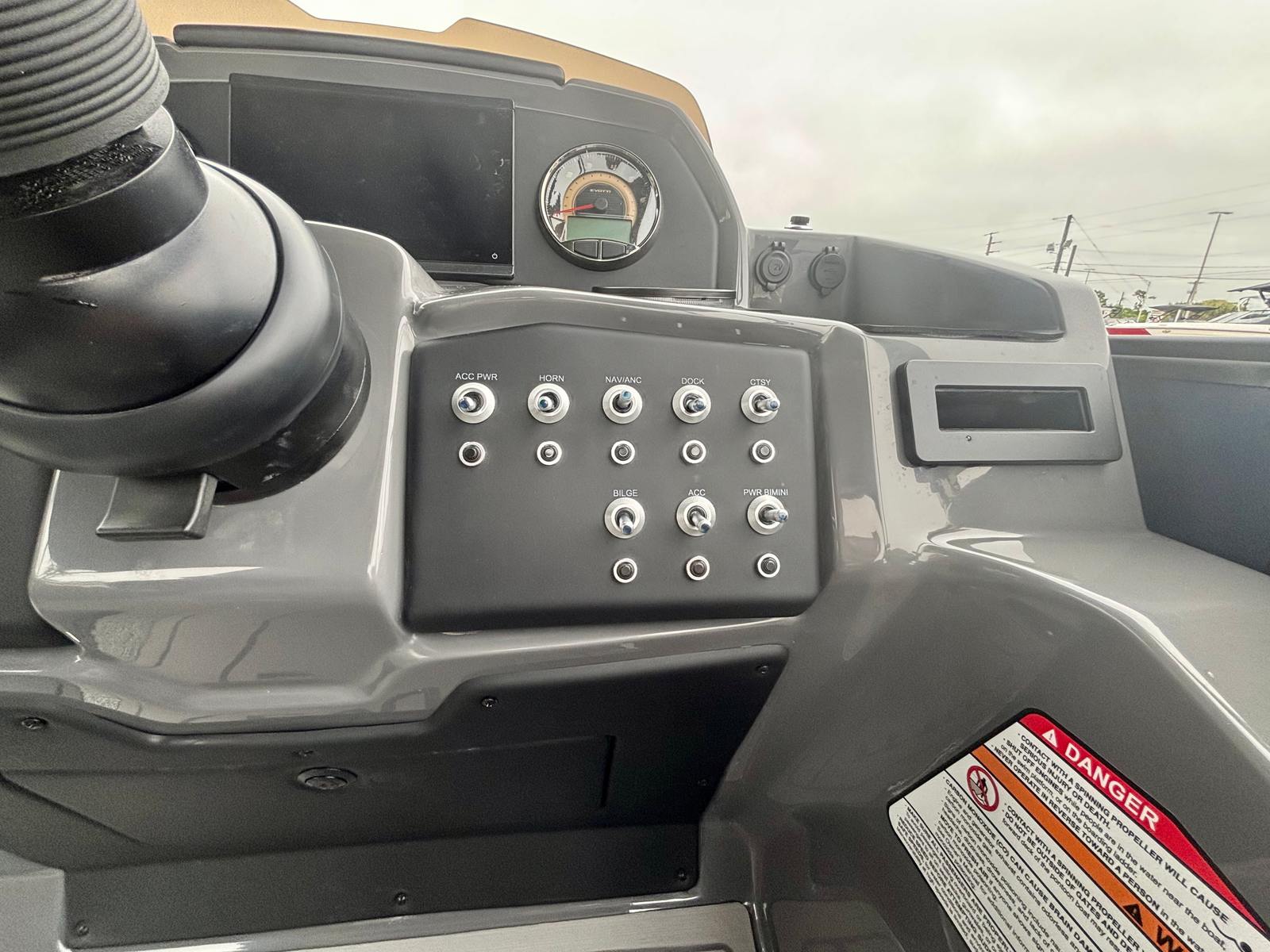 The 2026 Evotti 521 QL pontoon is packed with premium features that enhance both its functionality and visual appeal. The Panel Platinum Blue Satin and Panel Accent Pearl White Gloss create a striking exterior that turns heads at every marina. Step aboard and you are greeted by the luxurious Base Vinyl Steel Gray upholstery, which offers both comfort and durability for all your guests. The Steel Gray Evolution Flooring not only adds a touch of sophistication but also provides a non-slip, easy-to-clean surface that is perfect for active days on the water.For the tech-savvy boater, the Garmin 943 with 5" Gauges delivers advanced navigation and real-time data at your fingertips, ensuring you stay informed and on course. The Clarion Head Unit & Speakers set the mood with high-quality audio, allowing you to enjoy your favorite playlists as you cruise. The thoughtfully designed windscreen offers protection from the elements, enhancing comfort during every journey.