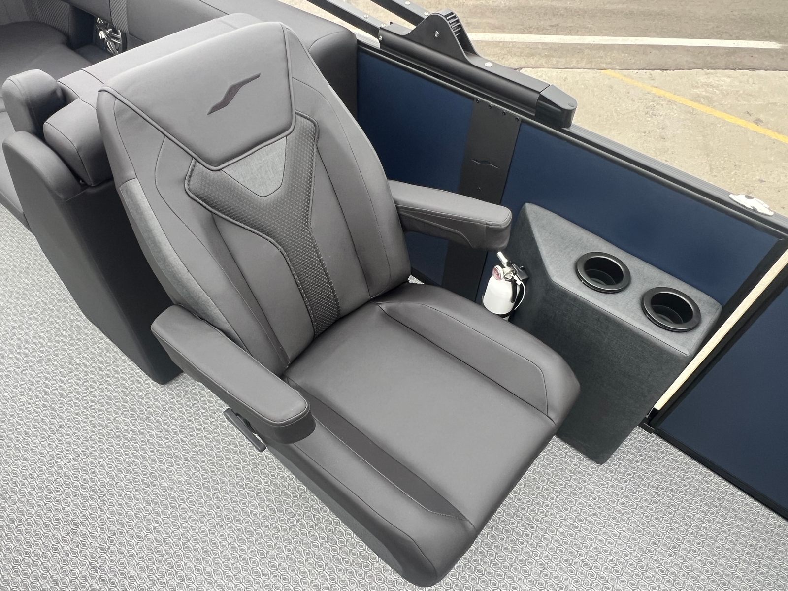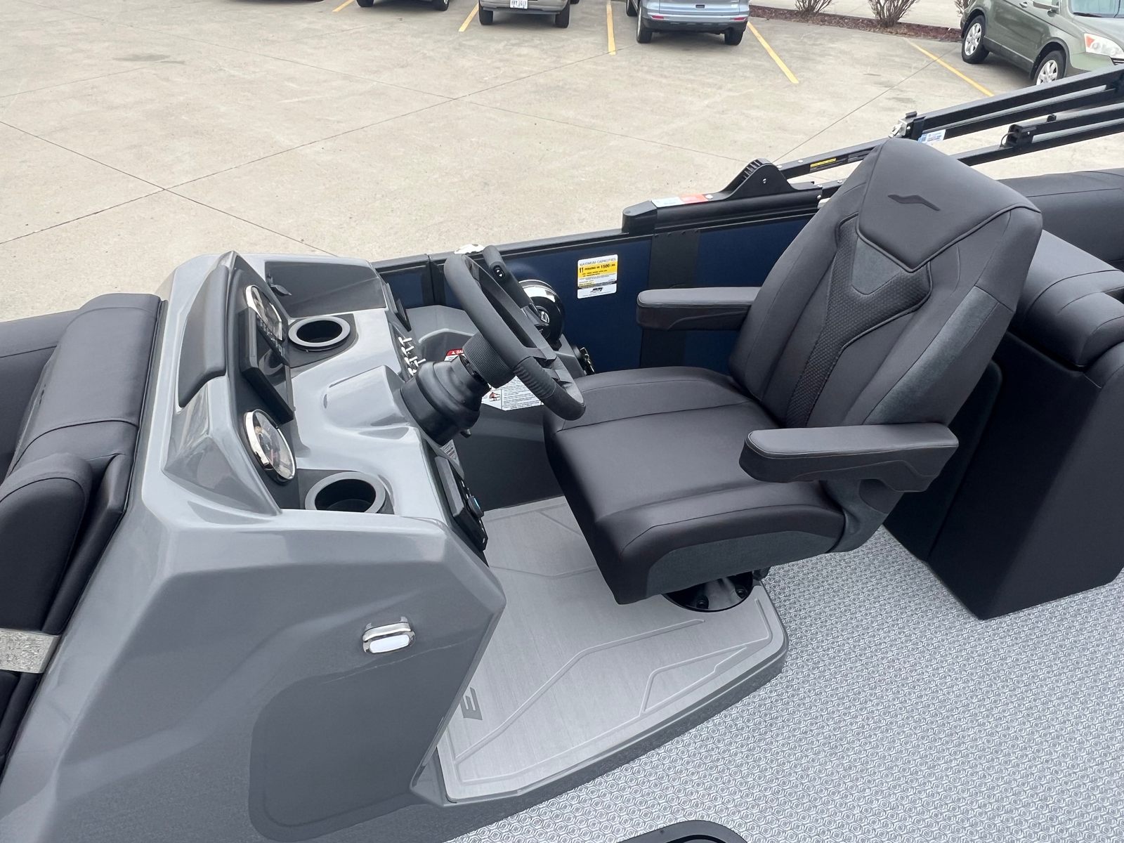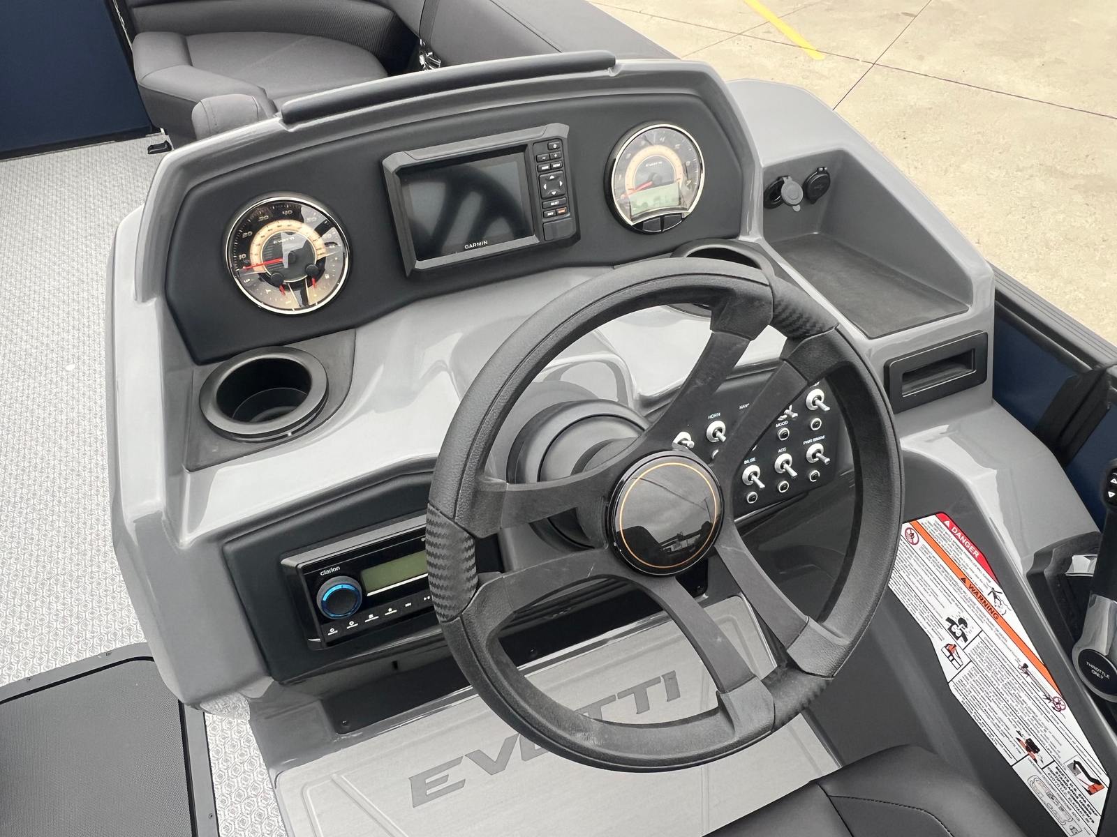 Step aboard the Evotti 521 QL and immerse yourself in a world of luxury and innovation. The Panel Platinum Blue Satin and Panel Accent Diamond Black Satin create a striking visual impression, while the Canvas Black provides both style and protection from the elements. The Base Vinyl Spectra Black upholstery is not only visually appealing but also designed for durability and comfort, ensuring your seating remains pristine season after season.The Steel Gray Evolution Flooring adds a touch of sophistication and is engineered for easy cleaning and long-lasting wear, making it ideal for active families and social gatherings. The dual battery system ensures you have reliable power for all your onboard electronics and accessories, while the Garmin 5" Echo Map with 5" gauges offers advanced navigation and real-time data at your fingertips. Every detail of the Evotti 521 QL is crafted to enhance your boating experience, from the premium finishes to the state-of-the-art technology.
