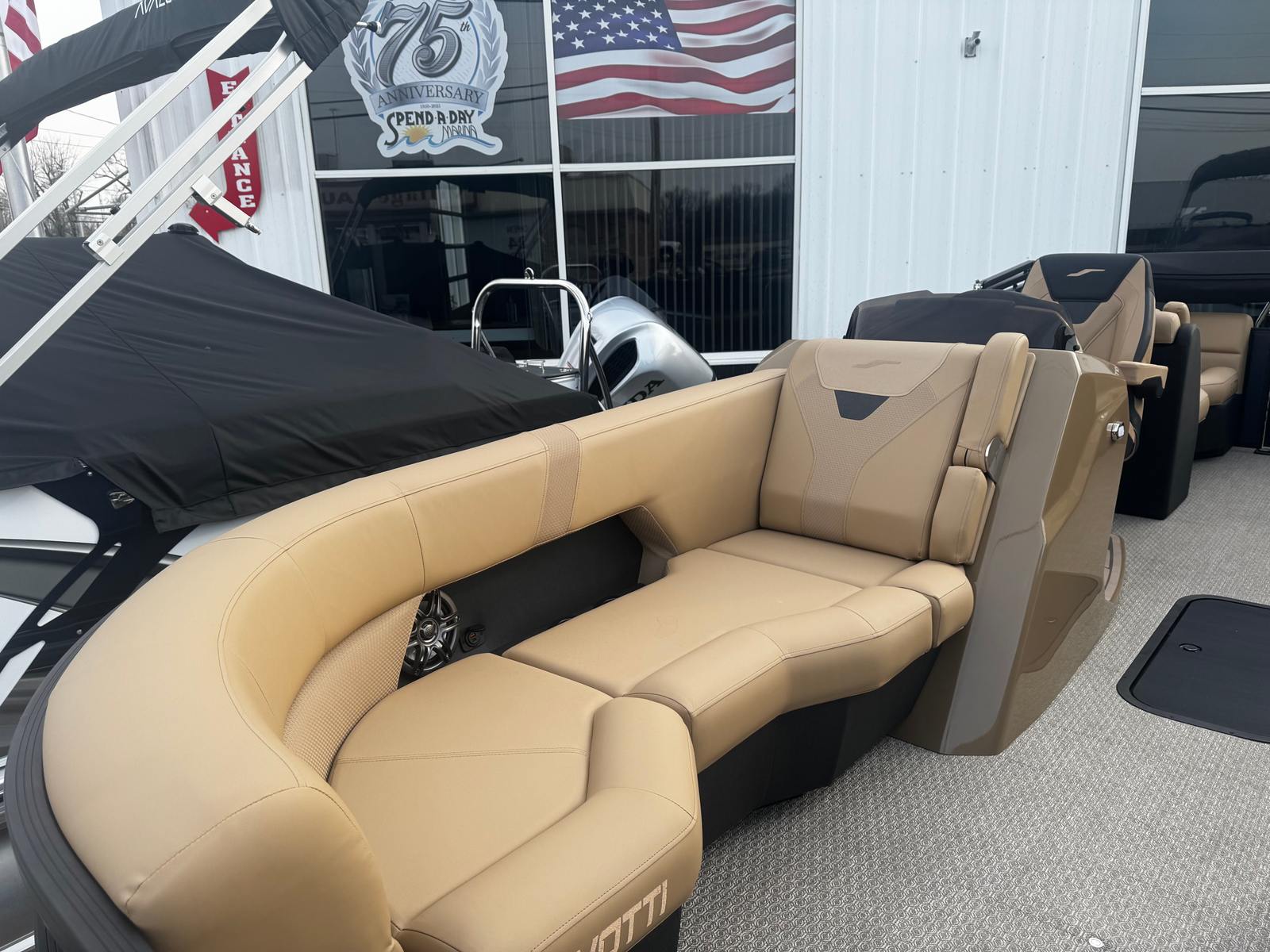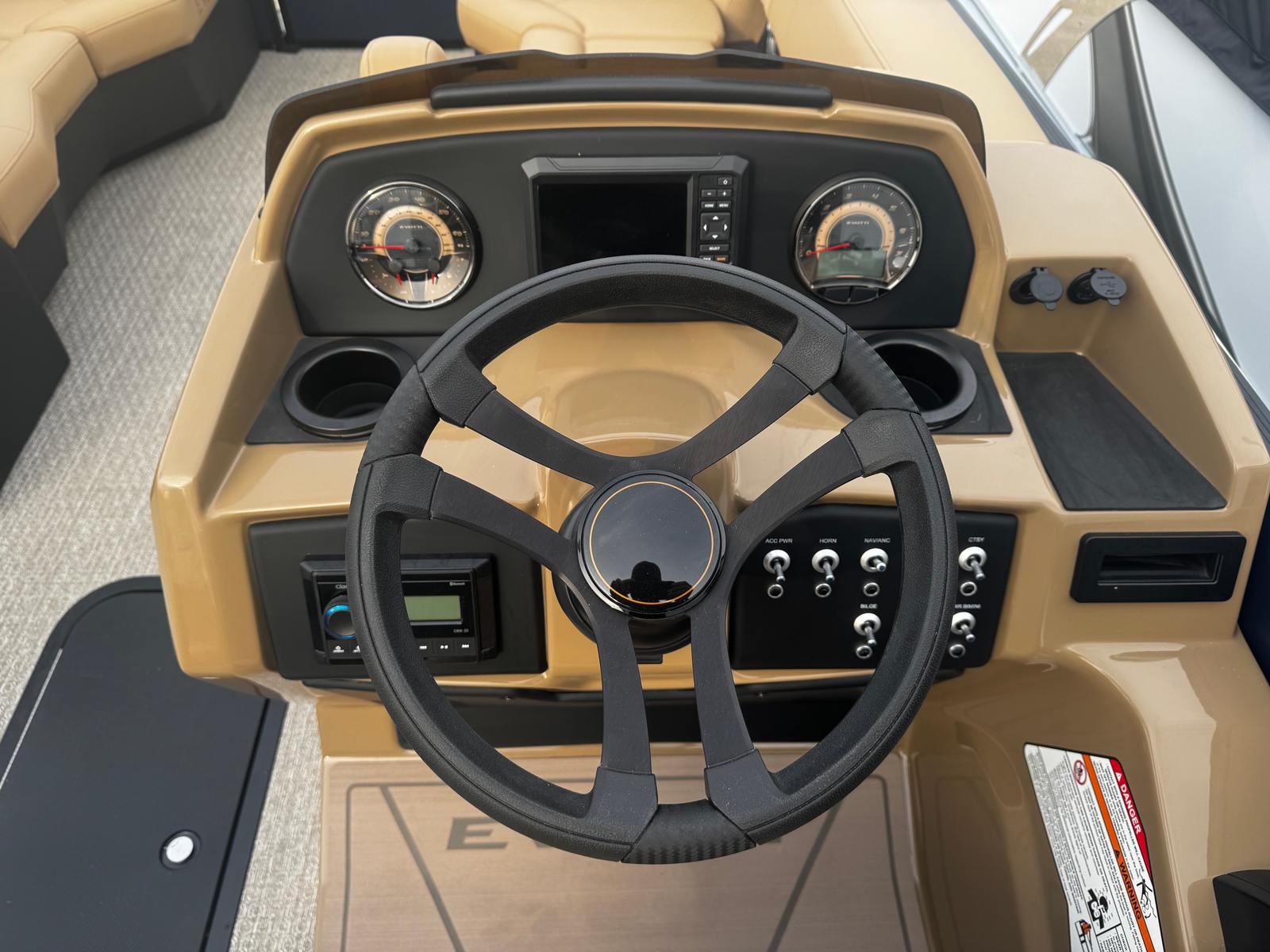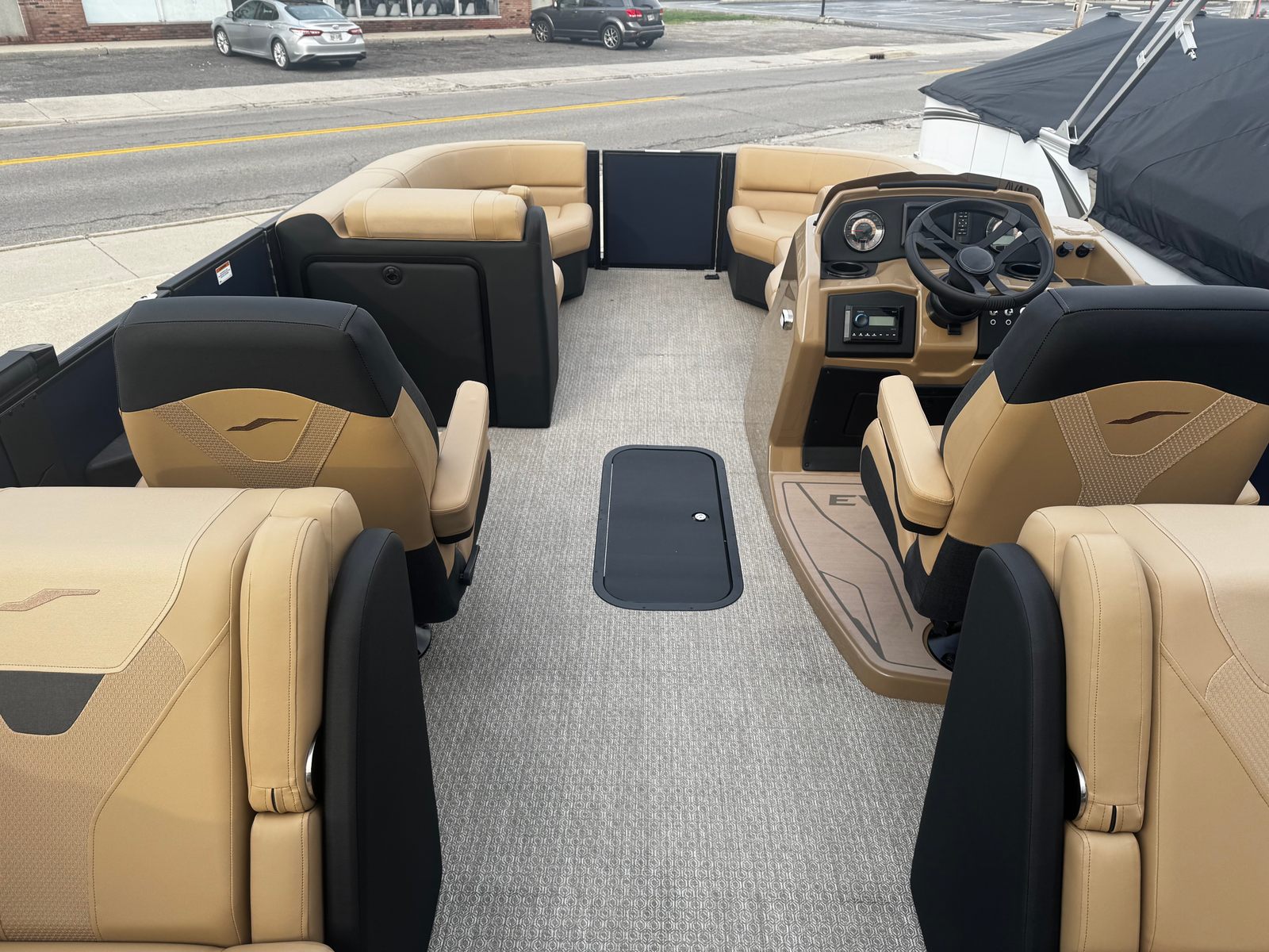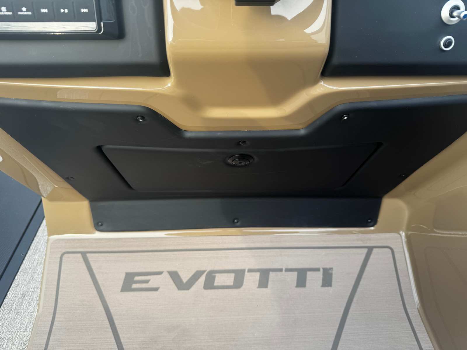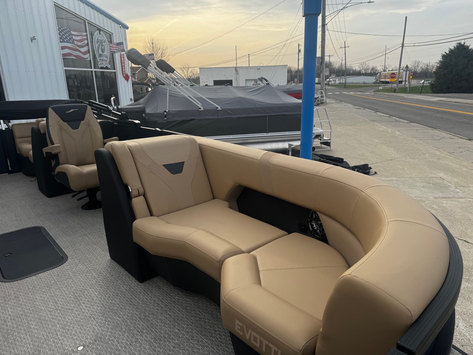 The 2026 Evotti 521 QL is loaded with premium features designed to enhance every moment on the water. The Base Vinyl Roan Bronze upholstery offers a sophisticated look and plush comfort, while the Roan Bronze Evolution Flooring provides a durable, slip-resistant surface that is as stylish as it is practical. The Panel Platinum Blue Satin adds a touch of elegance, and the Canvas Black ensures protection from the elements when needed.Navigation and control are made effortless with the Garmin 5" Echo Map, complete with 5" gauges for clear, real-time data at your fingertips. The Clarion Head Unit & Speakers deliver crisp, immersive sound, setting the perfect soundtrack for your adventures. The windscreen offers added comfort, shielding you from wind and spray as you cruise. Every detail of this pontoon boat for sale is crafted to provide a seamless blend of luxury, technology, and functionality.