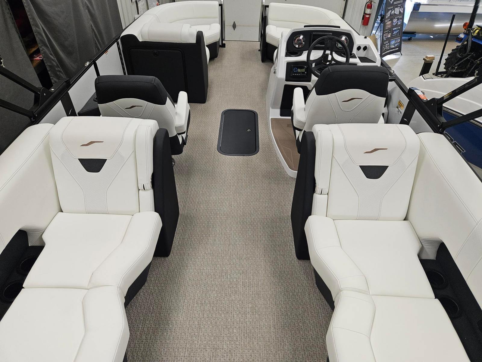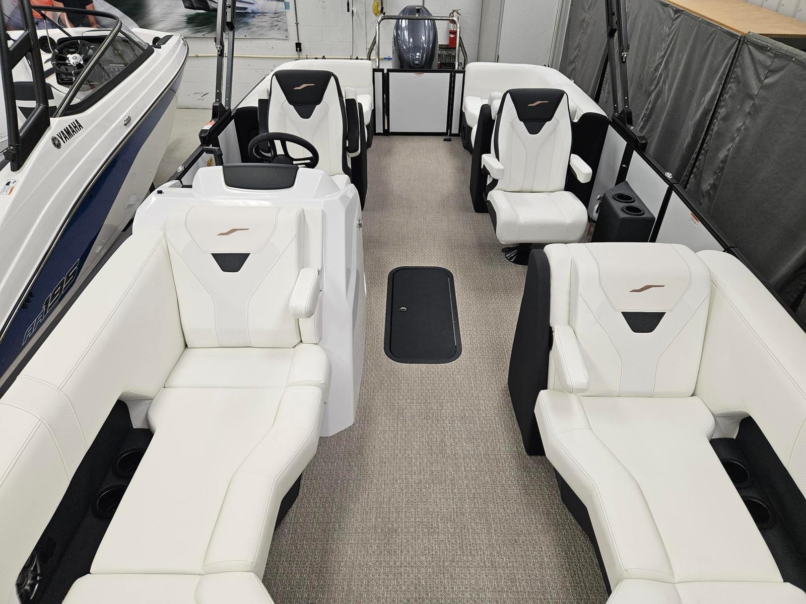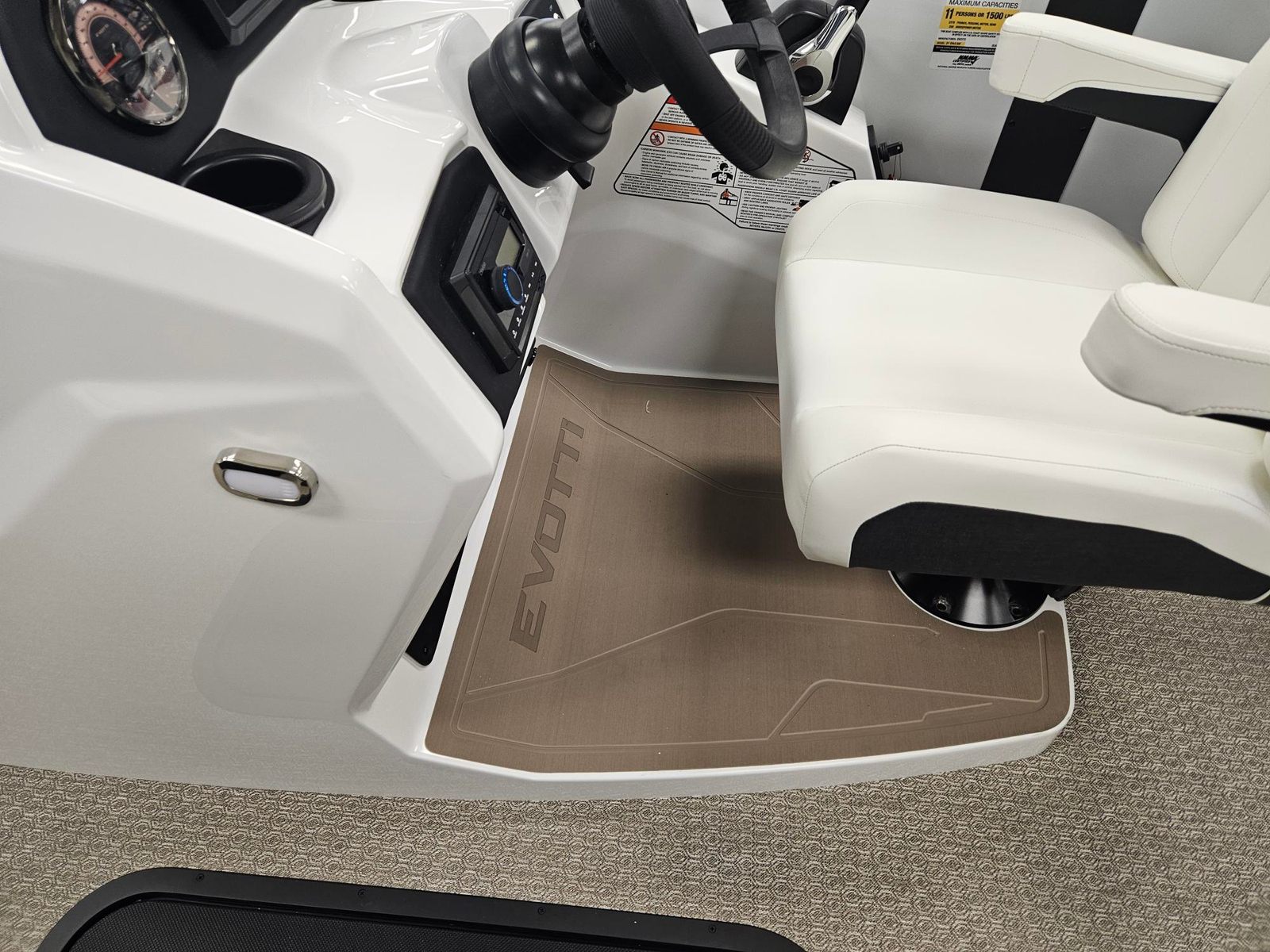 The Evotti 521 QL Pontoon is packed with features that enhance both its visual appeal and functionality. The Panel Pearl White Gloss finish gives the boat a sophisticated, high-end look, while the absence of a panel accent maintains a clean, streamlined appearance. The Canvas Black top provides shade and protection from the elements, allowing you to enjoy your time on the water in comfort. Inside, the Base Vinyl Ghost White upholstery offers a luxurious and inviting seating area, complemented by the Roan Bronze Evolution Flooring, which is both stylish and durable.A single battery setup ensures reliable power for all your onboard systems, while the Garmin 5" Echo Map with 5" gauges keeps you informed and in control with advanced navigation and monitoring capabilities. Every detail of the Evotti 521 QL is thoughtfully designed to maximize your enjoyment and convenience.