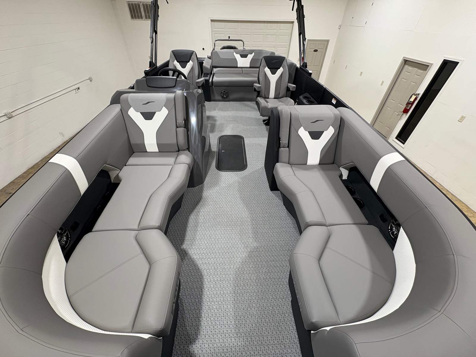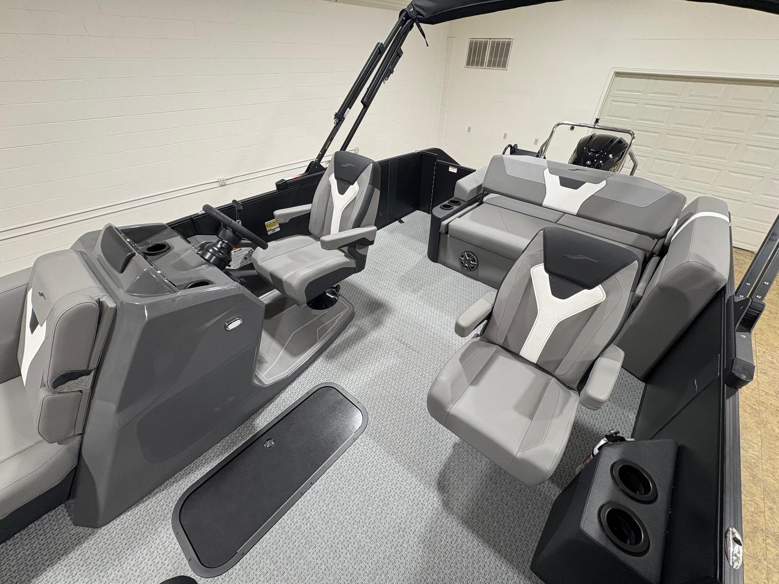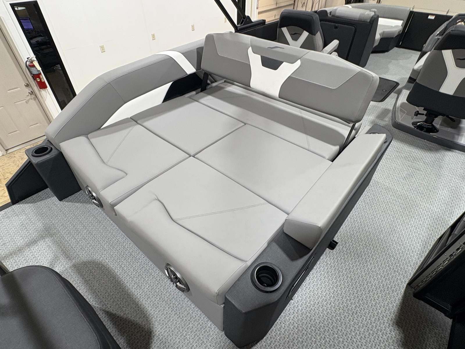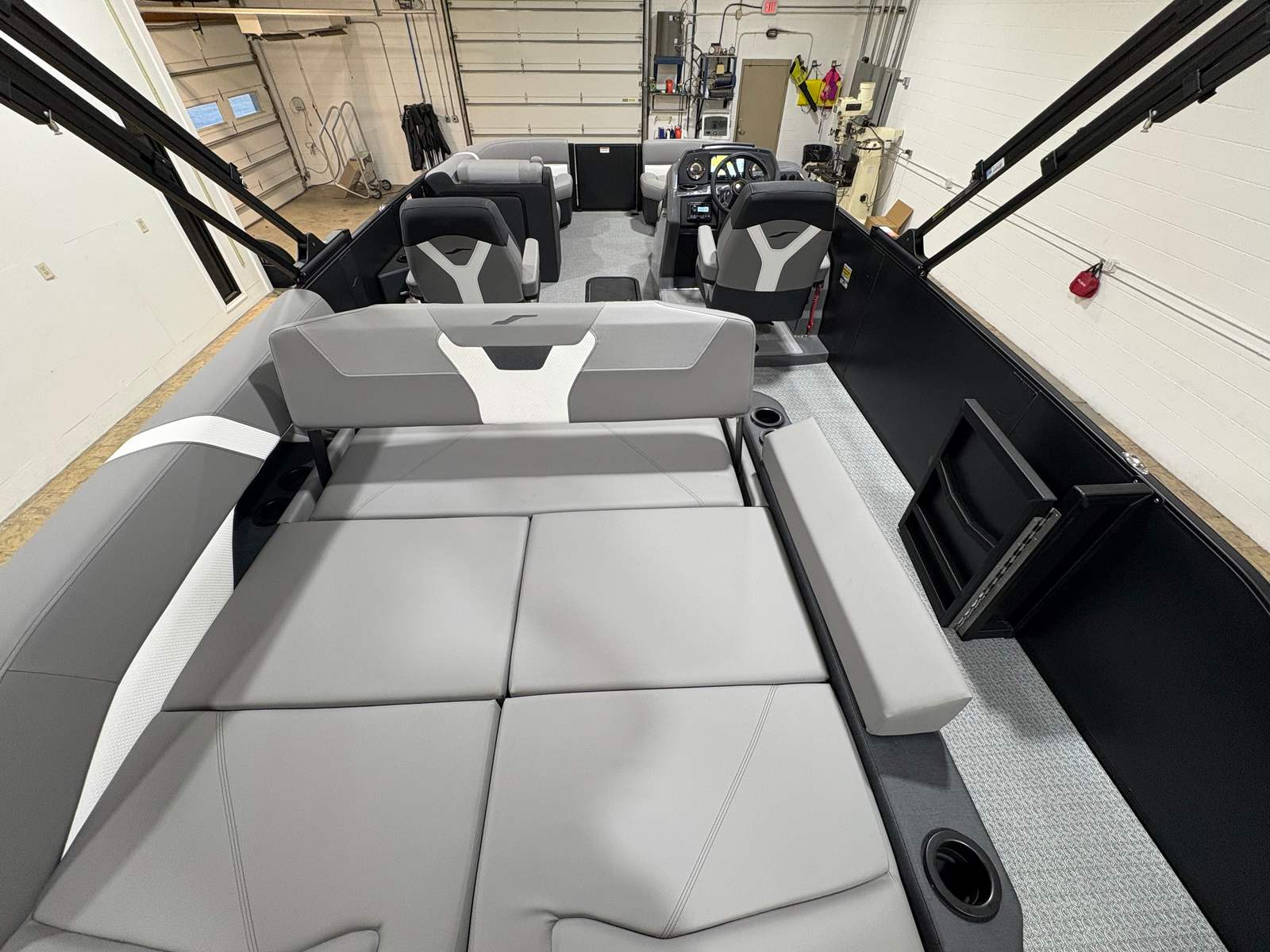 The 2026 Evotti 523 CS Pontoon is a testament to modern craftsmanship and innovation. Measuring an impressive 25.5 feet in length, this pontoon offers ample space for relaxation, entertainment, and adventure. The contemporary design is highlighted by the Panel Diamond Black Satin exterior, accented with a striking Panel Accent Pearl White Gloss, creating a sophisticated and eye-catching profile that stands out at any marina or lakeside gathering. The new condition ensures that every detail, from the flooring to the upholstery, is pristine and ready for immediate enjoyment.