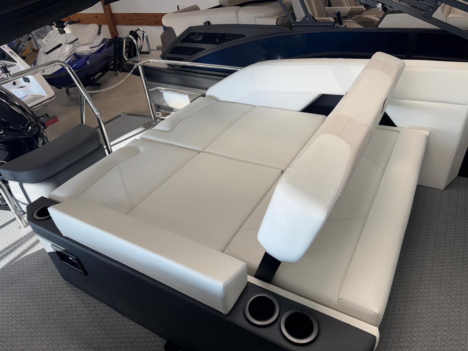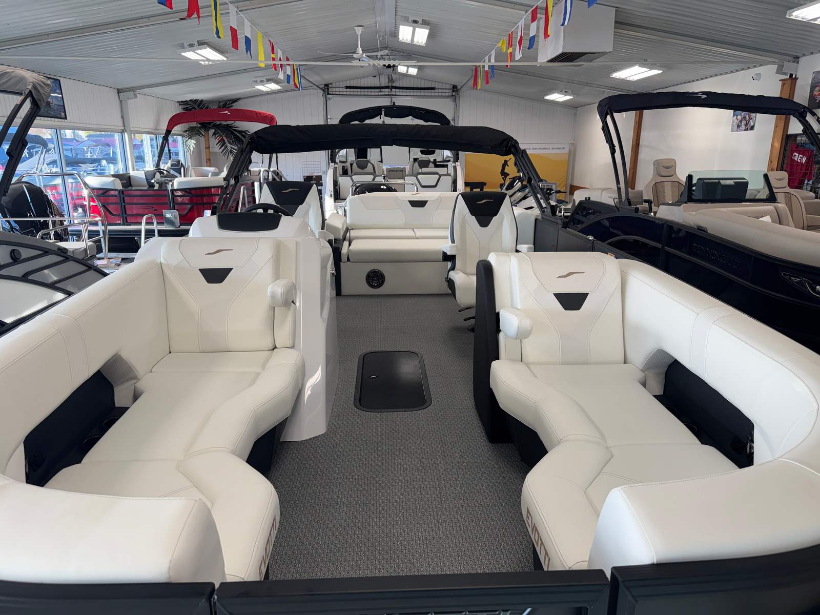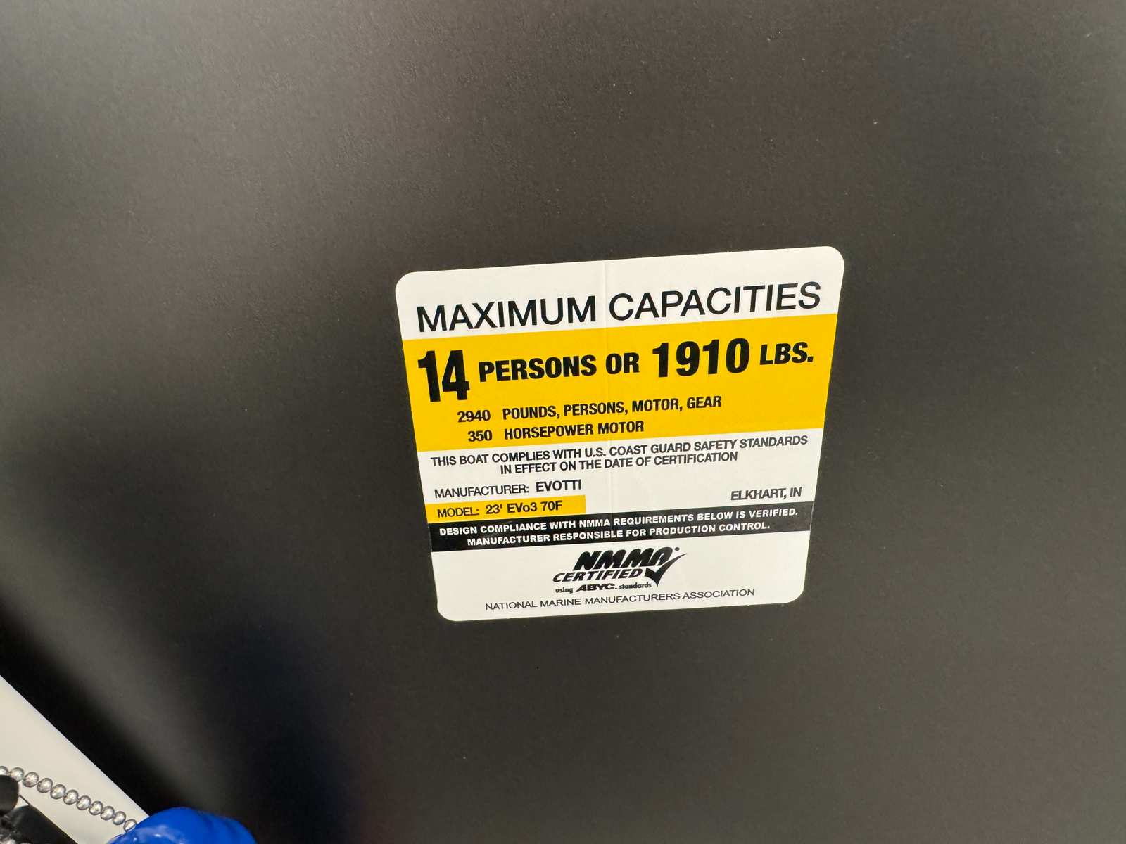 The Evotti 523 CS is loaded with special features that enhance both its visual appeal and functionality. The Panel Diamond Black Satin and Panel Accent Pearl White Gloss create a striking exterior, while the Canvas Black adds a touch of elegance and protection from the elements. Inside, the Base Vinyl Ghost White upholstery offers a clean, modern look, complemented by the Steel Gray Evolution Flooring, which is both stylish and easy to maintain. Stern safety chains provide added security, and the battery single setup ensures reliable power for all your onboard needs. Every detail is thoughtfully designed to maximize comfort, safety, and enjoyment on the water.