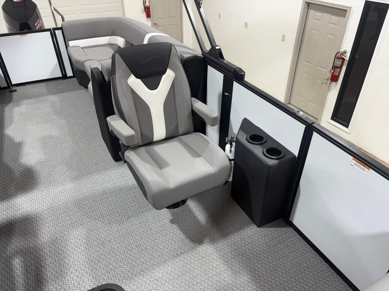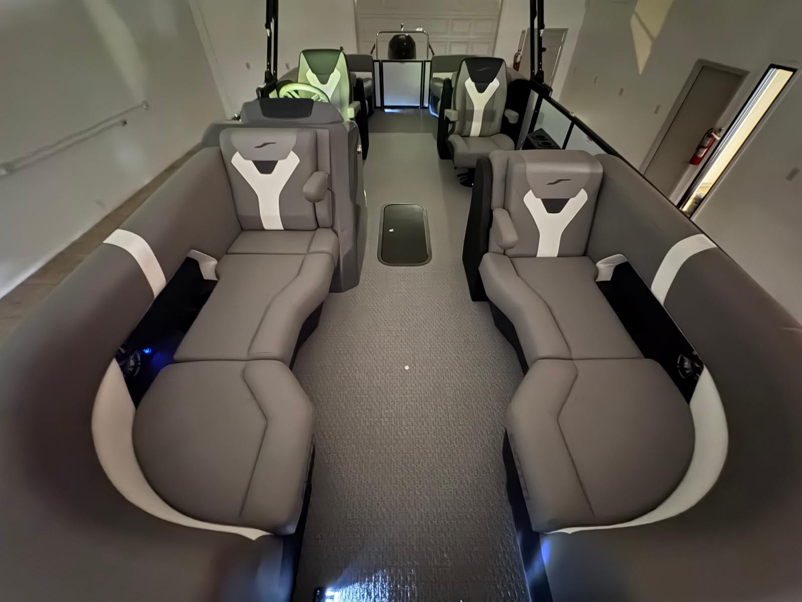 The 2026 Evotti 523 QL is packed with features that enhance both its aesthetic appeal and its functionality. The Base Vinyl Ghost White and Base Vinyl Steel Gray upholstery create a sophisticated and inviting atmosphere, while the Panel Pearl White Gloss and Panel Accent Platinum Blue Satin add a touch of modern elegance. The Steel Gray Evolution Flooring is not only stylish but also durable and easy to maintain, ensuring your pontoon remains pristine trip after trip.For those who appreciate high-quality sound, the Clarion Head Unit & Speakers provide crystal-clear audio, perfect for setting the mood or entertaining guests. Navigating your favorite waterways is a breeze with the Garmin 943 featuring 5" gauges, offering advanced navigation and easy-to-read information at your fingertips. The Canvas Black provides shade and protection from the elements, allowing you to enjoy your time on the water in comfort.