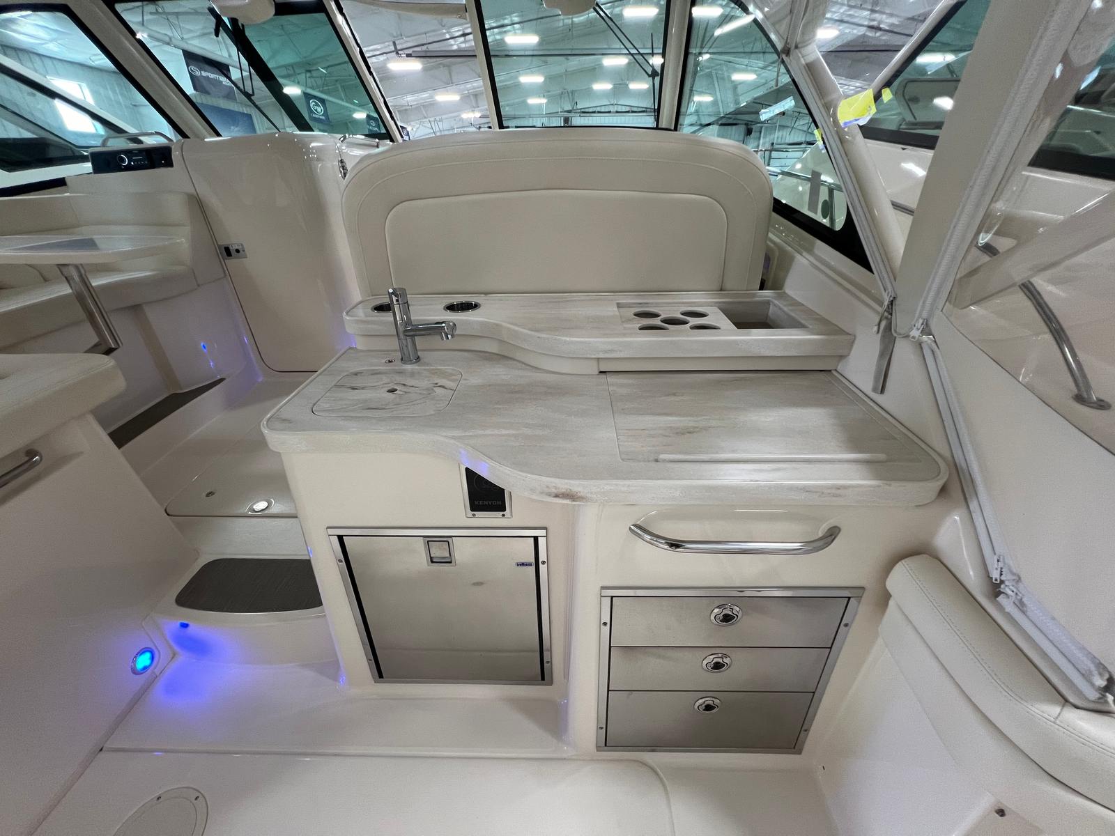 The Grady-White Freedom 375 is designed with practicality in mind, making ownership both easy and enjoyable. The raw water washdown system simplifies cleaning, allowing you to maintain your boat with minimal effort. The battery charger and shore power capabilities ensure your electronics and amenities are always ready to go, whether you’re docked or underway.Docking and storage are made easier thanks to the boat’s thoughtful design and manageable length. The remote spotlight adds an extra layer of safety when navigating in low-light conditions, while the Av2 Hard Top provides shelter and protection for both captain and passengers. These features combine to create a hassle-free boating experience, allowing you to focus on enjoying your time on the water.