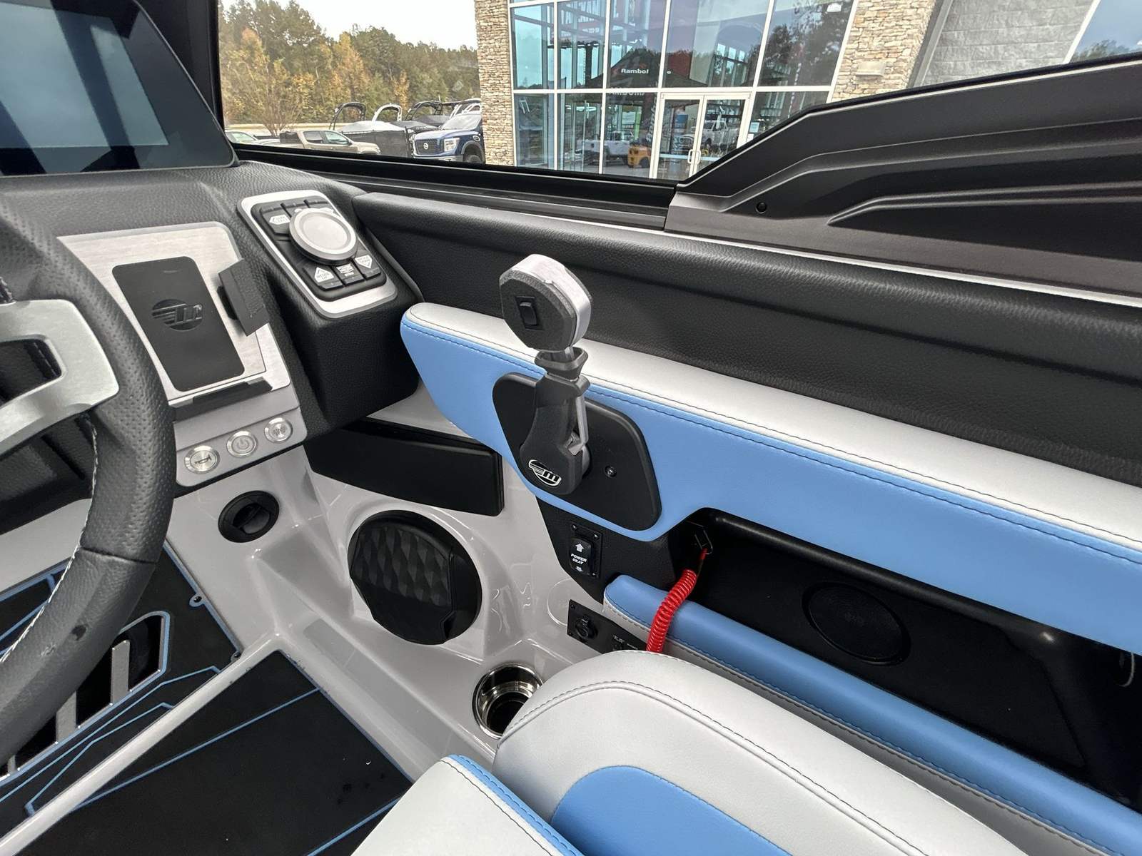 Step aboard the Wakesetter 25 LSV and discover a host of special features designed to enhance your boating experience. The MaxPivot Wakeview Bench with Integrated Table offers versatile seating and a convenient space for snacks or gear, perfect for socializing between sessions. The advanced Battery Set Up - Option 3 ensures reliable power management, keeping all your electronics running smoothly. The Power Lift Helm Seat and Swivel provide ergonomic comfort and optimal visibility for the captain, while the Soft-Grip Flooring adds safety and style underfoot.Tech-savvy boaters will appreciate the Sport Dash with Rotary Joystick and Wireless Charging Stations, making it easy to control your ride and keep devices powered up. The GL Flip Bimini with Surf Storage offers shade and convenient board storage, while the Max-Relax Sundeck Loungers invite you to unwind in luxury. The Starboard Lower Rack - PTM Clampforce 30 secures your gear with ease, and the Ebony-Speakers - Wet Sounds Rev 12 with Horn deliver crisp, powerful sound for your favorite tunes. Every detail is thoughtfully designed to maximize comfort, convenience, and fun.