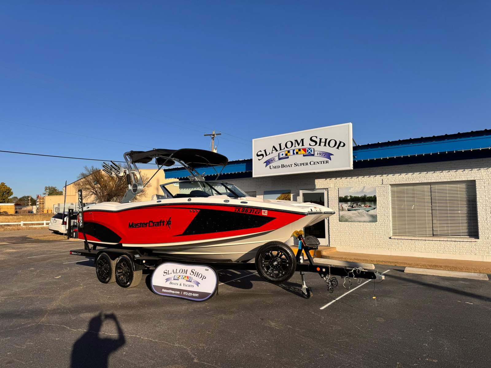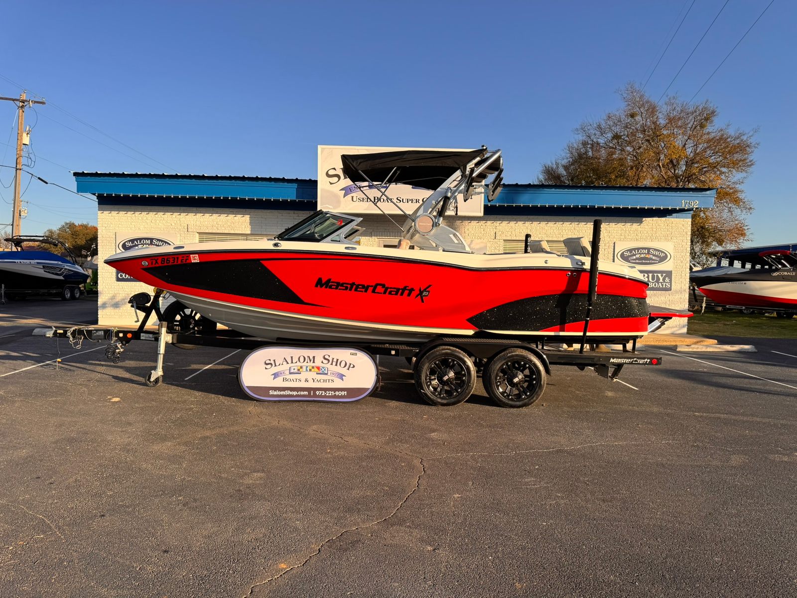 Now available on consignment at our Used Boat Super Center in Lewisville, this 2018 MasterCraft X23 is a high-performance wake and surf boat built for serious riders and luxury cruising. Finished in an eye-catching red and black metal flake gelcoat with a white and grey interior accented by red piping, this X23 is powered by the legendary Ilmor 6.2L Direct-Injected, Closed-Cooled engine producing 430 horsepower with 321 hours.