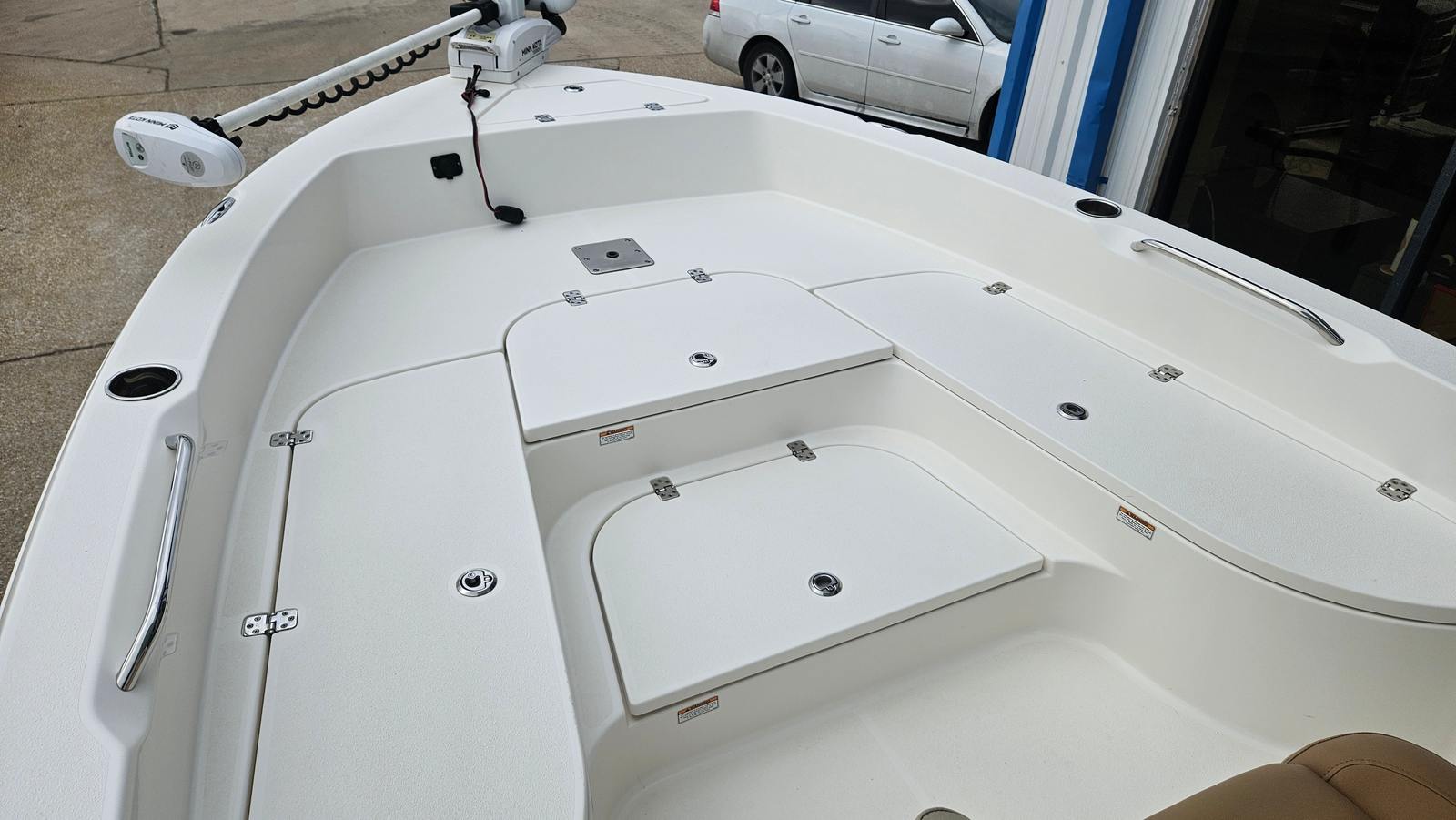 This Bay Boat is engineered for practicality and ease of ownership. The tandem axle trailer simplifies launching, hauling, and storing the boat, making it accessible for weekend getaways or spontaneous adventures. The hydraulic jackplate and trim tabs contribute to fuel efficiency and smooth handling, reducing operating costs and enhancing the overall boating experience. Storage compartments are thoughtfully integrated to keep gear organized and out of the way, allowing you to focus on enjoying your time on the water. The Minn Kota I Pilot trolling motor is a game-changer for anglers, providing hands-free operation and precise positioning for successful fishing trips.