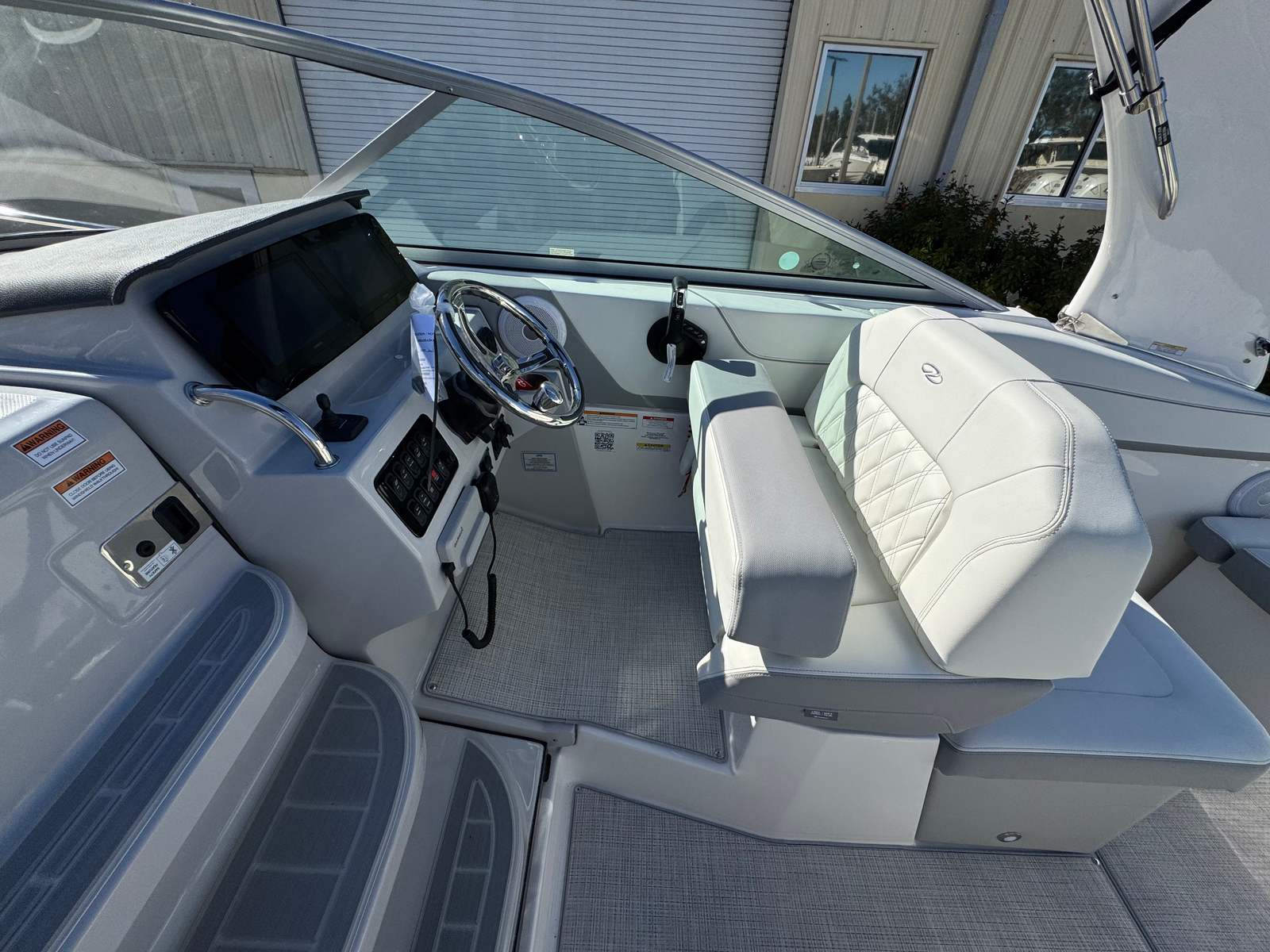 The Regal 26 XO is packed with special features that elevate your time on the water. The hull’s Tahiti Beach White color, paired with the Mediterranean Blue bootstripe and canvas, creates a striking visual appeal that turns heads at every marina. The bottom color matches the hull for a cohesive look, while the aft vent continues the elegant theme. Inside, the Titanium upholstery provides both style and comfort, making every journey a pleasure.For added convenience and protection, this cruiser comes equipped with a cockpit cover and a full enclosure, allowing you to enjoy boating in various weather conditions. The Mediterranean Blue canvas adds a touch of sophistication, while the cockpit seagrass mat enhances comfort underfoot. The Snowcap feature further accentuates the boat’s luxurious feel, ensuring that every detail is designed with your enjoyment in mind.