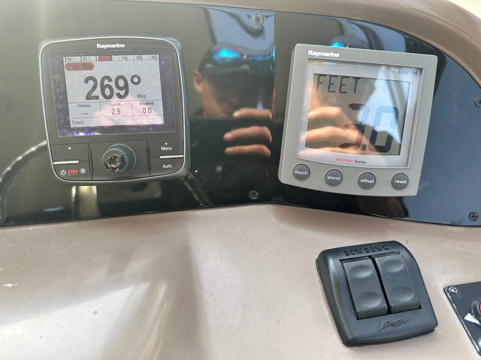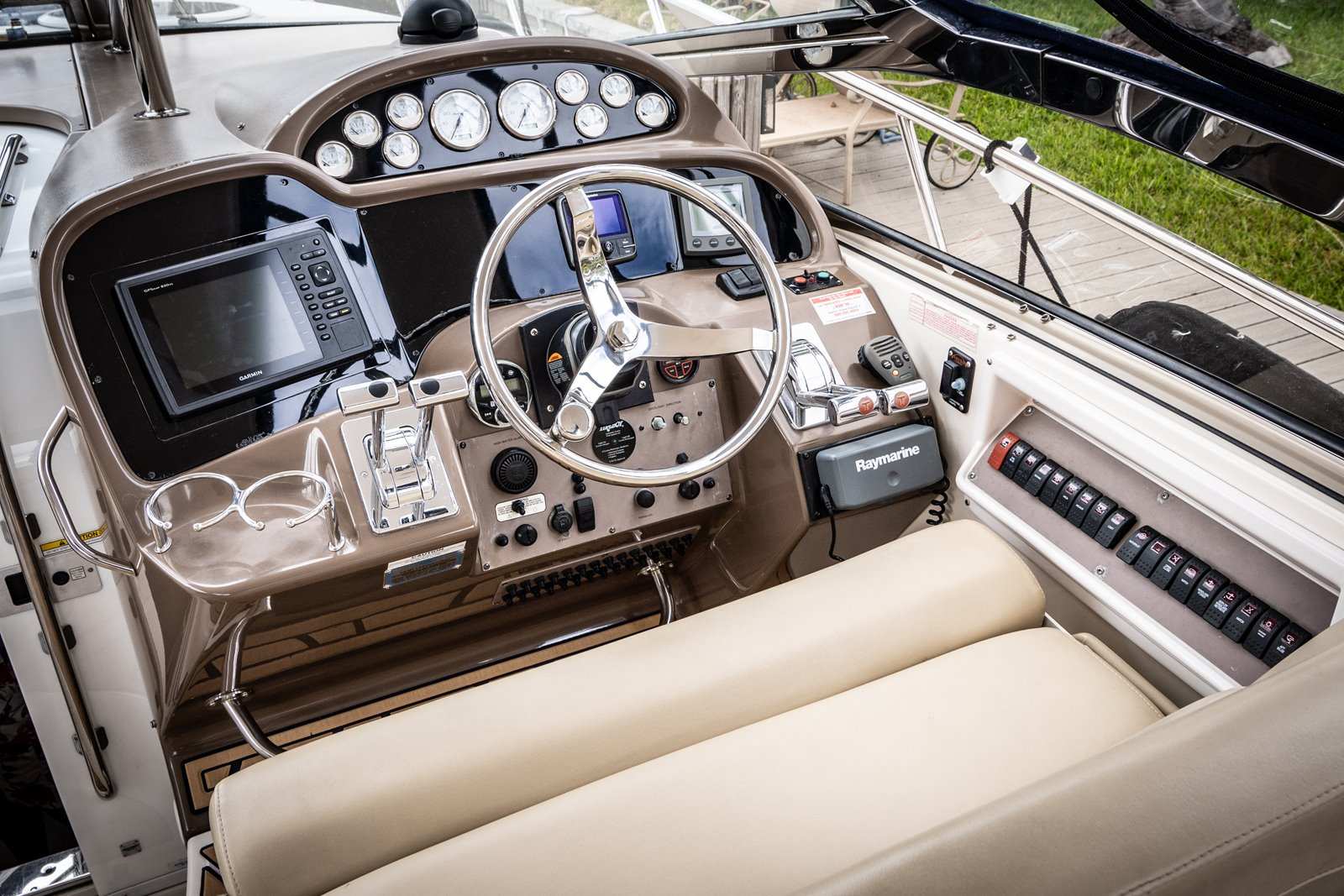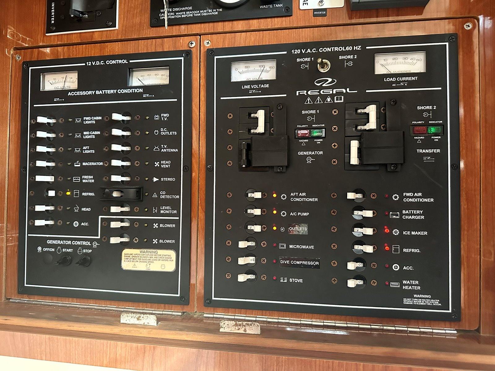 Salon • Chrome Overhead Lighting With Dimmer • Removable dinette table • Overhead Skylight Hatch With Blinds and Screen • Recliner Seating Galley • Hardwood Flooring • Corian Countertops • Stainless Steel Sink • Electric Stove (2 Burner) • Microwave • Nova Kool Refrigerator and Freezer Combo (7.5 Cubic Ft.) • 11 Gallon Waste Receptacle Forward Stateroom and Head • Inner Spring Mattress With Storage Underneath • Overhead Hatch • Two Hanging Lockers With Cedar Lining • Double-wide Sliding Privacy Door • Vacuflush Toilet • Full Fiberglass Stand-Up Head With Settee • Cultured Marble Floor • A/C Vent • Carbon Monoxide Detector Mid Cabin Stateroom and Head • Twin Beds Convert to Queen Size Berth • Overhead Vanity Cabinet • Under Mattress Storage • Full Fiberglass Head Compartment With Stand-up Shower • Vacuflush Toilet • Garmin 820xs With 8" Color Screen and HD-ID, CHIRP and DownVü with CHIRP Sonar Technology • Raymarine AutoPilot System and Depth Sounder • Raymarine VHF • Abyss Underwater Lighting • Fusion Apollo Stereo System With JL Audio and Fusion Speakers