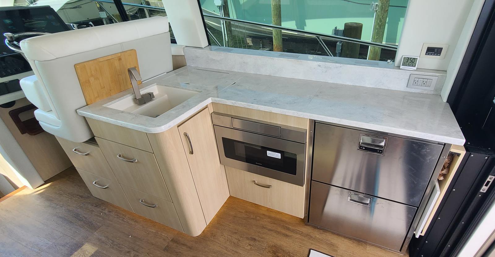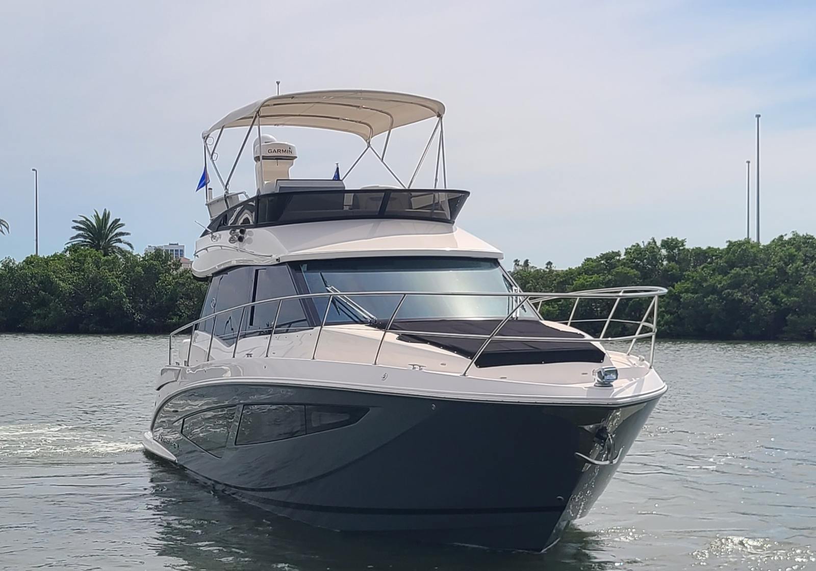 Twin Garmin 22 inch screens, VHF Radio, Radar, Auto Pilot, LED Trim Indicator, Fusion stereo system, Sat TV, Fridge freezer option, two burner stove, Washer Dryer combo, Two head stateroom configuration with one having the walk-in shower.