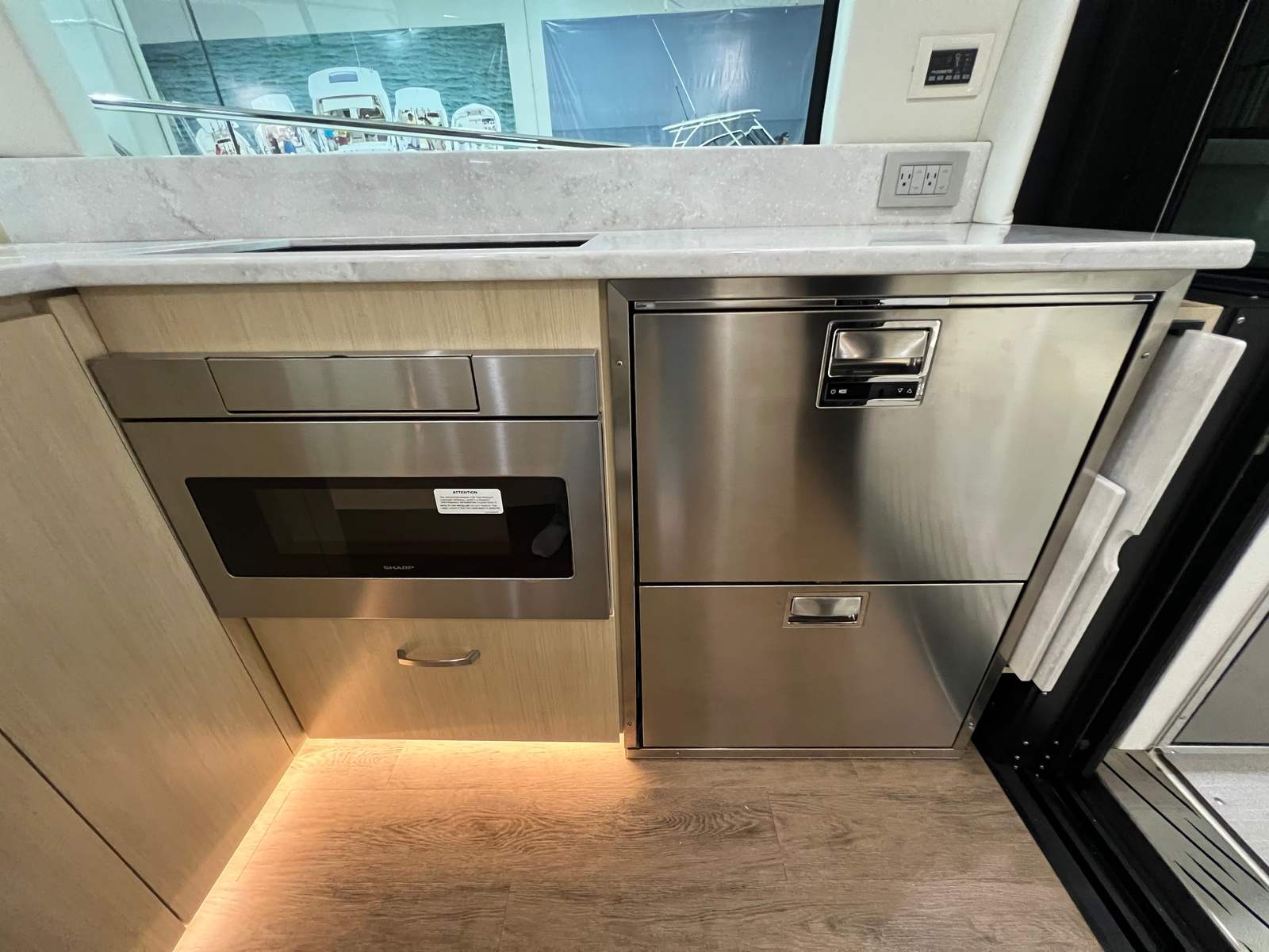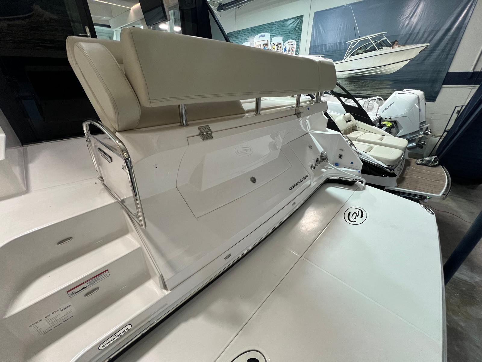 The 2024 Regal 42 Grande Coupe is a new yacht that measures an impressive 41.92 feet in length, making it ideal for those who desire ample space and sophisticated style. Regal’s reputation for quality craftsmanship is evident in every detail of this model, from its sleek hull to its thoughtfully designed cockpit. The striking black hull color, complemented by the Tahiti Beach White bootstripe and bottom color, ensures that this yacht stands out in any marina. The aft vent in Tahiti Beach White adds a touch of elegance, while the River Rock accents and Snowcap details create a refined and inviting atmosphere.
