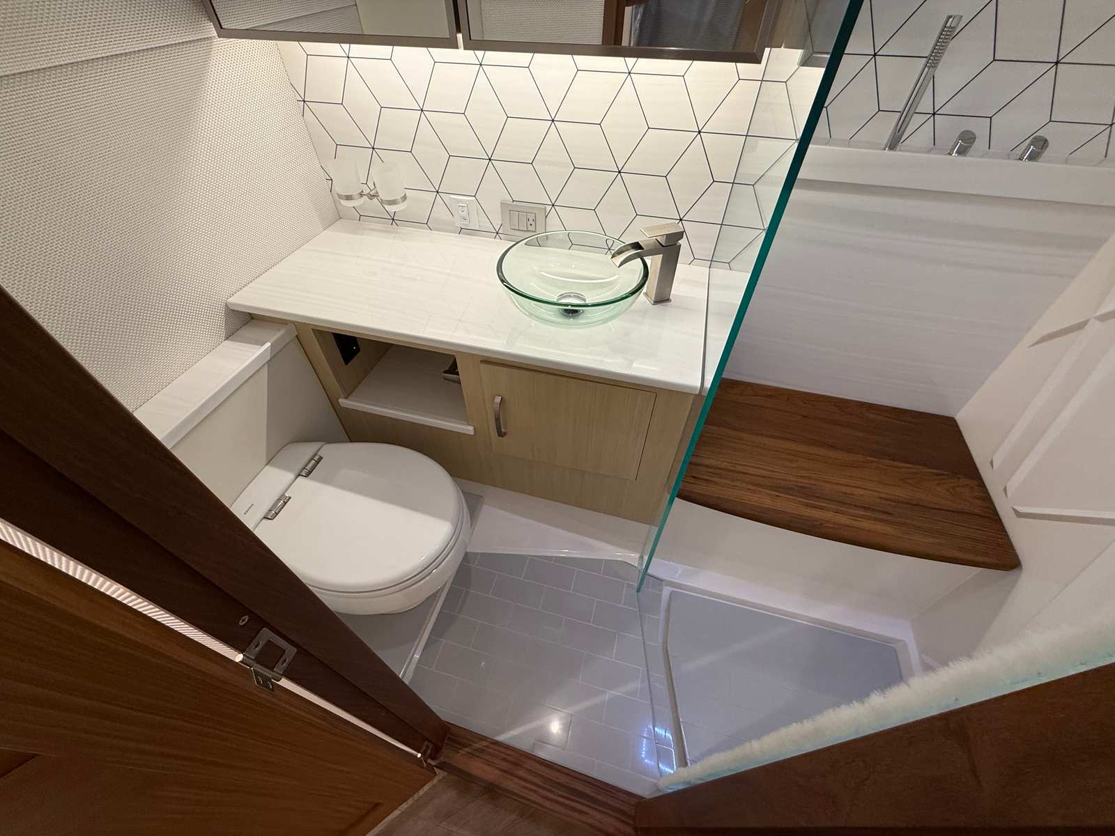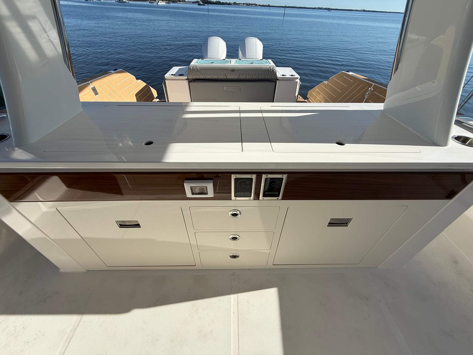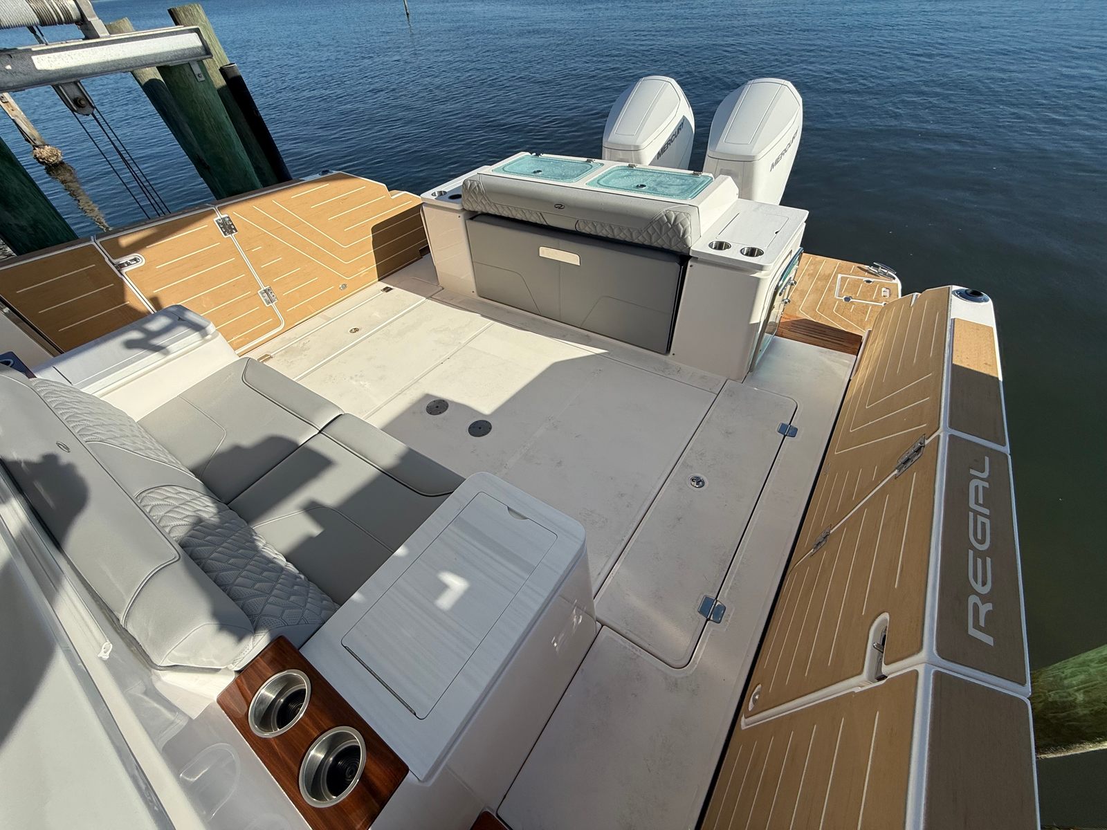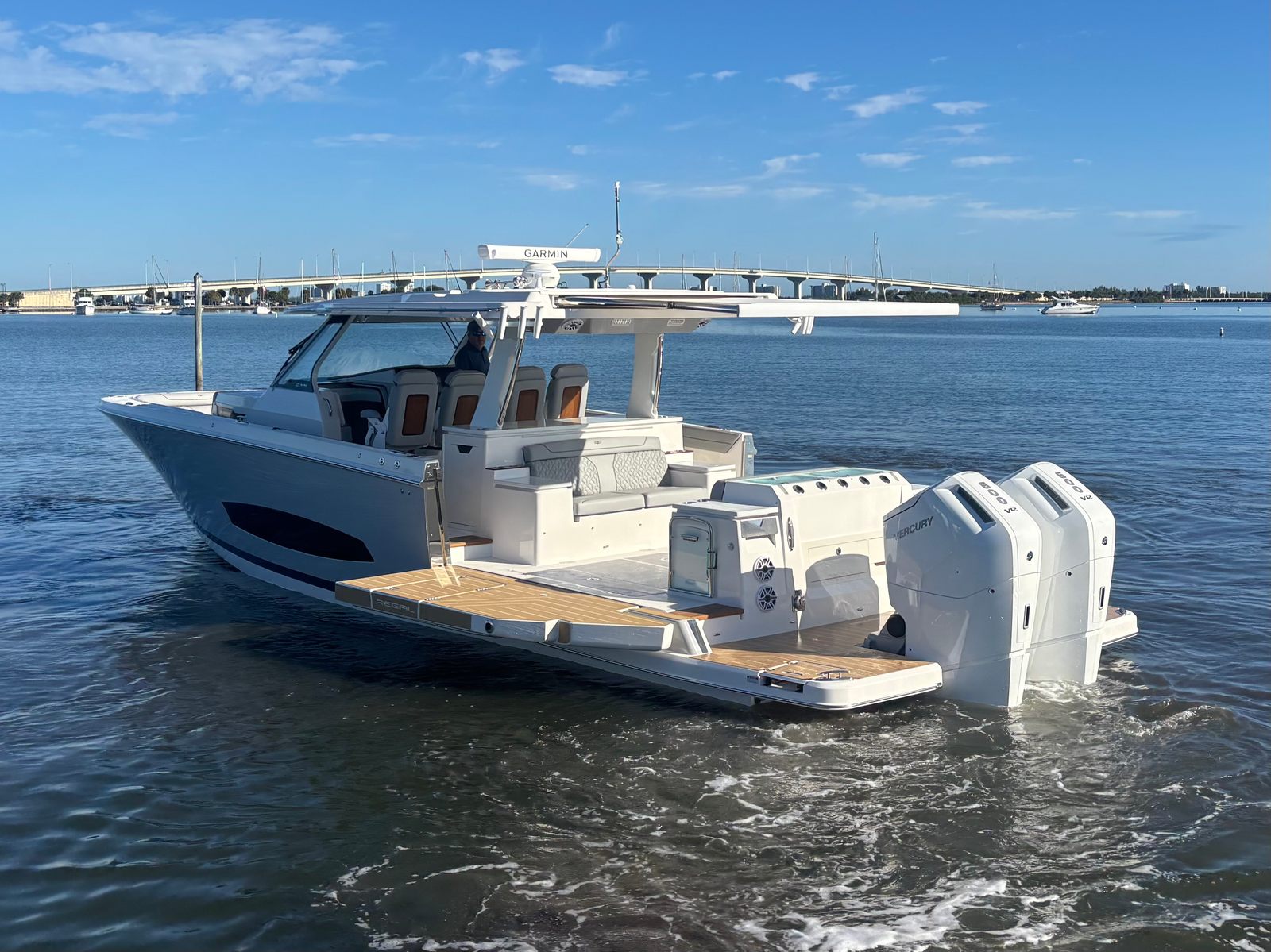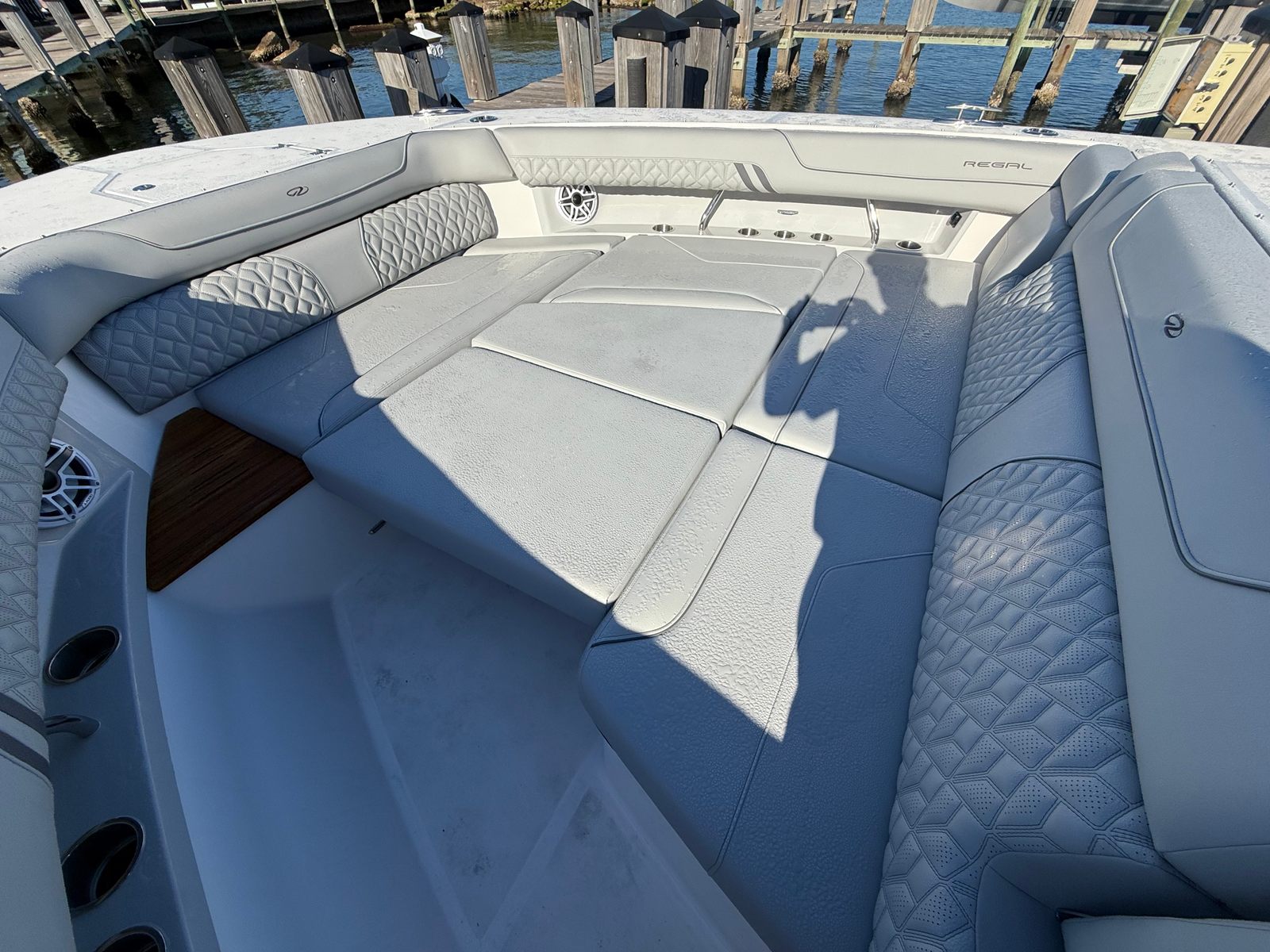 The Regal 43 SAV is loaded with special features that elevate your boating experience. The cockpit upholstery, finished in Base One - Lunar Grey with Accent Thread in Graphite Grey, creates a sophisticated and inviting atmosphere. The countertops, crafted from Strato Wind, add a touch of modern elegance to the yacht’s interior spaces. For entertainment, a cockpit television ensures you and your guests can enjoy your favorite shows or sporting events while relaxing outdoors.The synthetic teak swim platform offers both style and durability, providing a comfortable and slip-resistant surface for swimming or boarding. Teak steps add a classic touch and make moving between levels safe and easy. The yacht is equipped with a diesel generator (110V), ensuring you have reliable power for all your onboard systems, no matter where your adventures take you.For navigation and safety, the Garmin HD Open Array Radar delivers advanced situational awareness, helping you navigate with confidence in all conditions. The Snowcap feature adds a distinctive visual element, enhancing the yacht’s overall appeal. Every detail of the Regal 43 SAV is designed to provide a seamless blend of luxury, technology, and practicality.