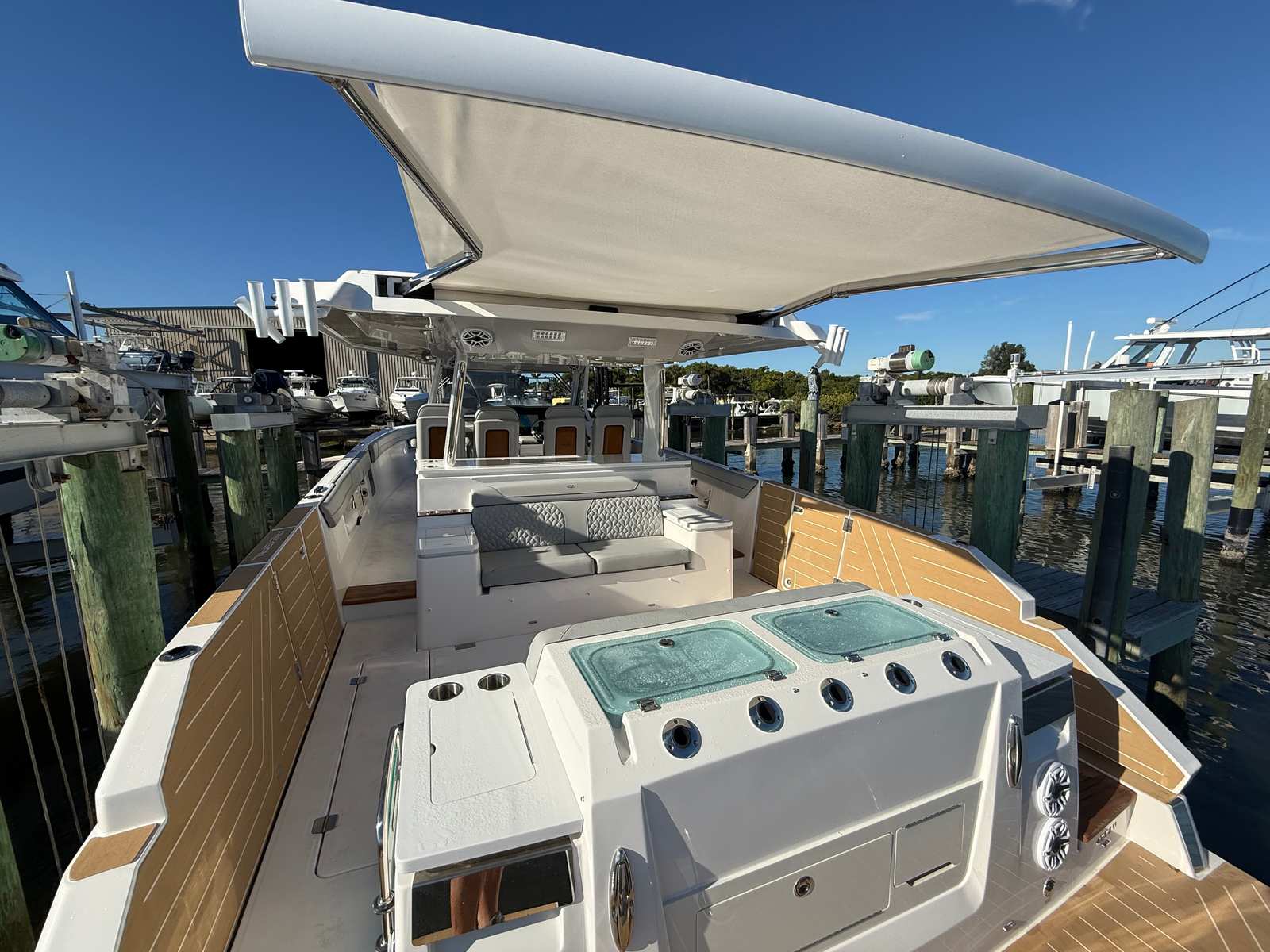 The Regal 43 SAV is designed for both fun and functionality. The synthetic teak swim platform makes water activities like swimming, snorkeling, or launching water toys easy and enjoyable. The spacious layout provides plenty of room for storing gear, supplies, and personal items, keeping the deck clutter-free and organized.Docking is simplified thanks to the bow thruster, allowing you to maneuver confidently in tight spaces. The yacht’s efficient design and powerful engines provide an excellent balance of speed and fuel economy, making it a practical choice for both short outings and longer voyages. The durable materials and thoughtful construction ensure your yacht remains in top condition, season after season.