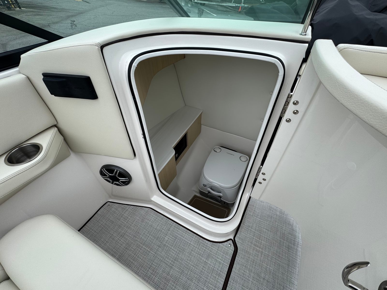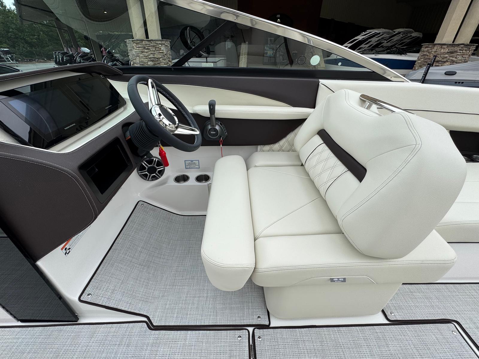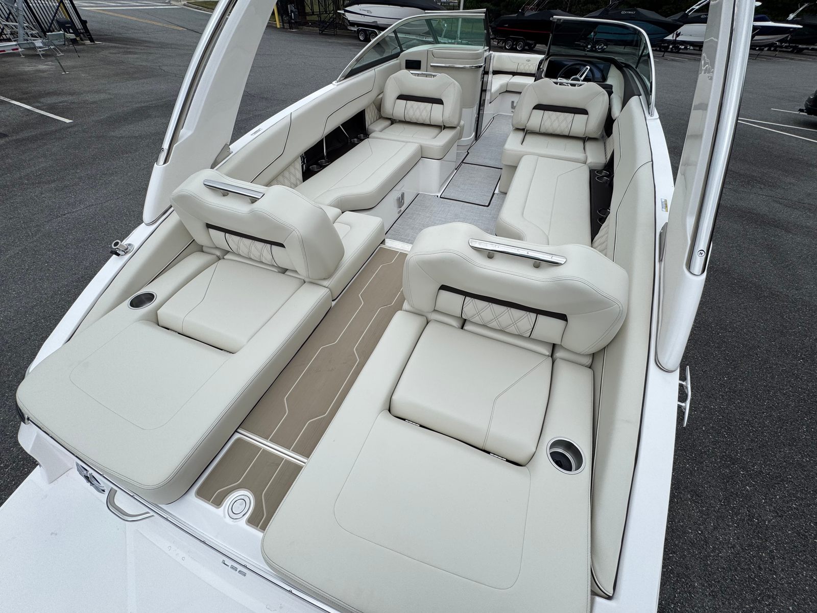The Regal LS6 Bowrider is packed with special features designed to elevate your boating experience. The elegant Cockpit Table in teak adds a touch of sophistication and provides a convenient space for dining or socializing. The PowerTower in white not only enhances the boat’s profile but also offers practical benefits for watersports and storage. Dual Battery Switch with tray and cables ensures reliable power management, while the integrated Battery Charger keeps your systems ready for action.Enjoy superior entertainment with the Stereo Performance & Lighting Package, creating the perfect atmosphere for any occasion. The LS6’s striking Tahiti Beach White and River Rock color scheme, matched with the bottom color, delivers a cohesive and stylish look. Comfort is further enhanced by the Cockpit Seagrass Mat, offering a plush and inviting surface underfoot.