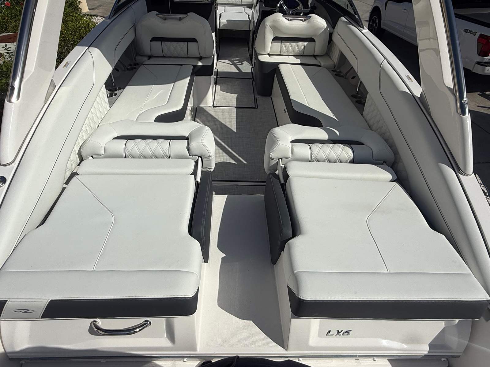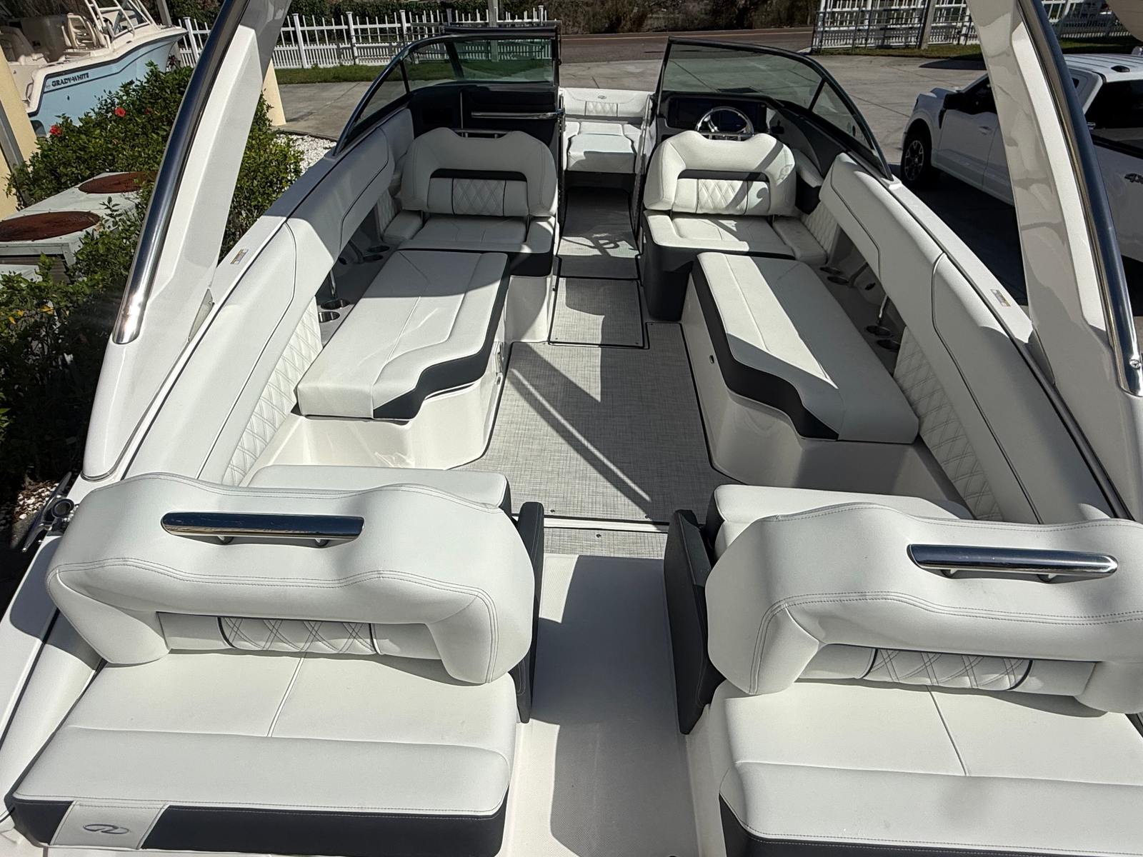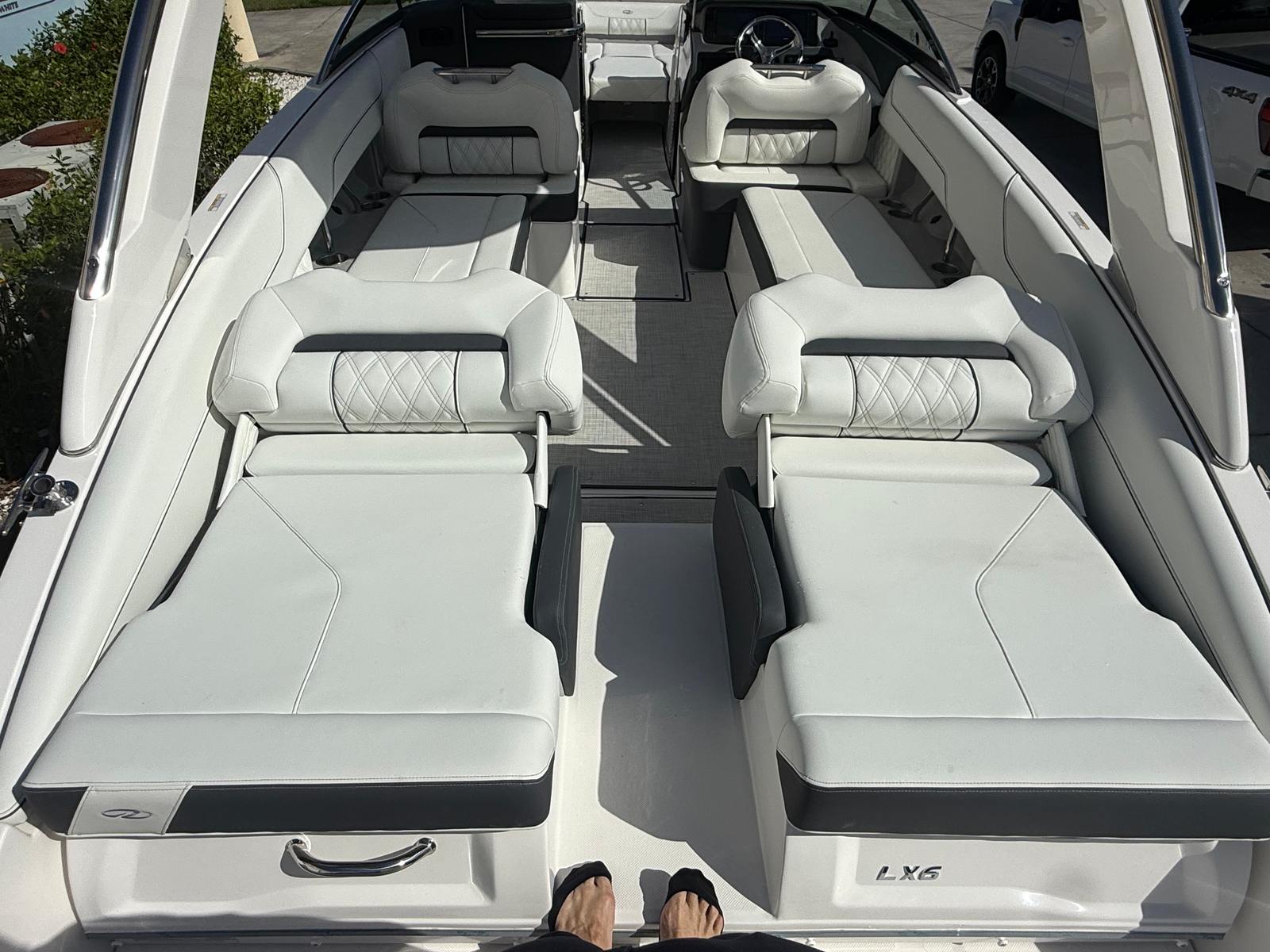 Beyond its impressive performance and luxurious features, the Regal LX6 is designed with practicality in mind. The dual battery system ensures that you have reliable power for extended outings, while the battery charger keeps everything running smoothly. The bow thruster simplifies docking and maneuvering in marinas, making it easy for boaters of all experience levels to handle the LX6 with confidence.The cockpit seagrass mat not only enhances comfort but also makes cleaning and maintenance a breeze. The bow and cockpit covers protect your investment from sun and weather, preserving the boat’s appearance and value. With the trim tabs, you can easily adjust the boat’s attitude for optimal fuel efficiency and ride comfort, ensuring that every trip is as enjoyable as possible.