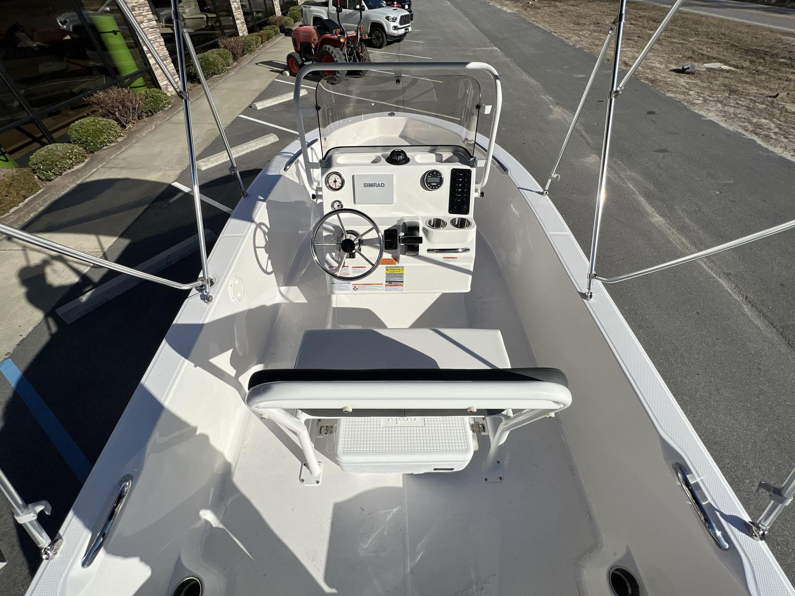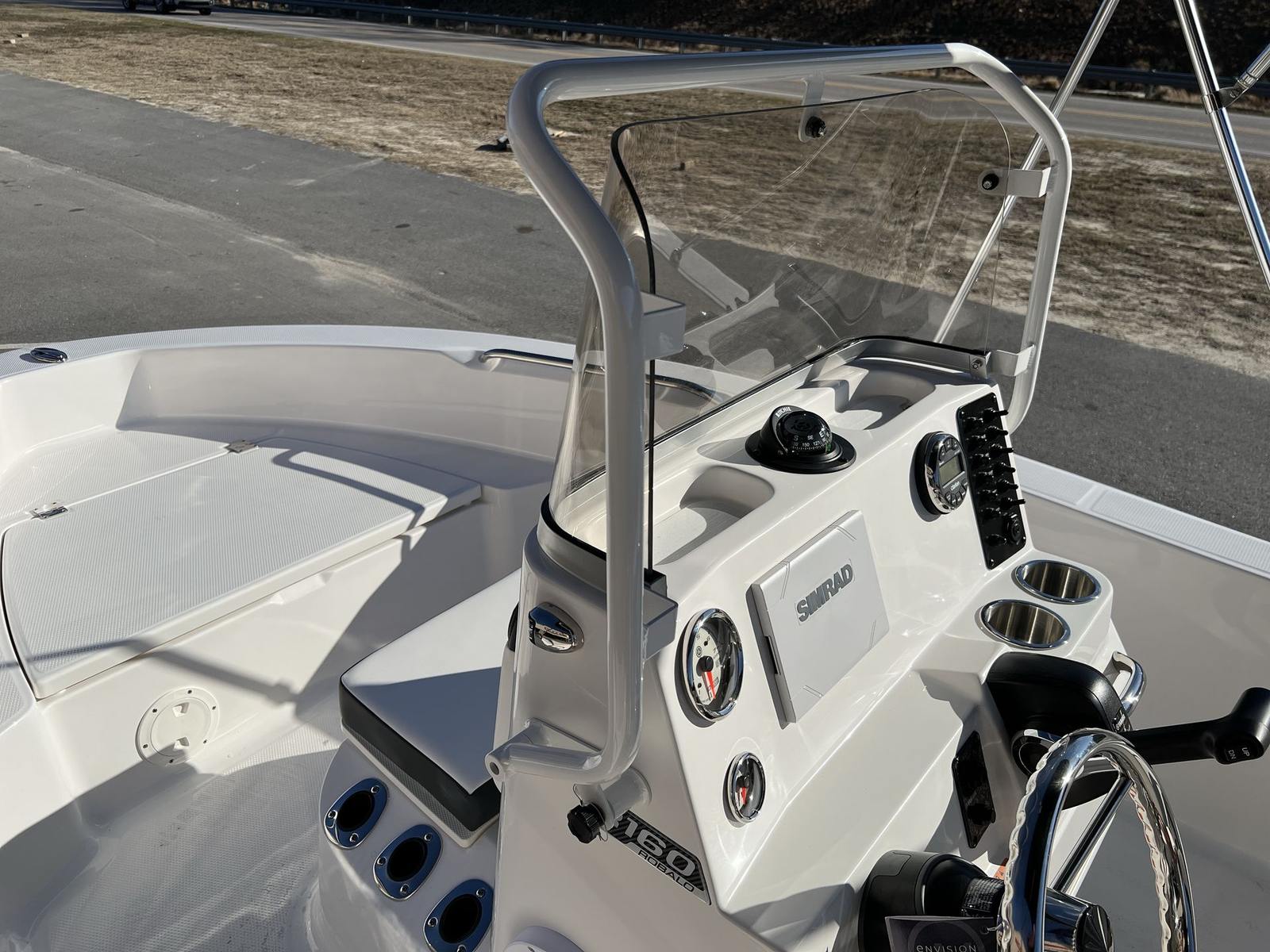 Practicality is at the core of the Robalo 160 CC’s design. Its manageable length makes docking and storage a breeze, whether you’re keeping it at a marina or trailering it to your favorite launch site. The efficient Yamaha Four Stroke engine helps keep fuel costs low, allowing you to spend more time on the water and less time at the pump. The fold-down console windshield and grab rail offer added convenience when navigating tight spaces or transporting the boat.The Bimini Top provides essential protection from the elements, making it easy to enjoy longer days on the water without worrying about sun exposure. The Simrad GO7 Touch Multifunction Chartplotter/Fishfinder streamlines navigation and fish-finding, helping you make the most of every trip. Stainless steel rod holders keep your gear organized and accessible, while the ergonomic cockpit layout ensures everything you need is within reach.