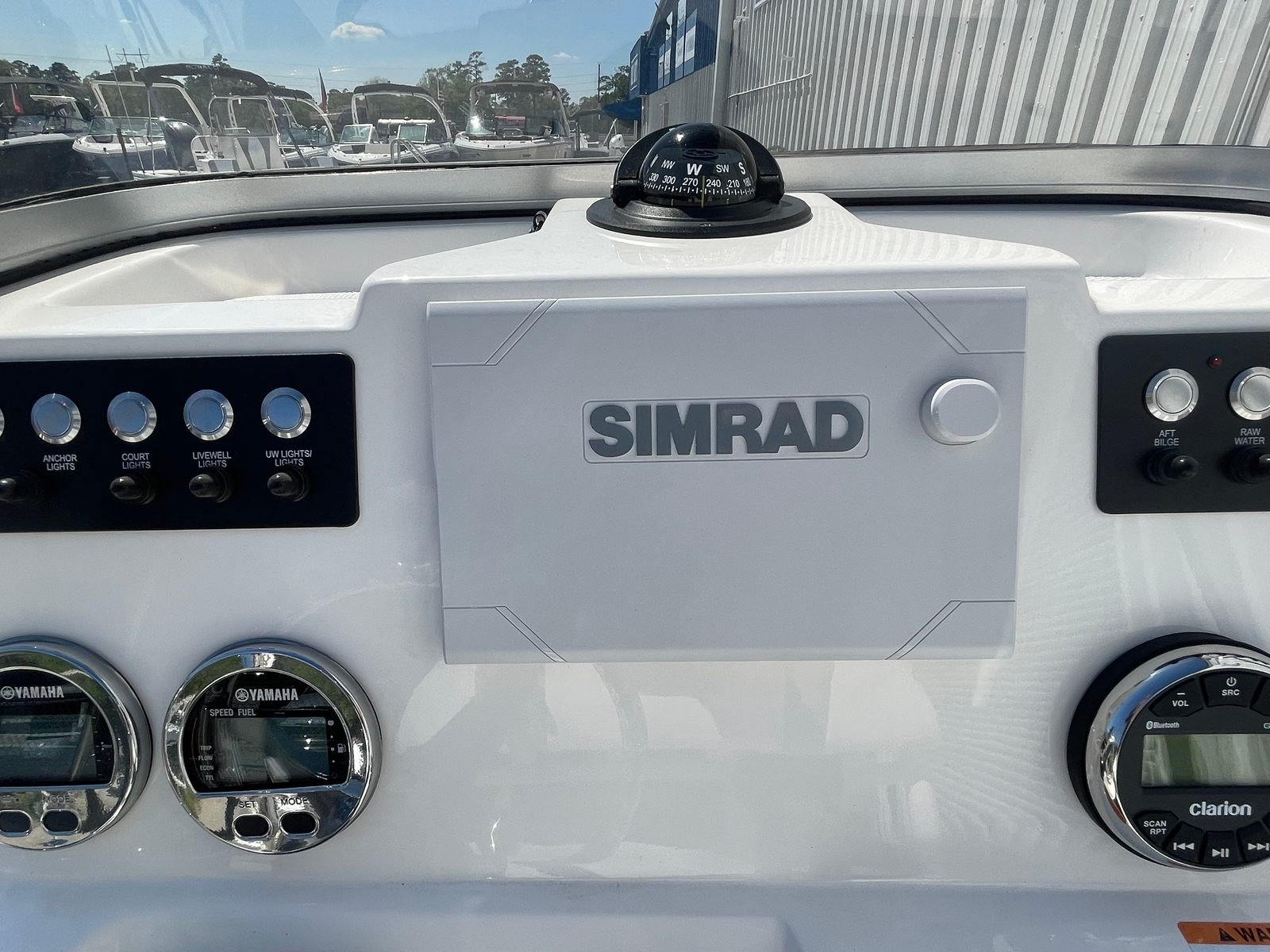 Equipped with a dual battery system, the Robalo 206 Cayman DLX ensures that all your electrical needs are met without compromise. The Simrad NSS7 EVO3 Chartplotter/Multifunction display provides advanced navigation and monitoring capabilities, allowing you to stay on course and keep track of your boat's performance with ease. The Seadek helm mat offers a comfortable and non-slip surface, while the fold-down console windshield and grab rail enhance accessibility and safety. Additionally, the white powder-coated leaning post adds a touch of elegance and functionality to the overall design.