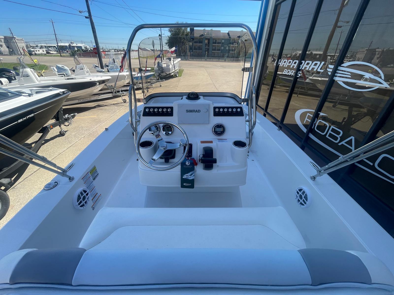 This bay boat comes loaded with premium features designed to enhance comfort, convenience, and functionality. The Bimini Top with Boot offers essential shade on sunny days, allowing you and your guests to relax in comfort. The cockpit interior, finished in Harbor Ice Blue, not only looks fantastic but also provides a cool and inviting atmosphere. Navigation and fish-finding are made effortless with the Simrad NSS7 EVO3 Chartplotter/Multifunction display, giving you access to advanced mapping and real-time data at your fingertips.The Seadek Helm Mat ensures a comfortable and slip-resistant surface at the helm, while the black canvas color adds a touch of sophistication to the overall design. The white powder-coated leaning post provides sturdy support and a modern aesthetic, making long days on the water more enjoyable. For those who value ease of transport and storage, the trailer upgrade features an aluminum tandem axle, galvanized wheels, and side guides, ensuring your Robalo boat for sale is always ready for the next adventure.Additional highlights include the fold-down console windshield and grab rail, which offer protection from the elements and added safety, and the hull side gelcoat in Ice Blue, which not only enhances the boat’s appearance but also adds a layer of durability.