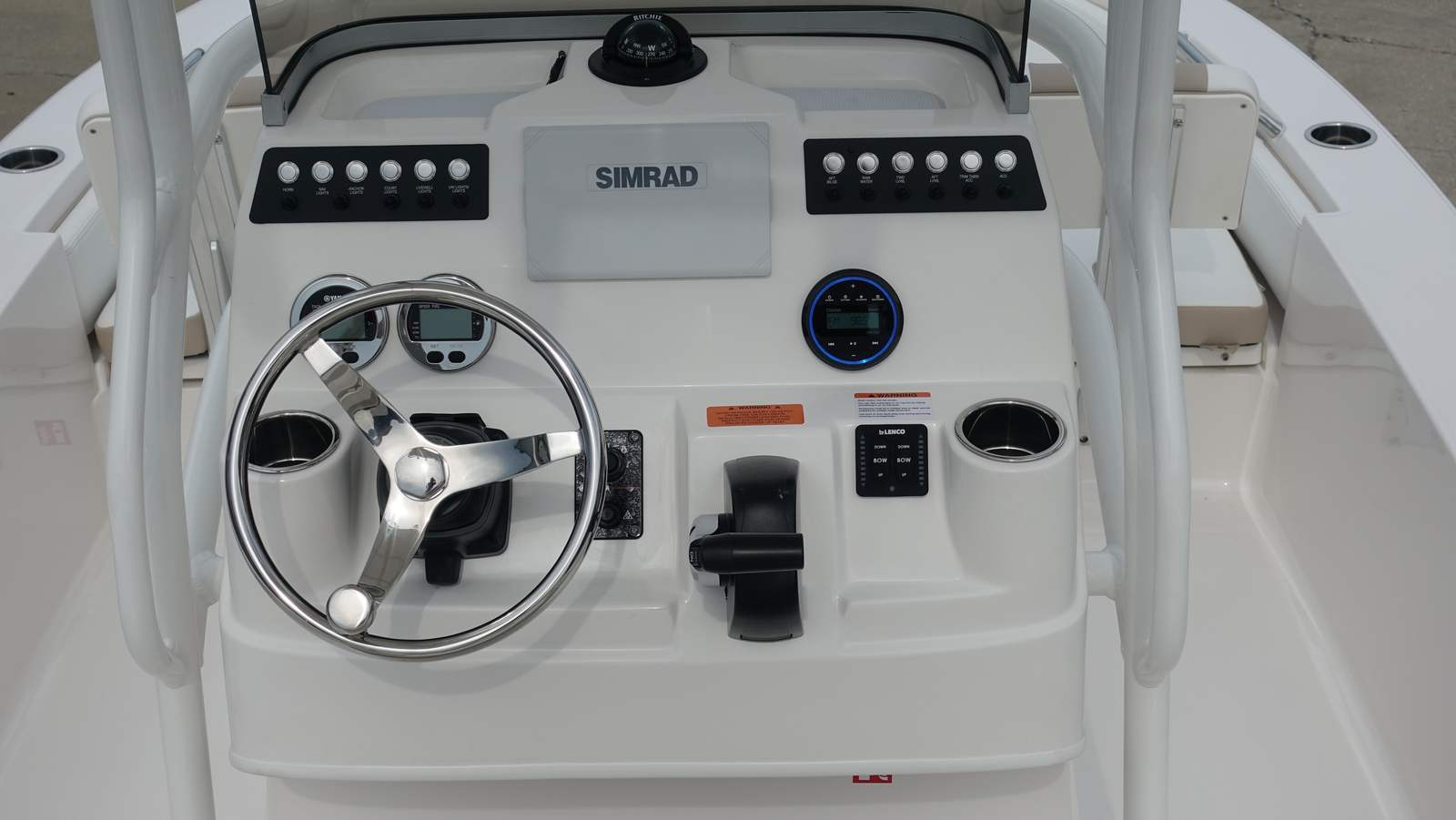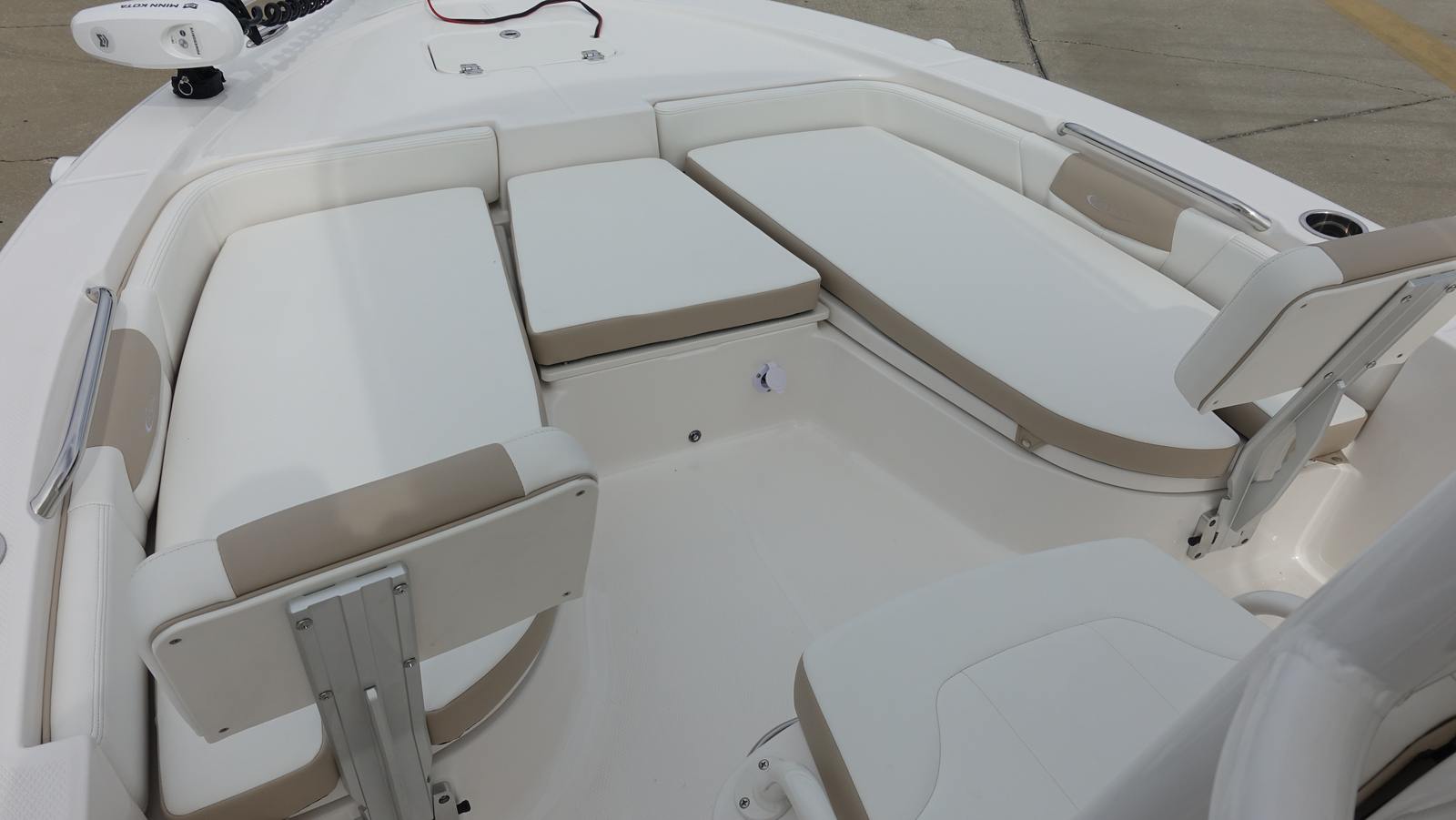 The Robalo 206 Cayman is loaded with special features designed to enhance your boating experience. The white canvas color adds a touch of elegance, while the Ice Blue hull side gelcoat ensures you stand out wherever you go. Enjoy peace of mind with the 5 Year Premium Level Limited Component Warranty, offering exceptional protection and value for your investment.Fishing enthusiasts will appreciate the Minn Kota Riptide trolling motor with dual bank charger, boasting 24V power, 70lb thrust, and a 54" shaft, all controlled by a convenient wireless remote. This setup allows for stealthy approaches and precise positioning, making it easier to land your catch. The removable bow seating backrest adds versatility, providing comfort when cruising and extra space when fishing.Trim tabs with indicators offer enhanced stability and control, letting you adjust your ride for optimal performance in varying conditions. The starboard dive swim platform with boarding ladder makes water access safe and easy, perfect for swimming, snorkeling, or simply cooling off on a hot day. The custom anchor ensures secure mooring, while the T-Top with white powder-coated aluminum and four rod holders provides shade and ample storage for your fishing gear.