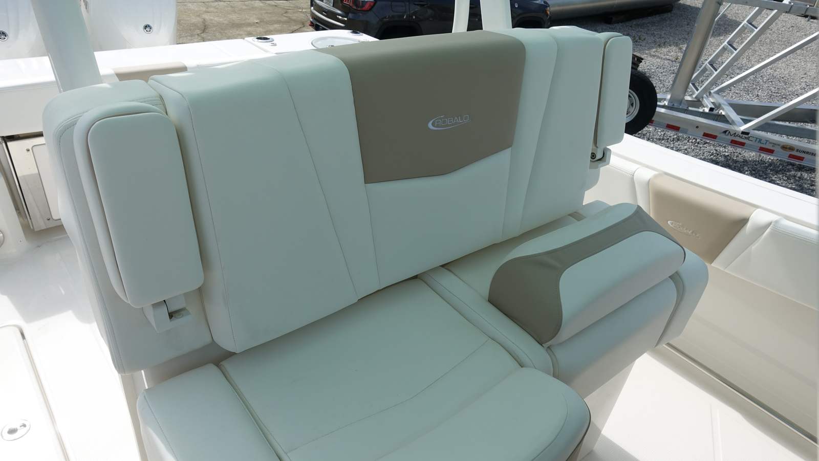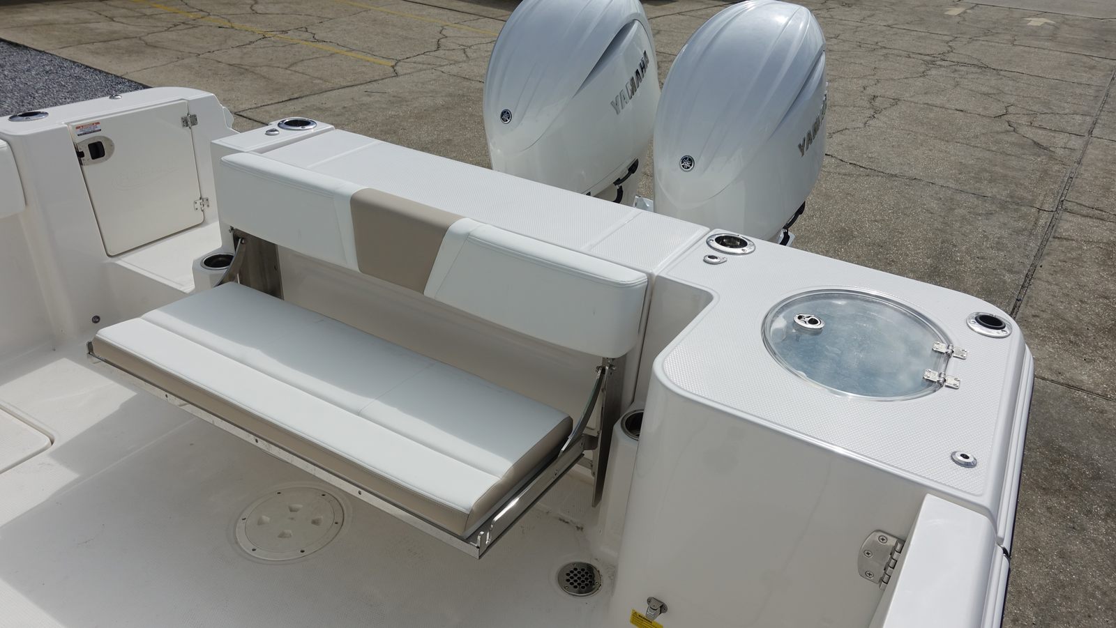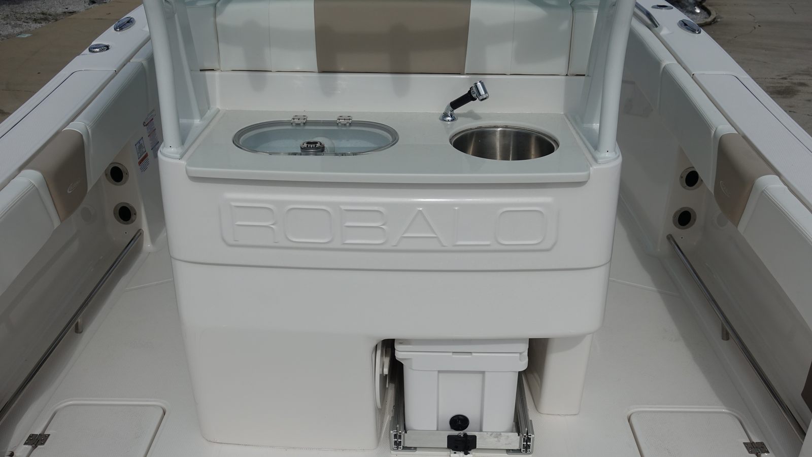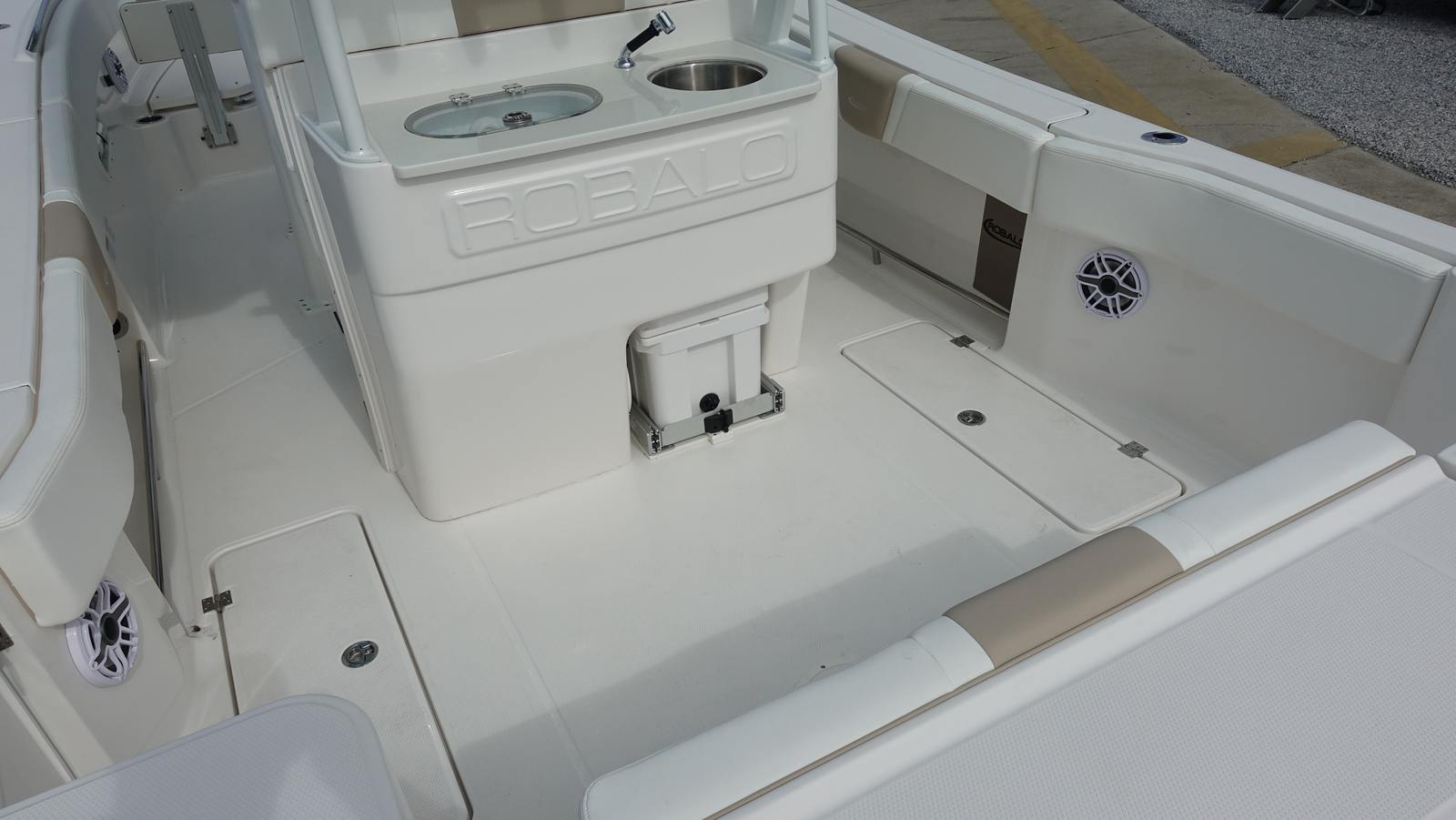Powering the Robalo 270 CC are twin Yamaha F200XSA2 engines, each delivering 200 horsepower for a combined total of 400 horsepower. These white engines feature electro hydraulic steering, offering precise control and effortless maneuverability. Whether you’re navigating tight marinas or heading out to deeper waters, the robust engine setup ensures a smooth, responsive ride. The dual engine configuration also provides added reliability and peace of mind, making this Robalo boat for sale a smart choice for those who demand top-tier performance.