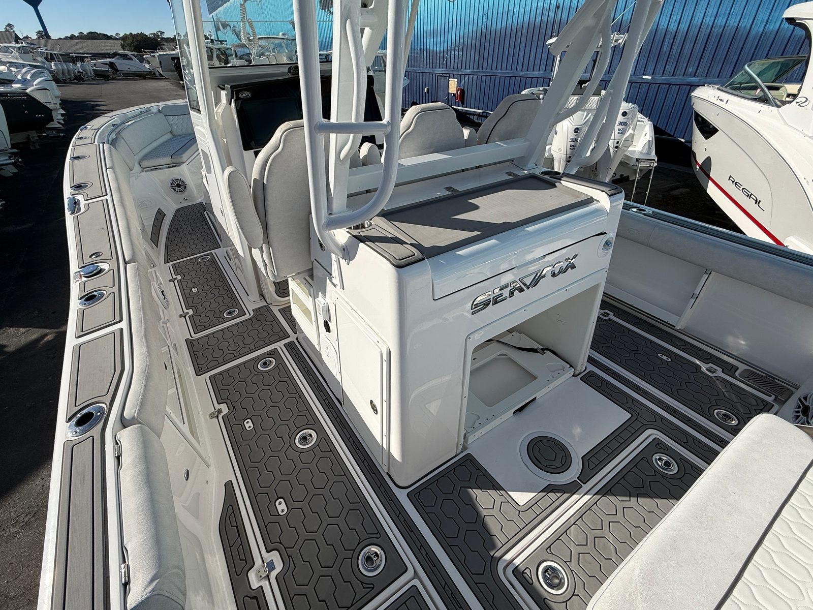 Under the hood, the Sea Fox 328 Commander is powered by twin engines, delivering a combined 850 horsepower. This impressive power setup ensures that you have the speed and agility needed for a variety of activities, from high-speed runs to leisurely cruises. The dual-engine configuration not only enhances performance but also provides added reliability and peace of mind when venturing farther from shore. Whether you are chasing the horizon or navigating tight marinas, the responsive handling and robust acceleration of this center console boat make every outing a memorable experience.
