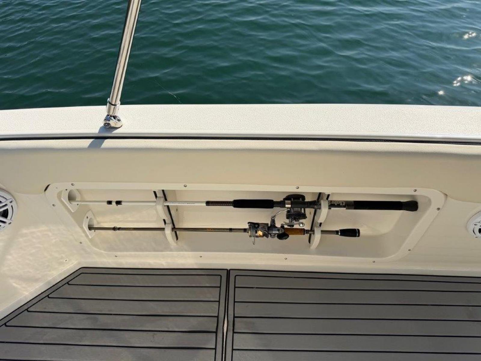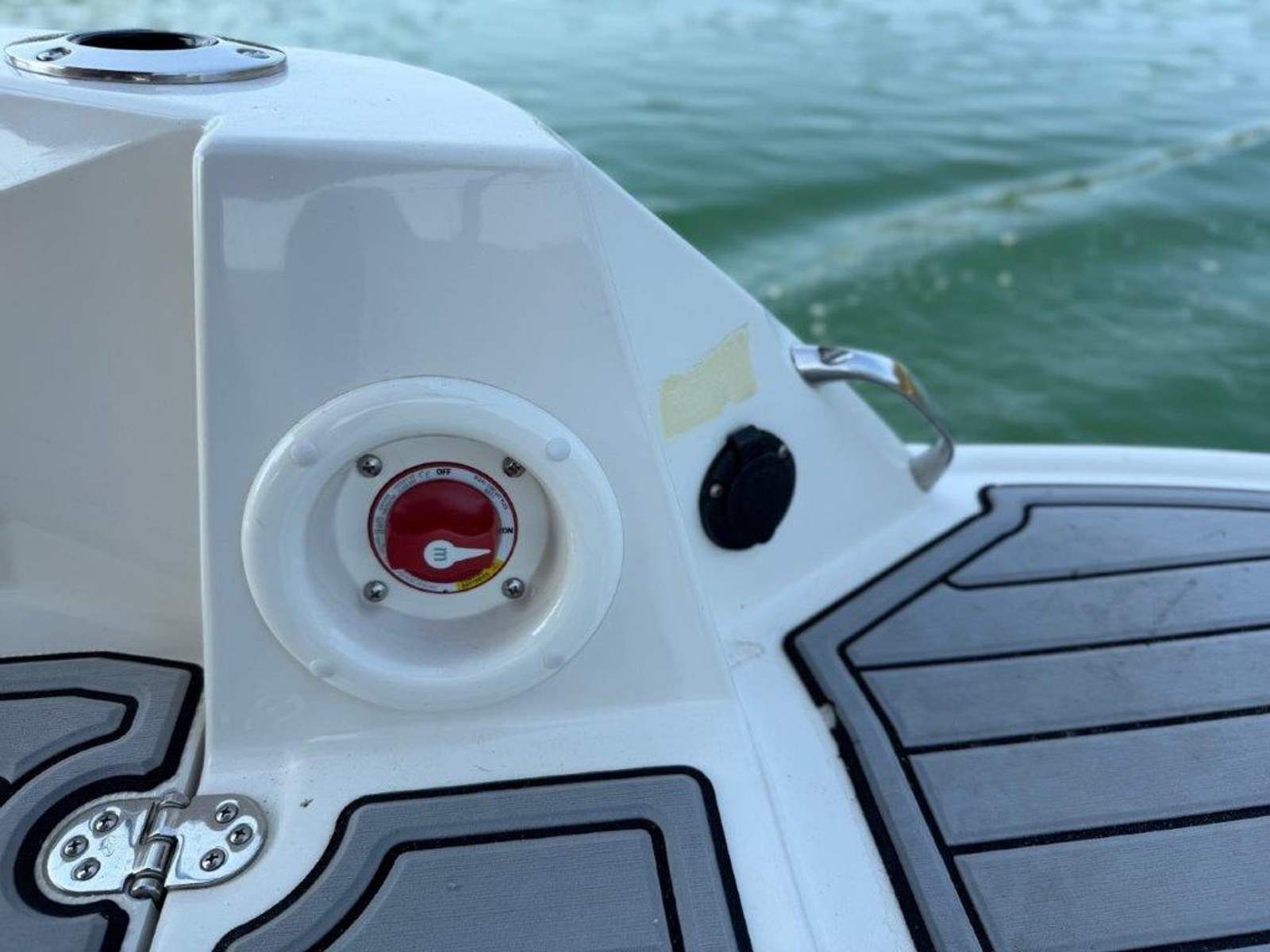 Additional highlights include a self-bailing cockpit, bow seating with cushions, stainless pop-up cleats, raw water washdown, underwater lights, blue LED accent lighting, swim platform, ski tow bar, and a large helm storage compartment that includes a porta potti/changing space. Smart storage is built into the design so the deck stays clean and uncluttered even on longer days out.